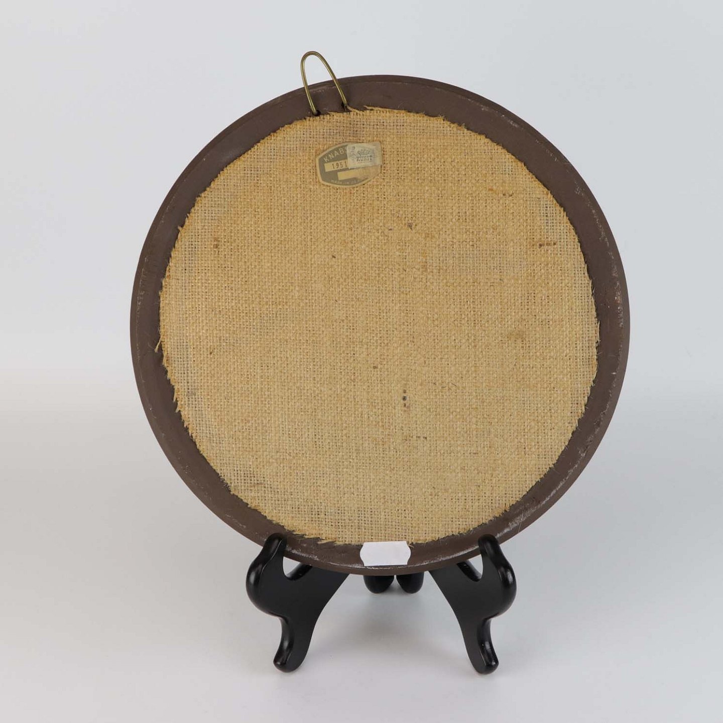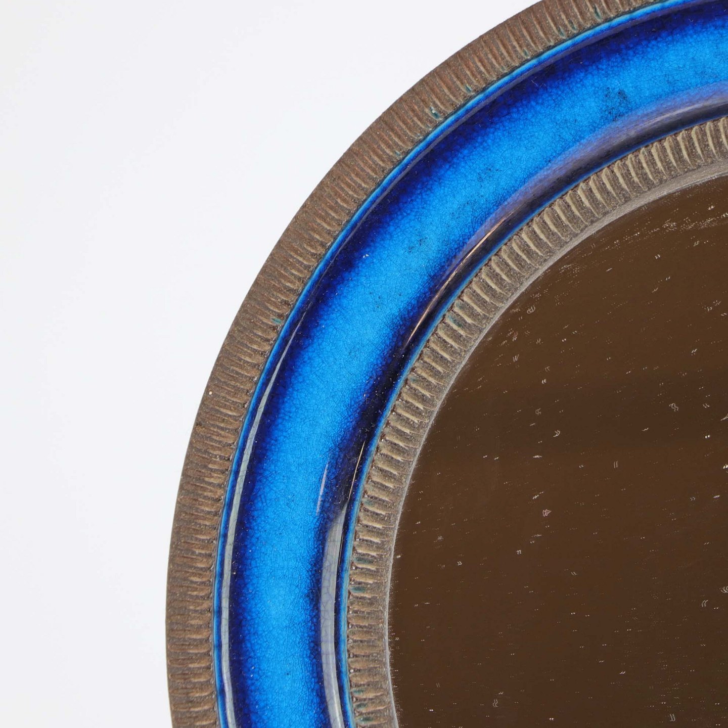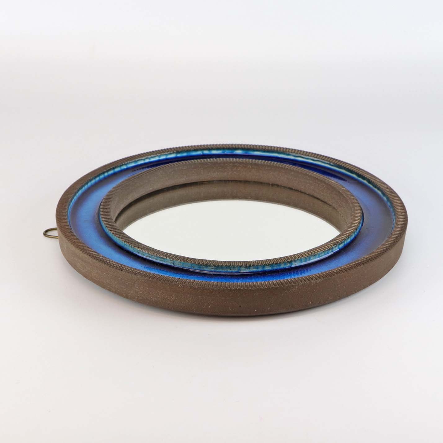 Rundt spejl i ramme af brun keramik. Rammen er dekoreret med en blå stribe og et mønster af riller. Nr 1951