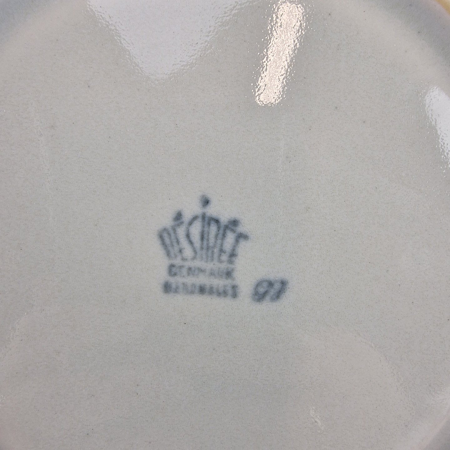 Diskos er af ovnfast stentøj. Stellet er gråt og håndmalet med brune og grønlige detaljer