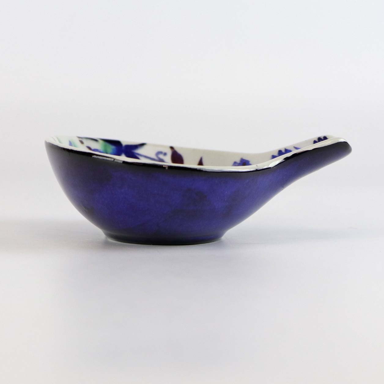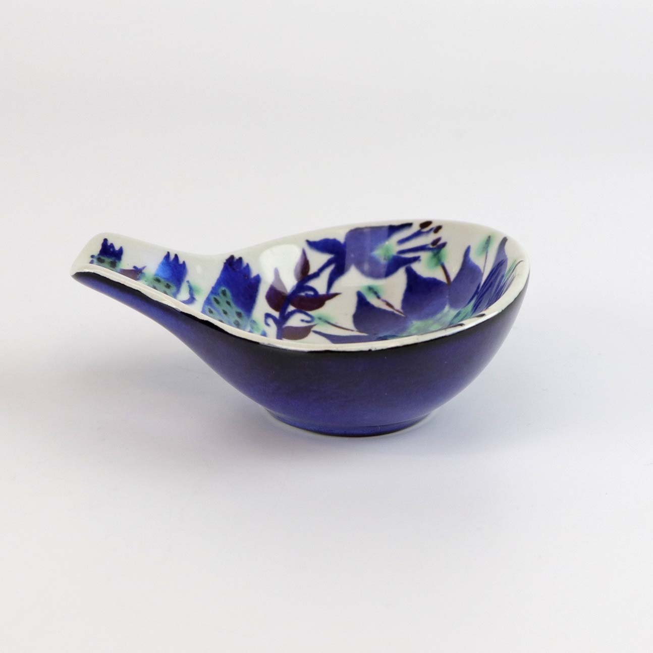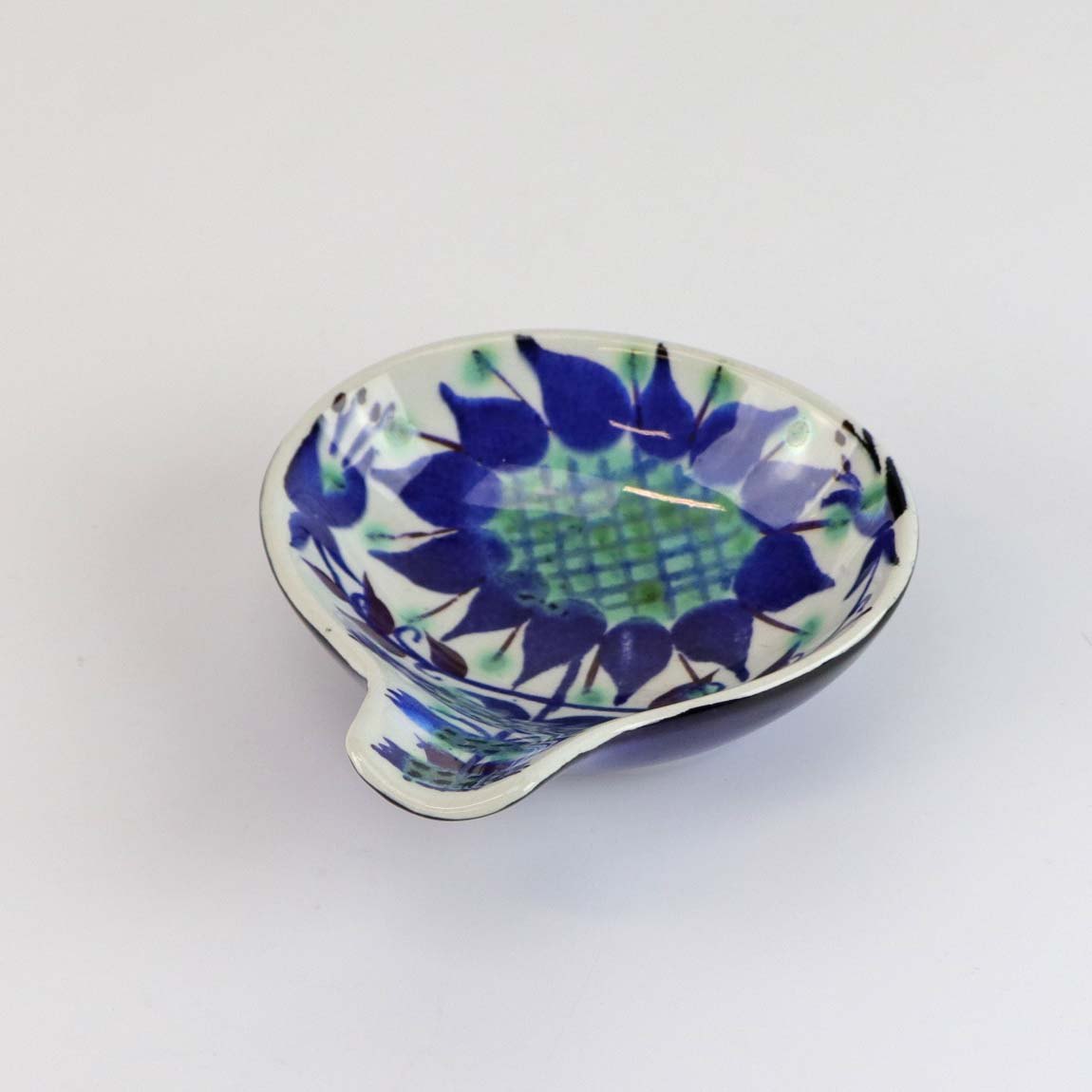 Tenera lille skål med hank i fajance nr 145/2898 med blomstermønster i blå, grønne og røde farver