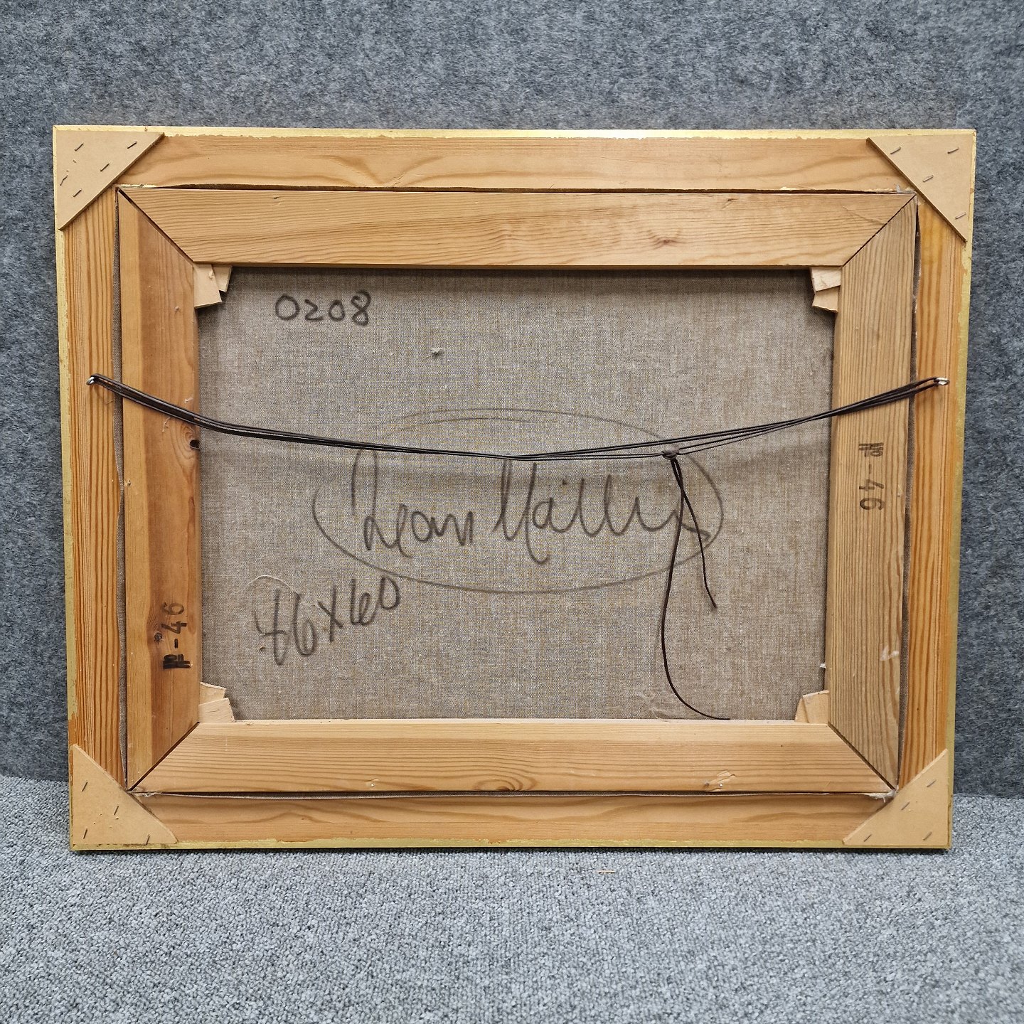 Oliemaleri på lærred. Landskabsmaleri med motiv af huse med havet som baggrund. Nr. 0208 Parti fra Færøerne