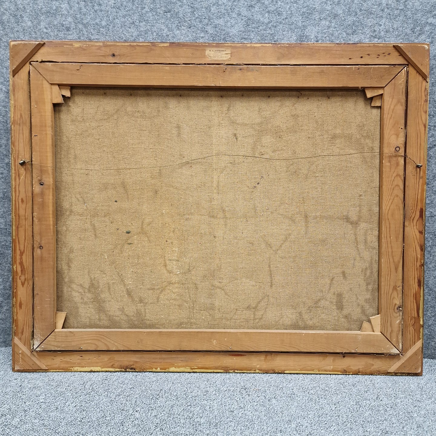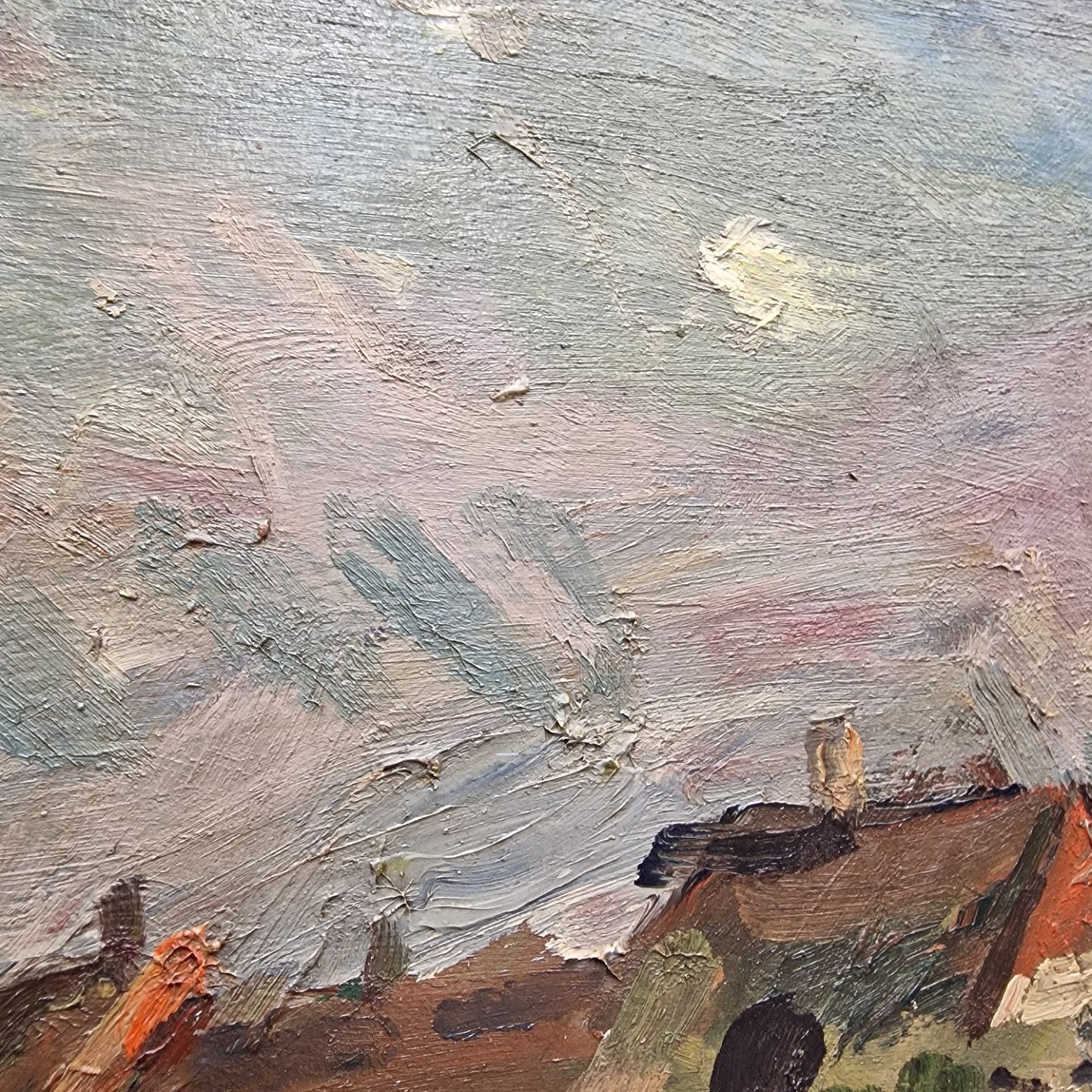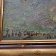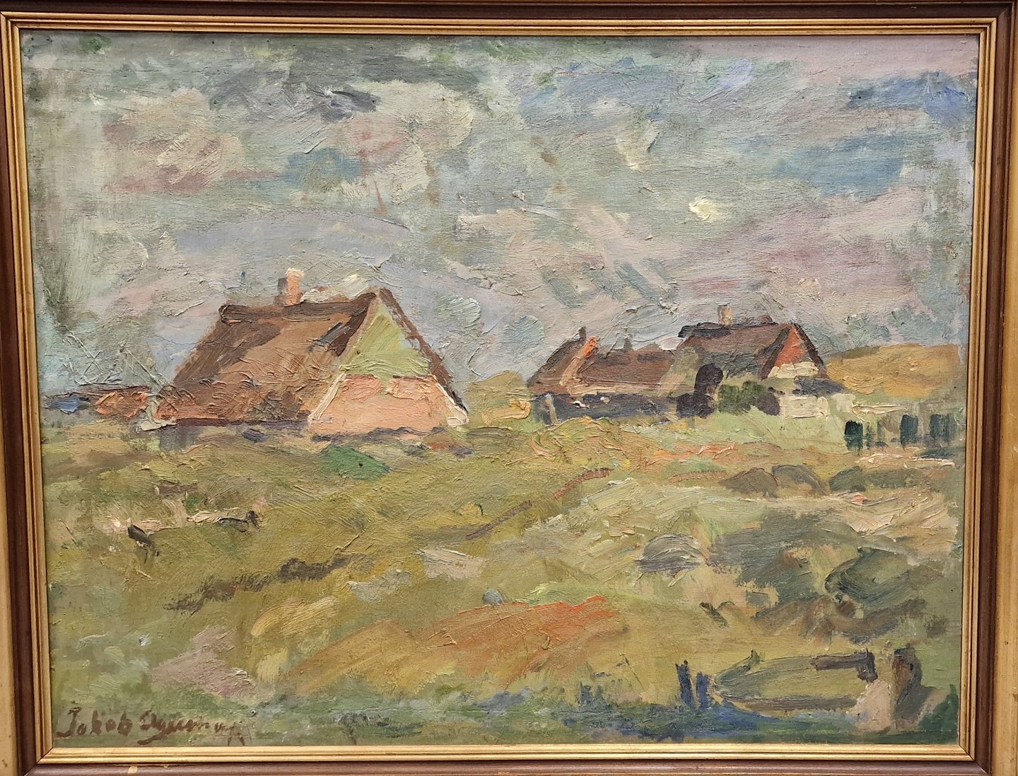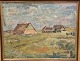 Oliemaleri på lærred. Landskabsmaleri med motiv af huse i naturen
