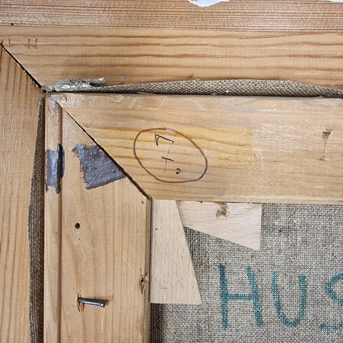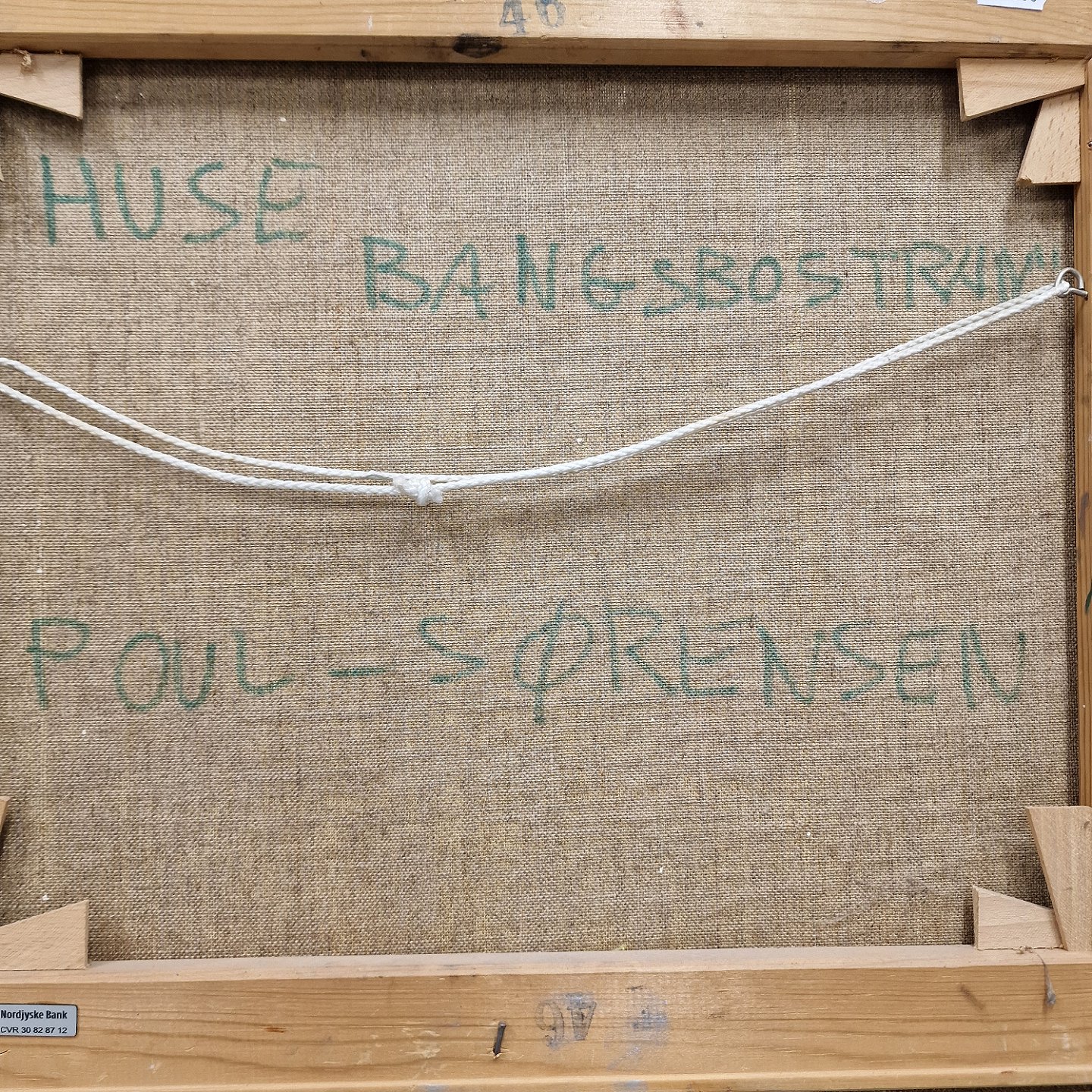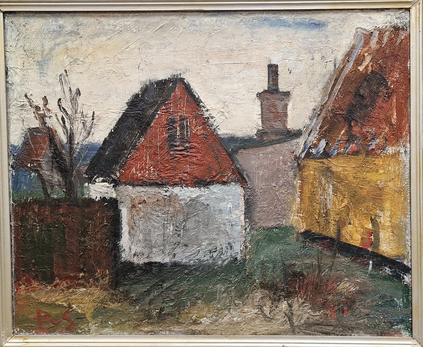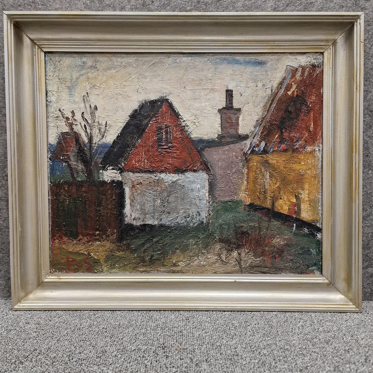 Oliemaleri på plade. Landsbybillede med motiv af huse med titlen Huse på Bangsbostrand, Frederikshavn