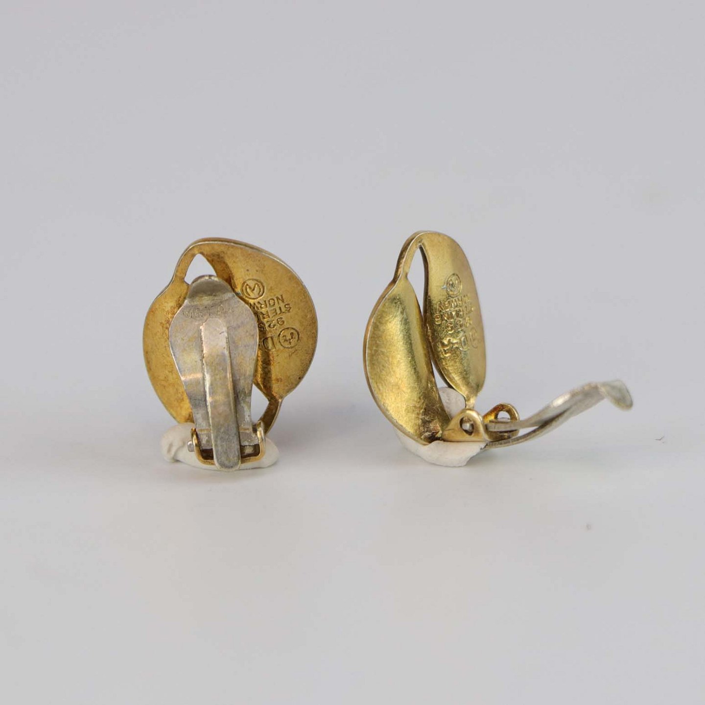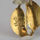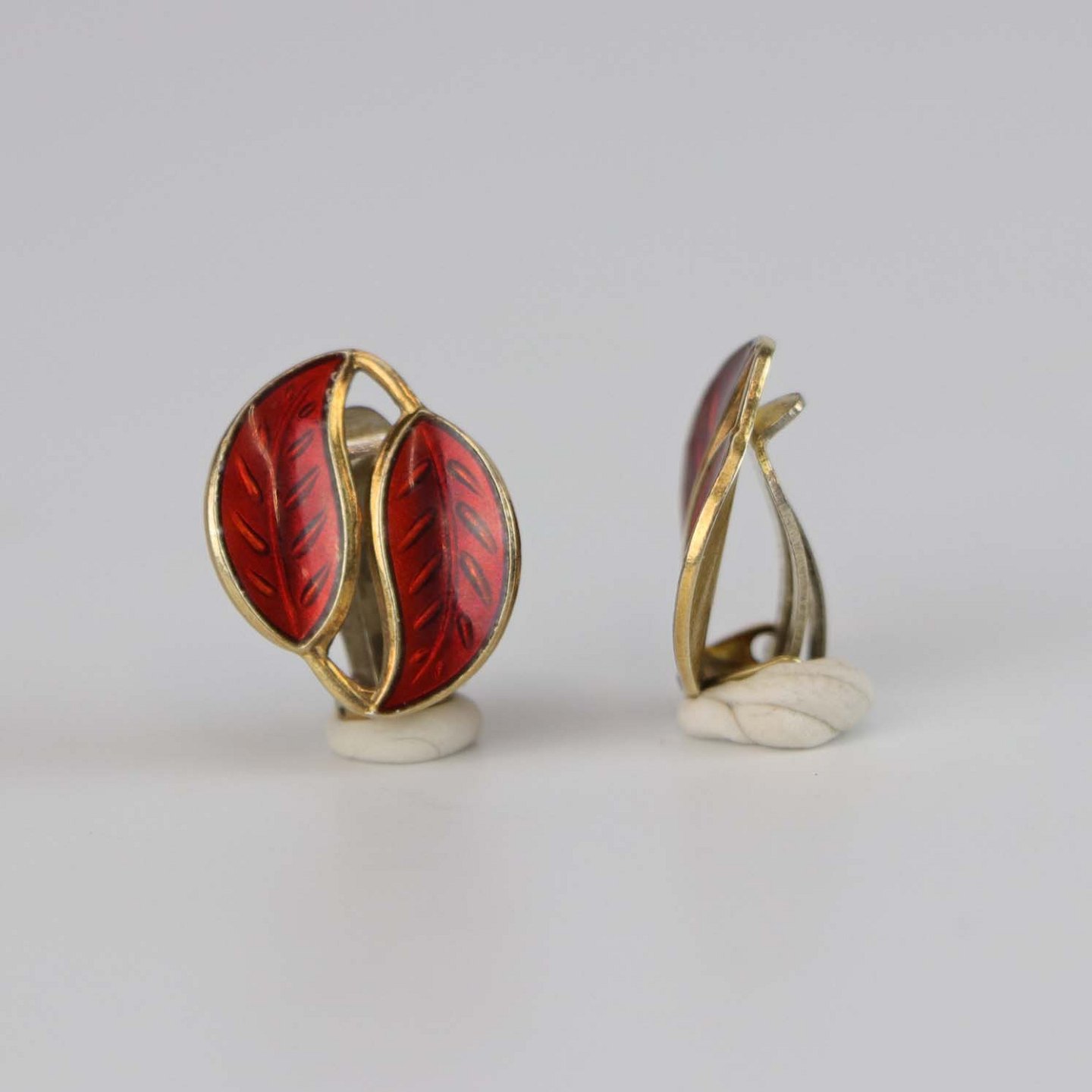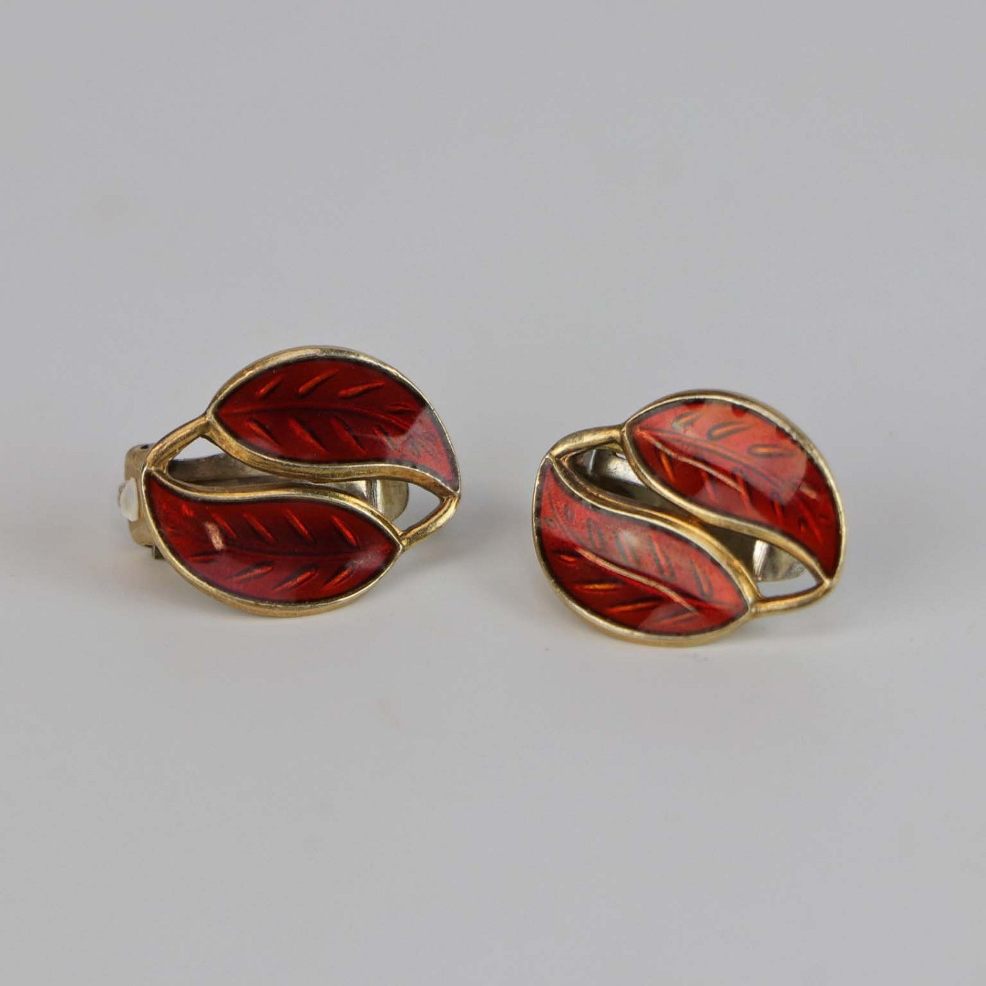 Øreklips i forgyldt sterling sølv dekoreret med motiv af blade med rød emalje. Klips på bagsiden er fremstillet i metal
