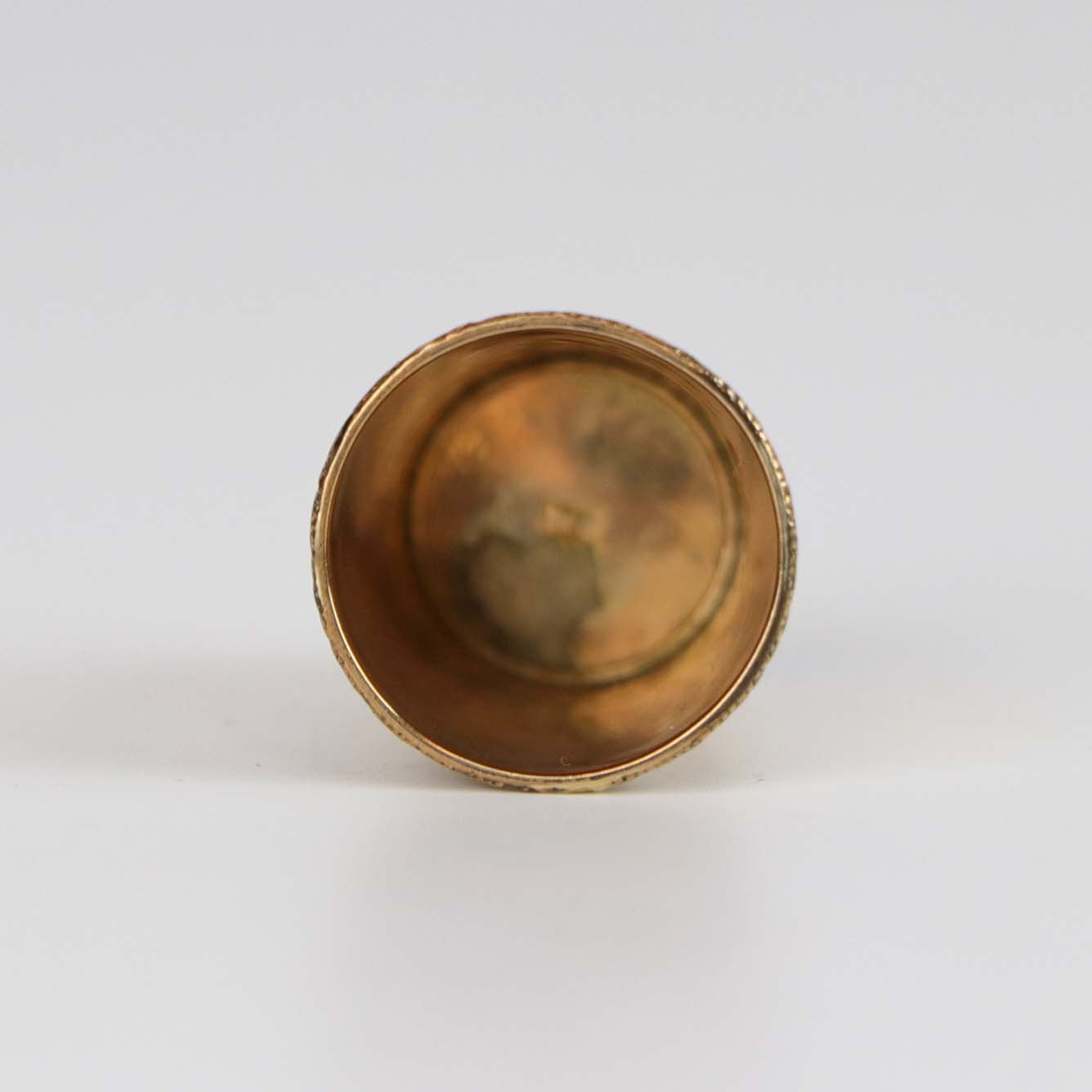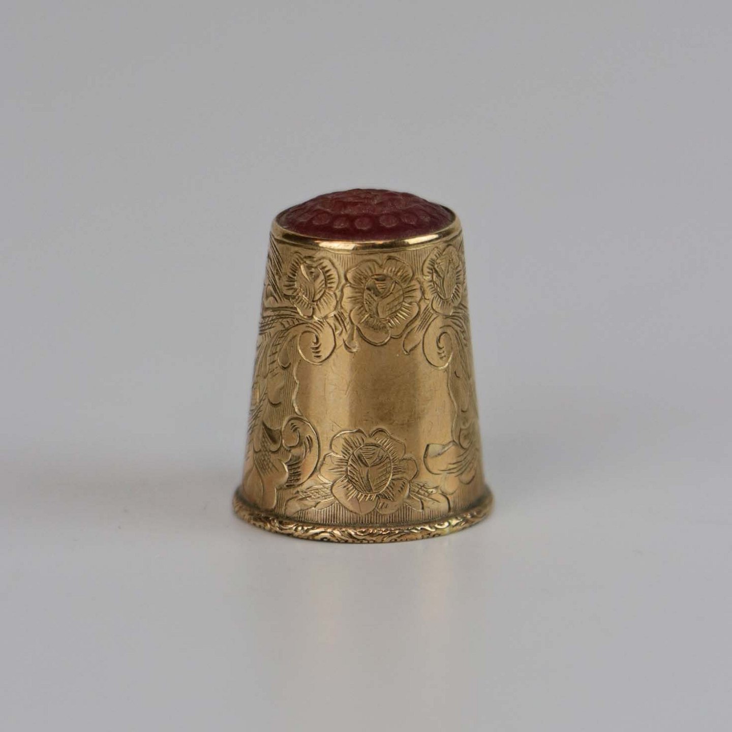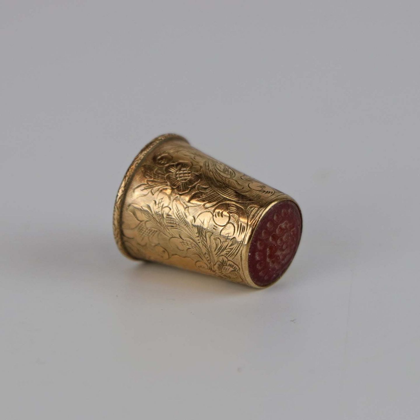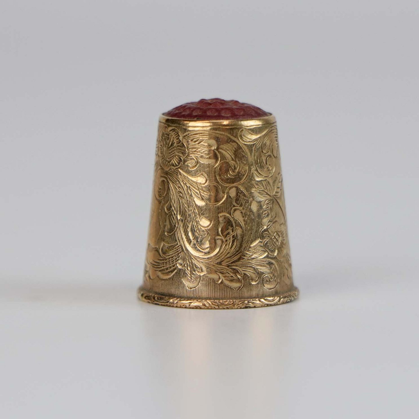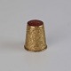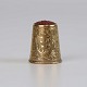 Fingerbøl i guldbelagt sølv med motiv af blomster, ranker og rød spids