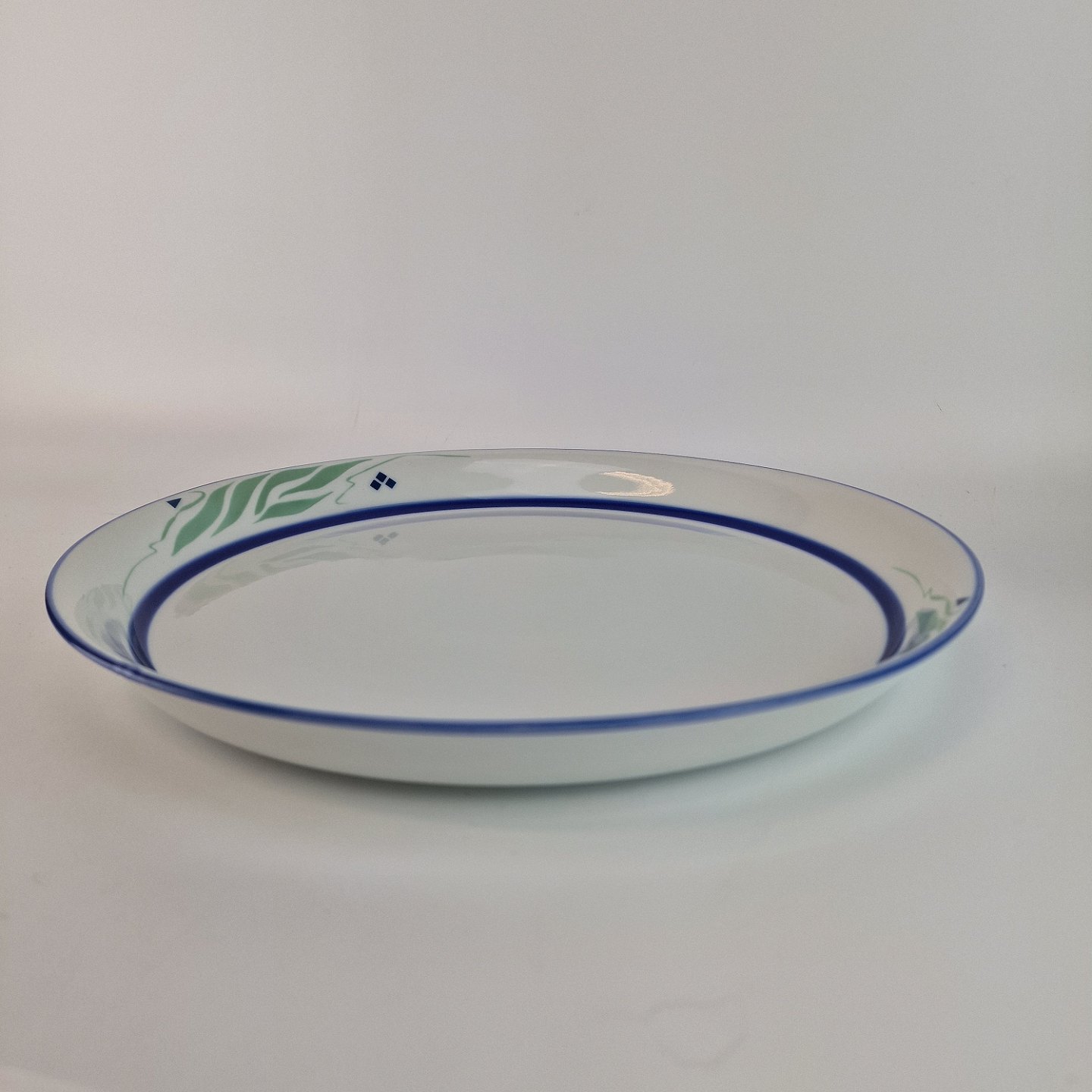 Springtime er af porcelæn, som er glaseret hvidt, malet med blå striber og abstrakt mønster i en lys grøn og blå farve.