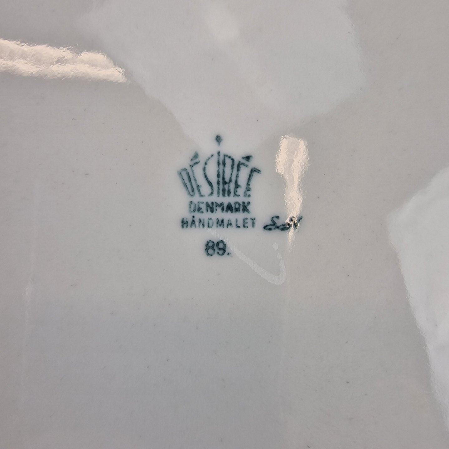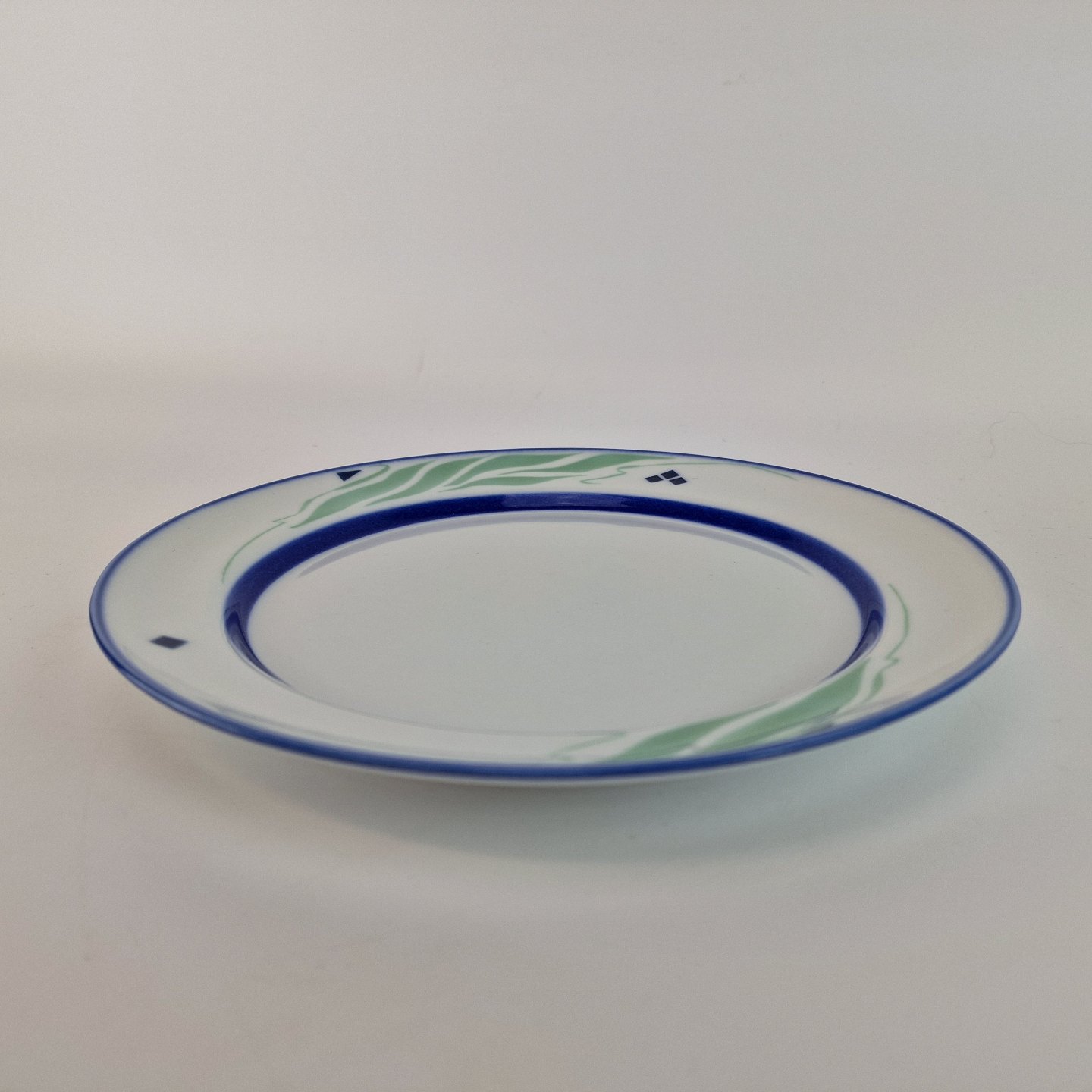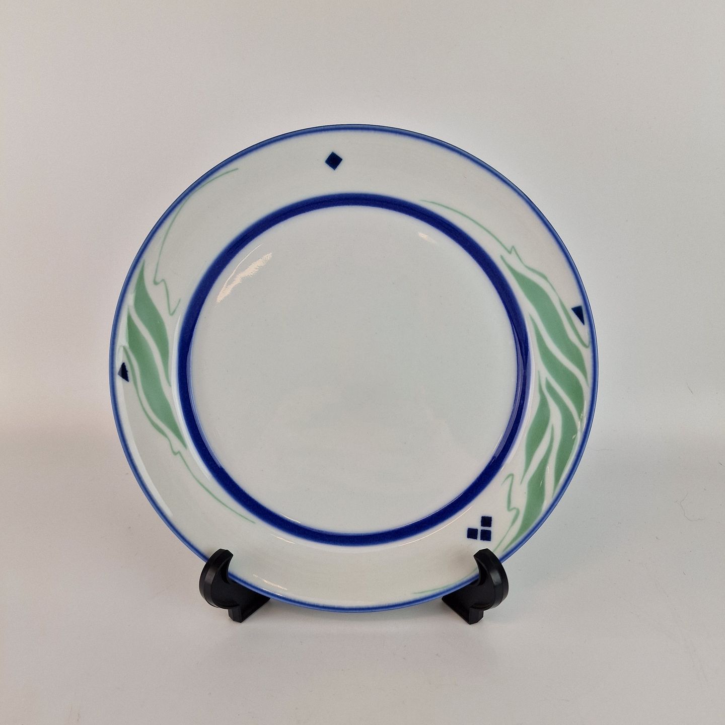 Springtime er af porcelæn, som er glaseret hvidt, malet med blå striber og abstrakt mønster i en lys grøn og blå farve.