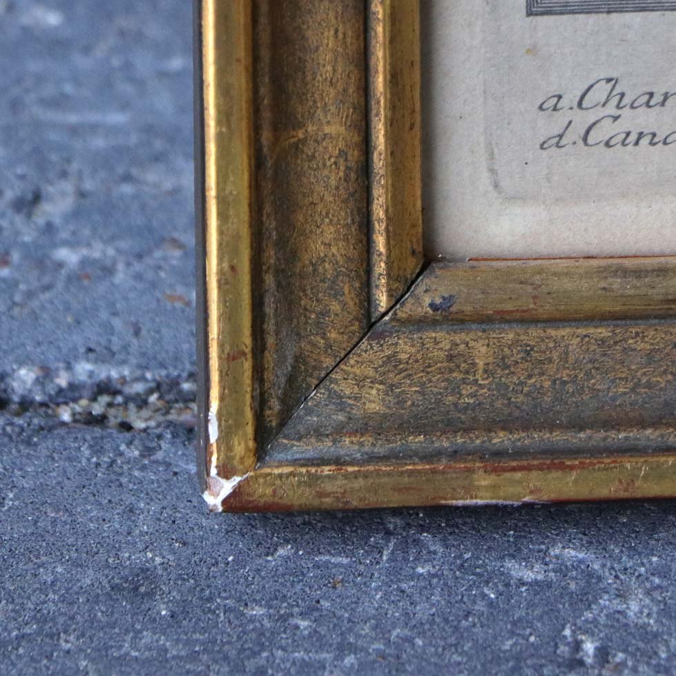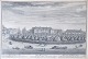 Indrammet tryk monteret i gylden ramme. Gammelt bogtryk med titlen Prospect af Kongens Nytorv med motiv af område i København med udsigt til Nyhavn, Christianshavn Kirke, Charlottenborg slot, Grev Dannerskjold huset