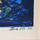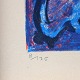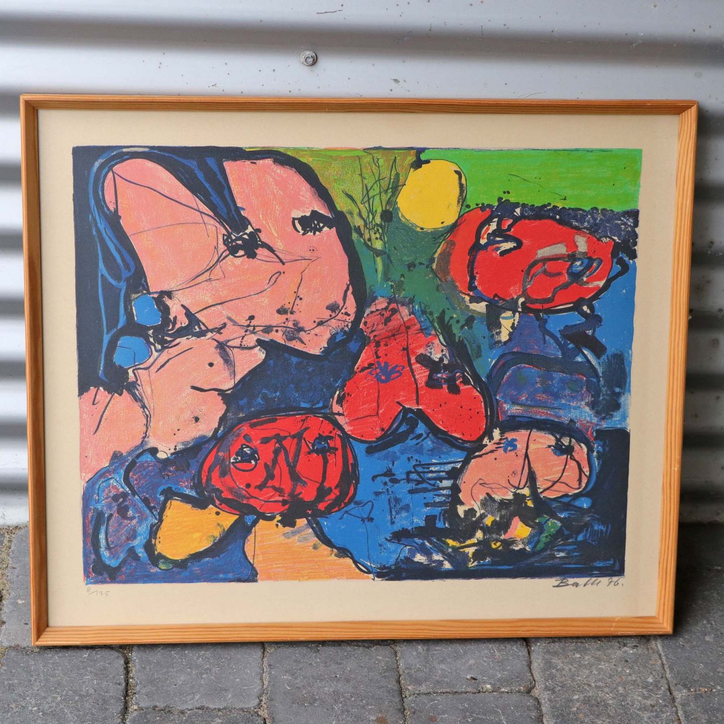 Indrammet litografi i ramme. Abstrakt litografisk tryk nr 8/175 i blå, rød, grøn, orange og gule farver