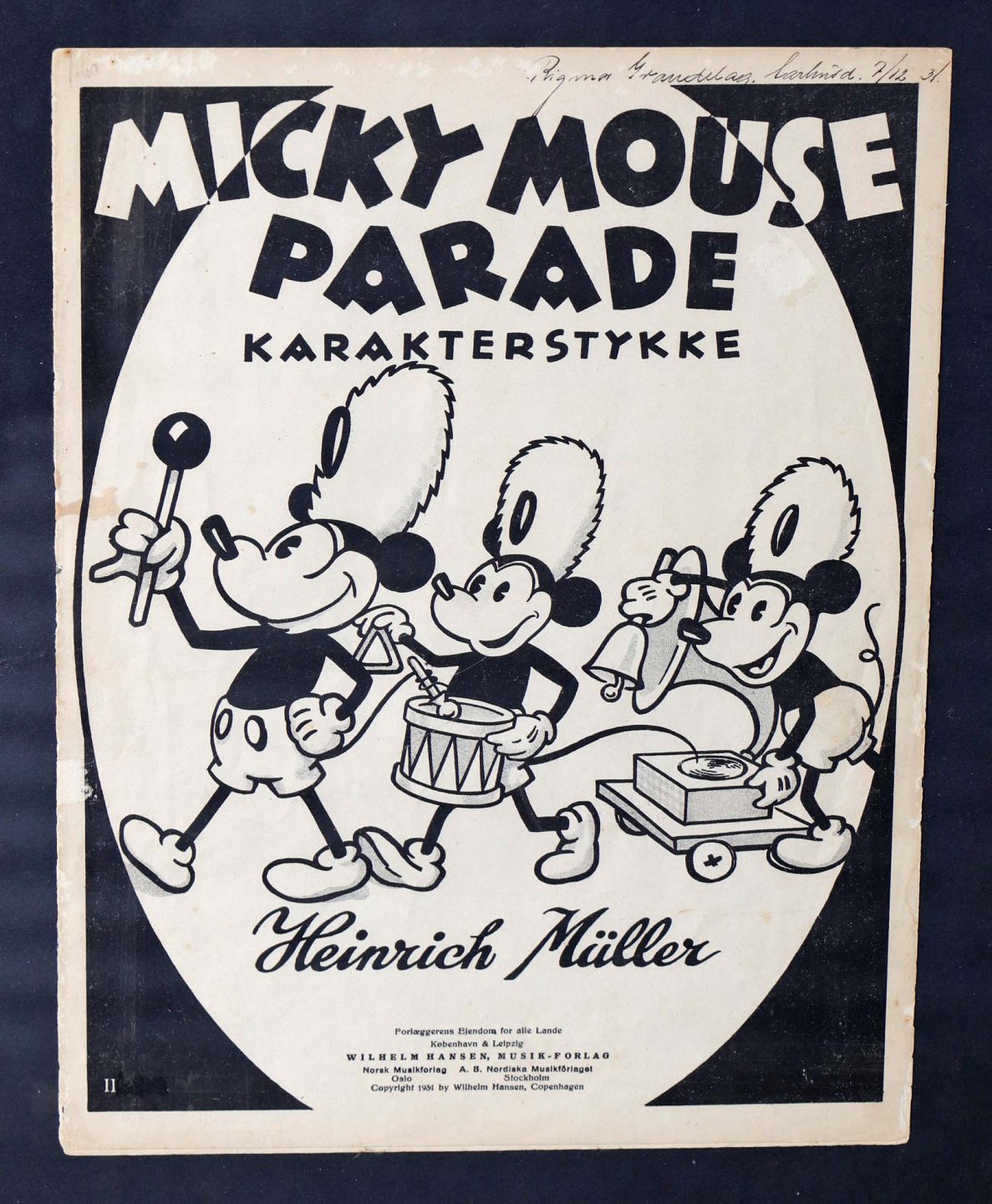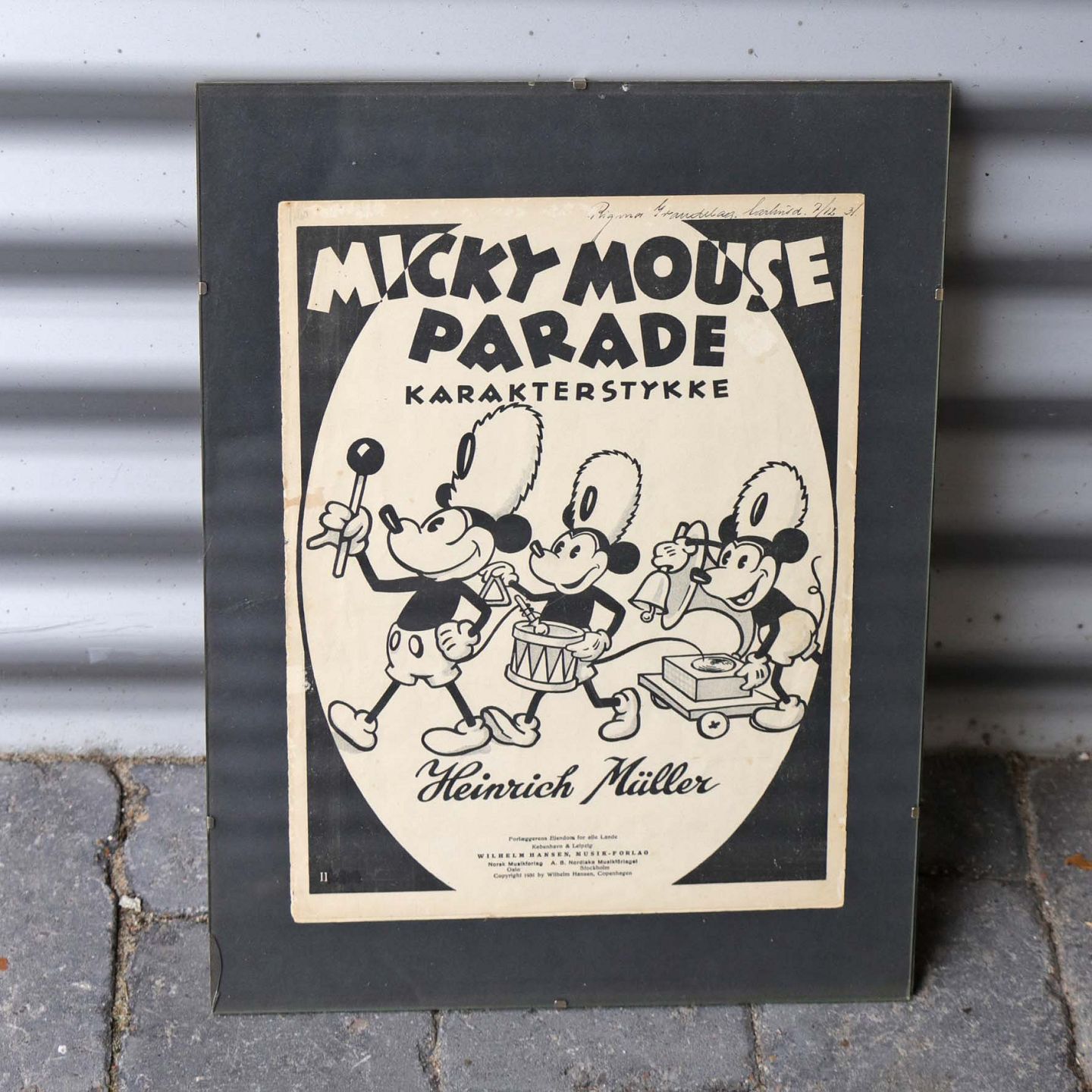 Indrammet tryk i skifteramme. Gammelt grafisk tryk i sort og hvid fra år 1931 med titlen Micky Mouse Parade, Karakterstykke af Heinrich Müller. Blæk notat i øverst højre hjørne, også fra 1931