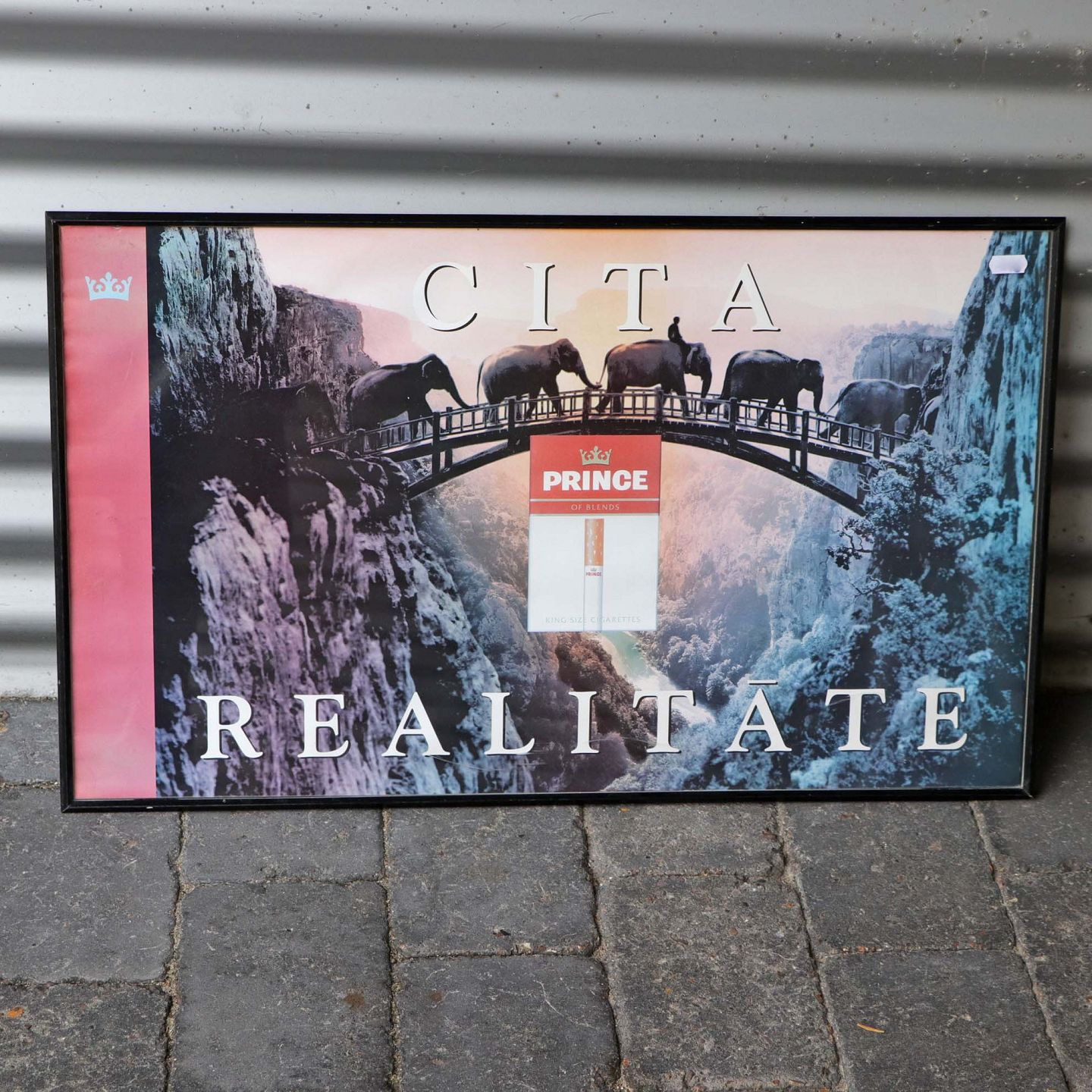 Indrammet tryk i sort ramme. Udenlandsk reklametryk for Prince cigaretter med titlen Cita Realitâte (Rumænsk og betyder: Citat Virkeligheden) med motiv af en cigaretpakke, hvor baggrunden viser elefanter på vej over en bro, som forbinder kløften.