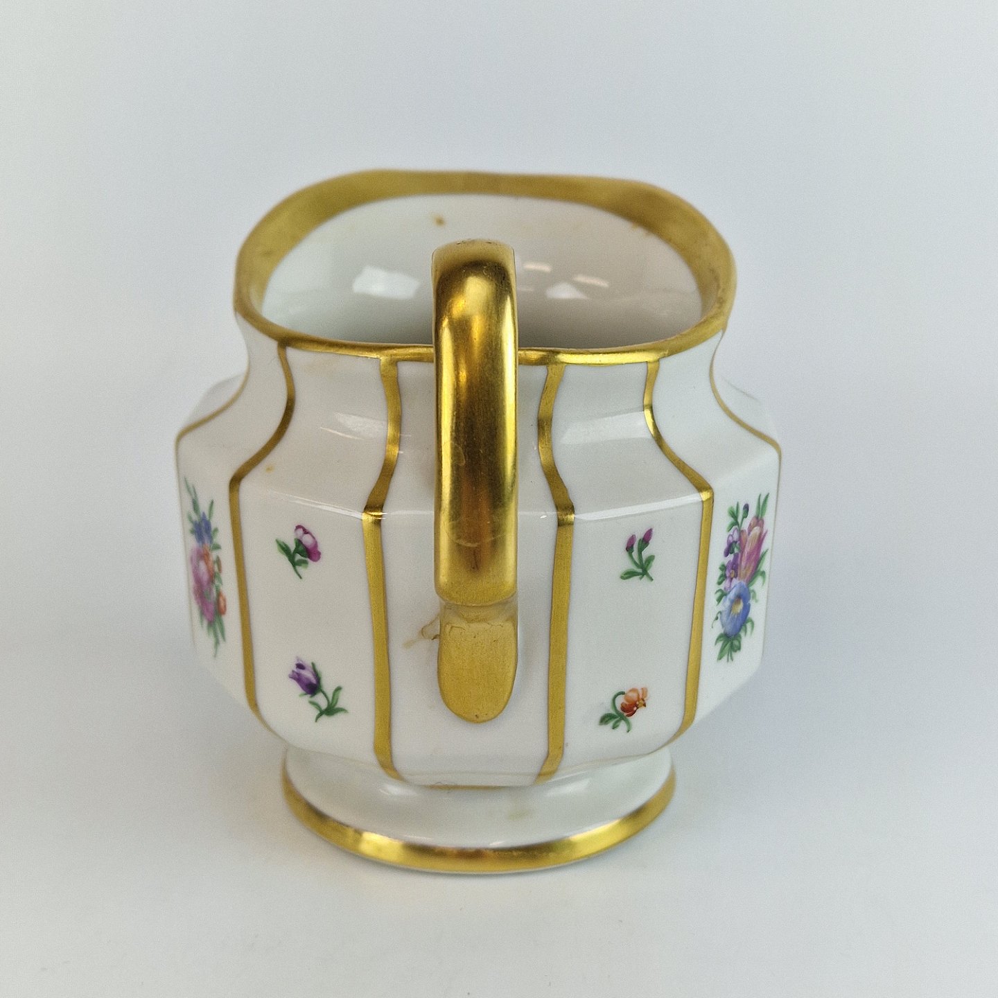 Henriette er af porcelæn og har motiver af små blomsterbuketter og guldstreger på det kantede stel.