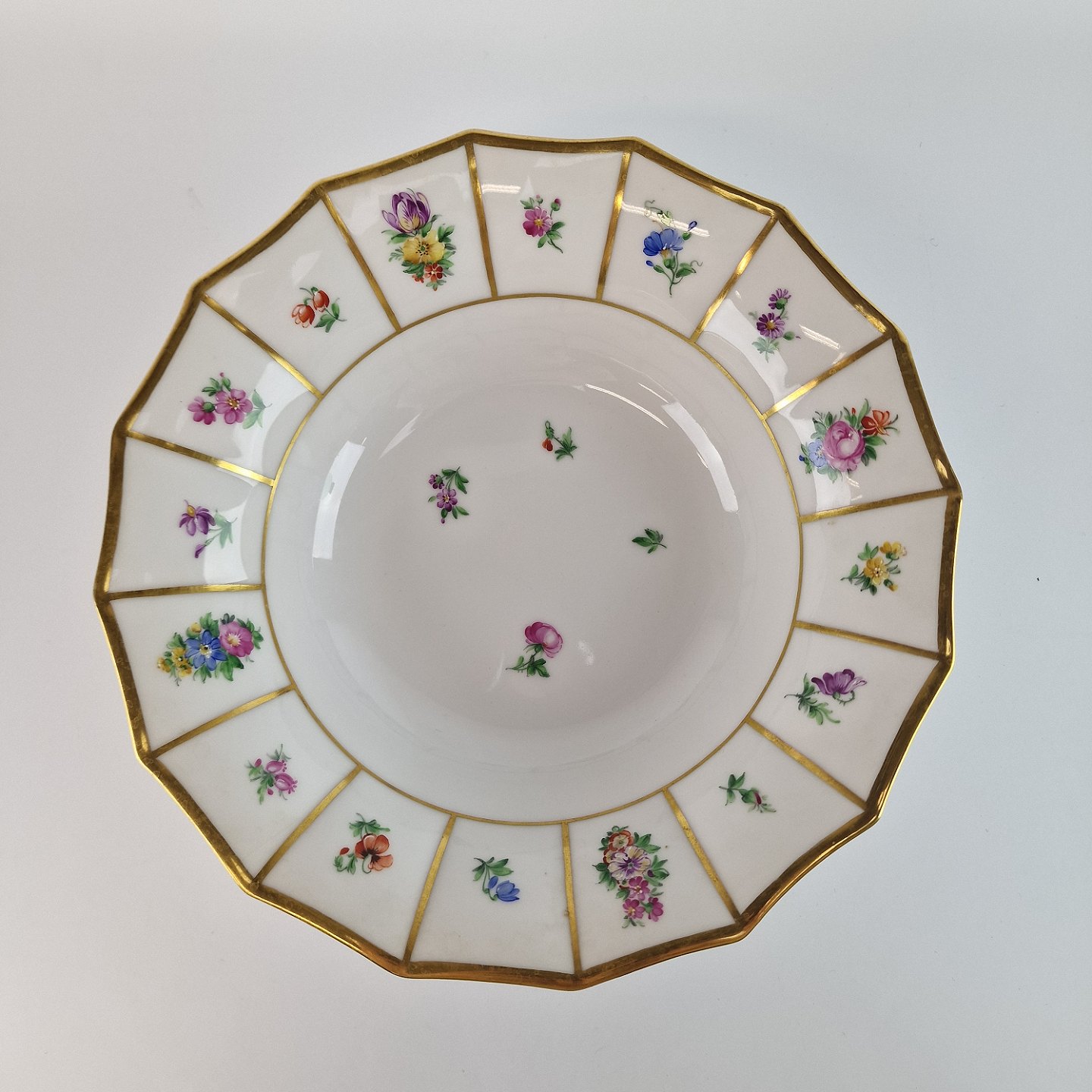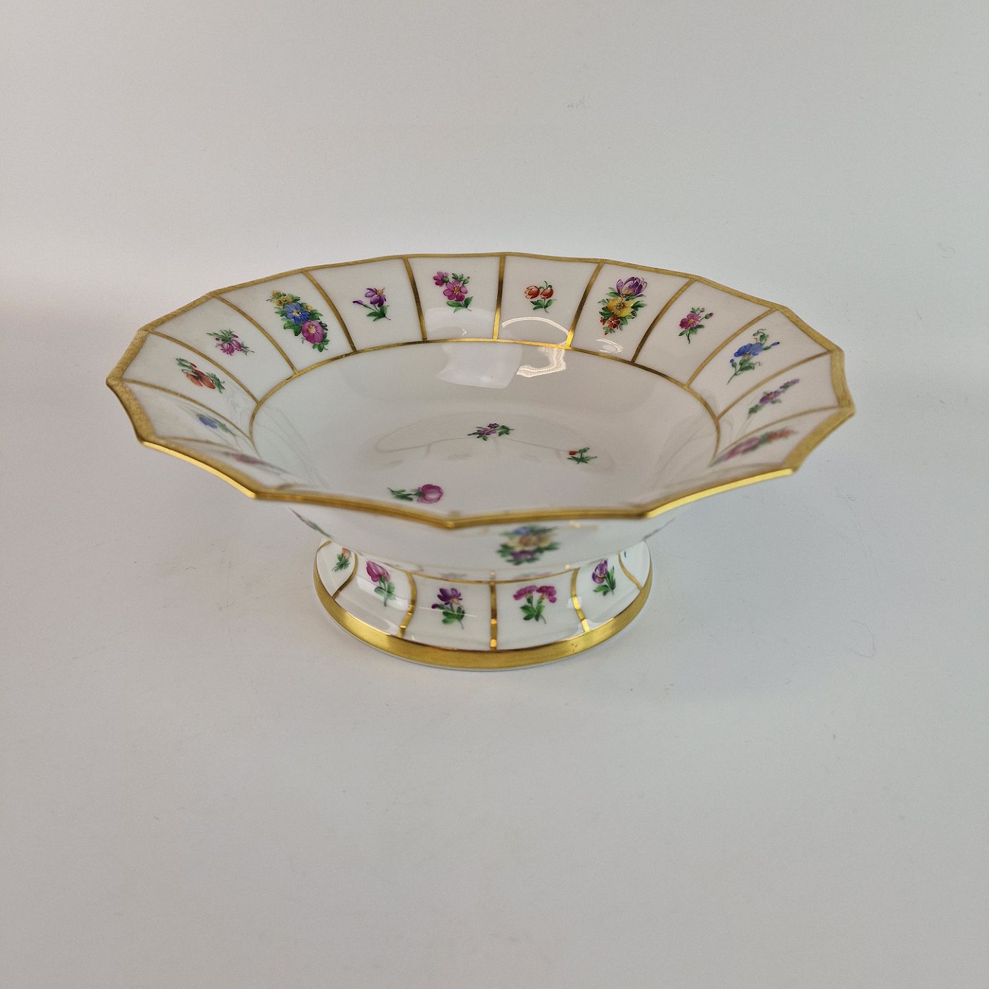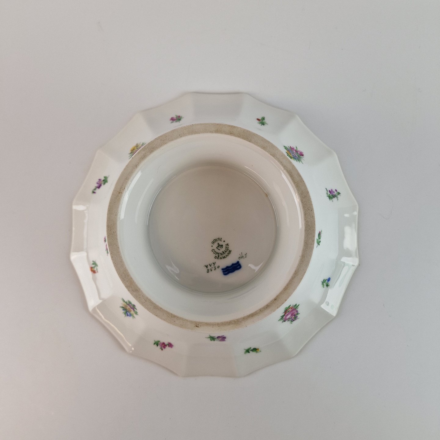 Henriette er af porcelæn og har motiver af små blomsterbuketter og guldstreger på det kantede stel.