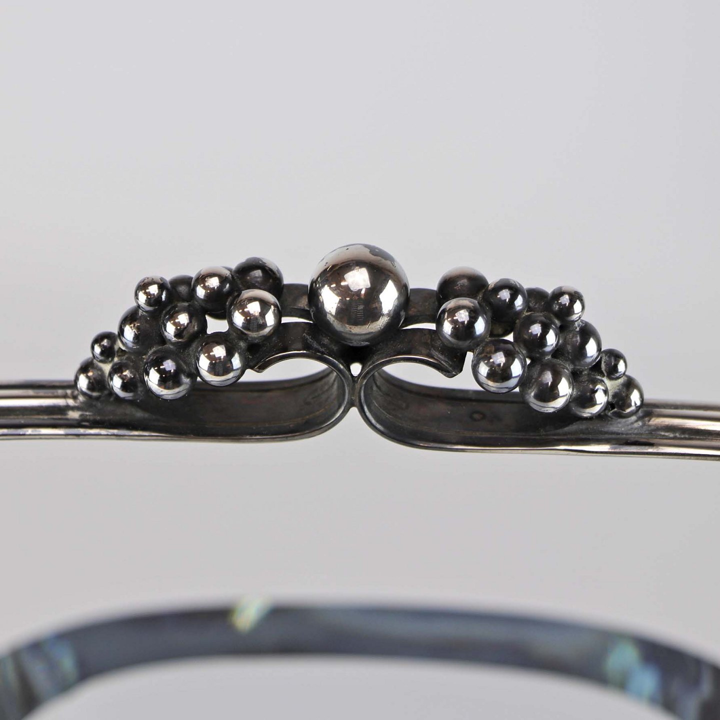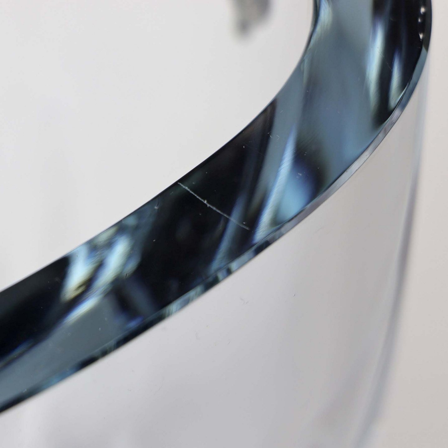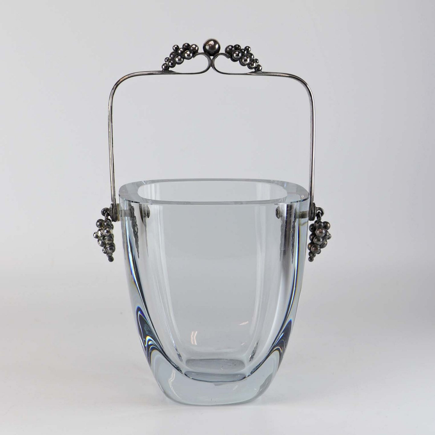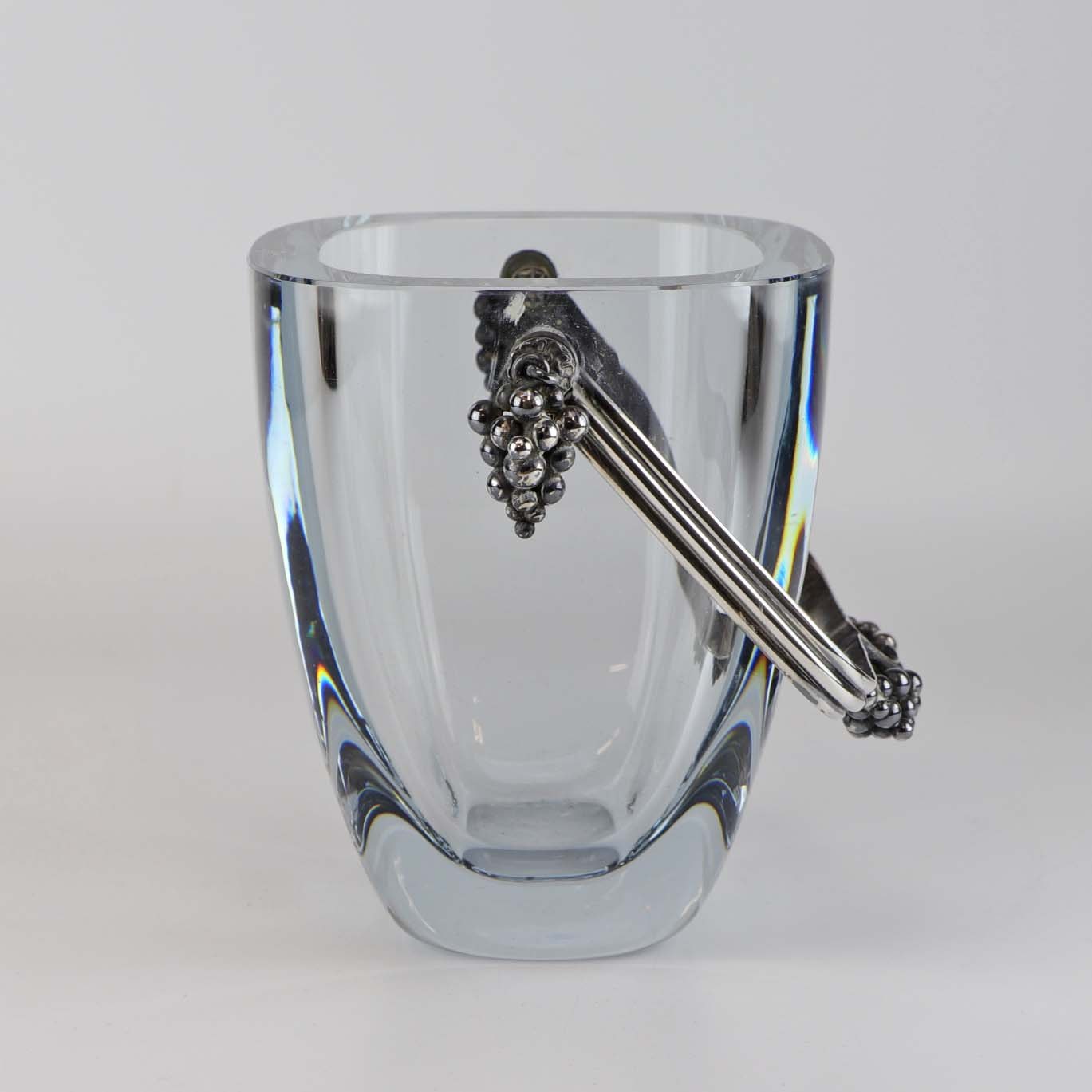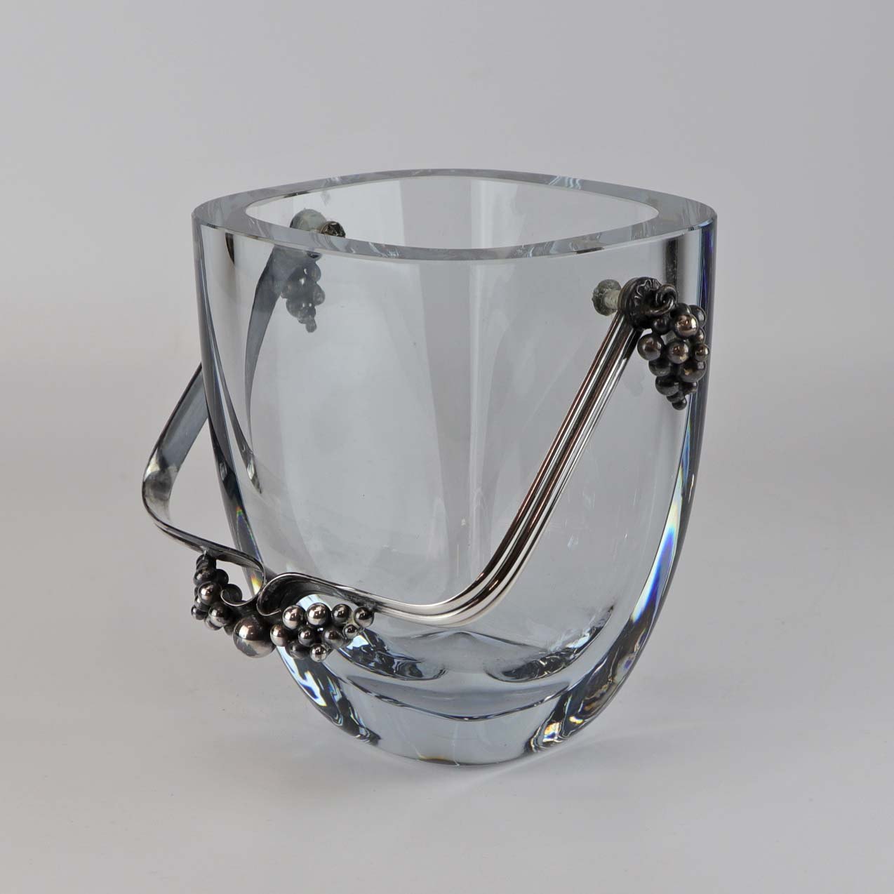 Isspand i klart lyseblåt glas med hank i sølv. Hanken er dekoreret med vindrueklaser
