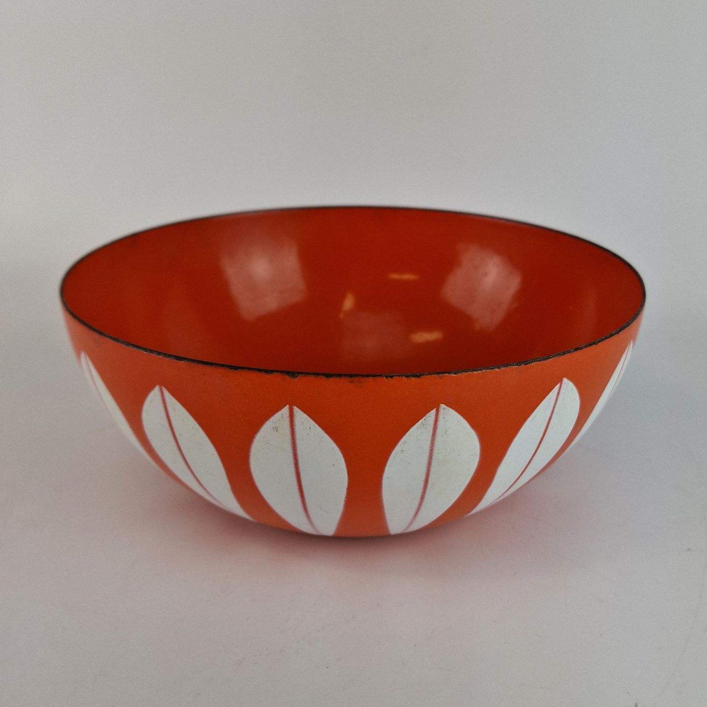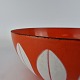 Skål af emalje malet orange og dekoreret med hvide blade, fra serien Lotus. Blev til i 1960'erne