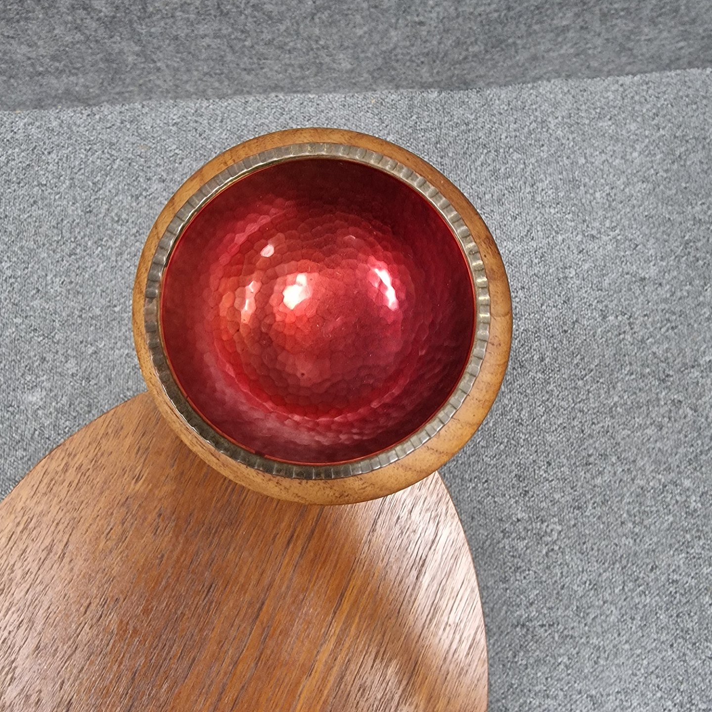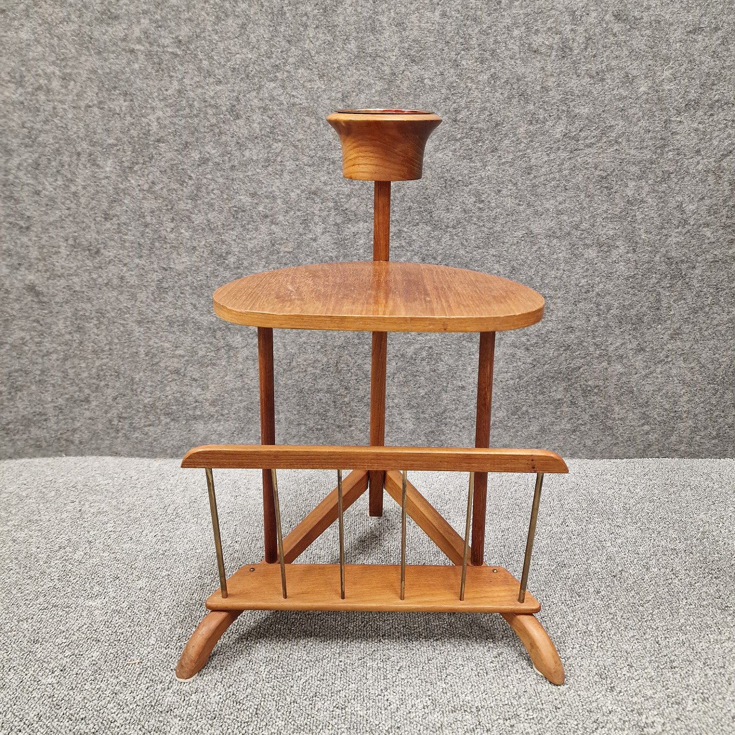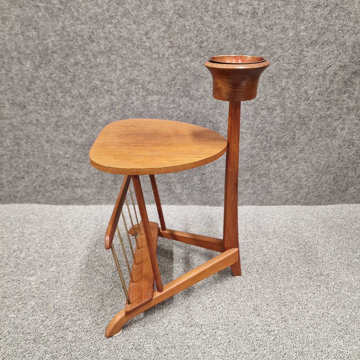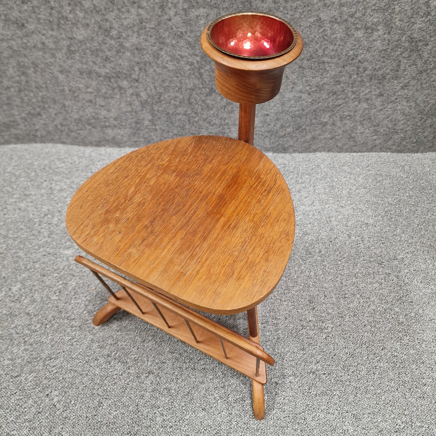 Askebæger, bord og magasinholder i et møbel lavet af ? Askebægeret er aftageligt og lavet af kobber