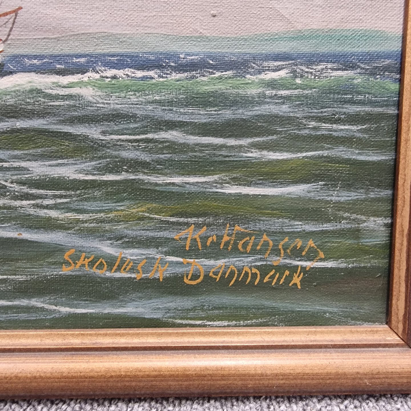 Oliemaling på lærred. Motivet er Skoleskibet Danmark med kurs mod rundingen ved Kronborg