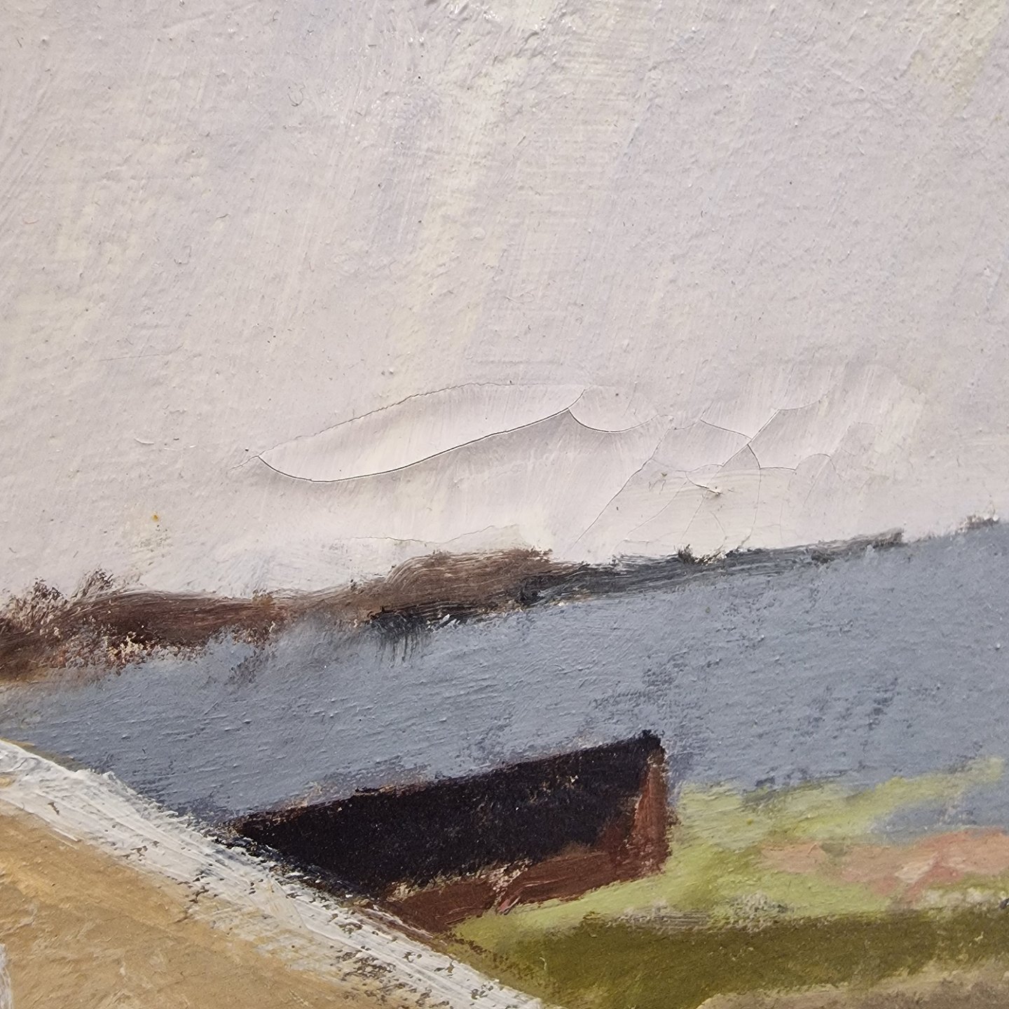 Maleri af akryl på lærred, med motiv af huse ved vandet