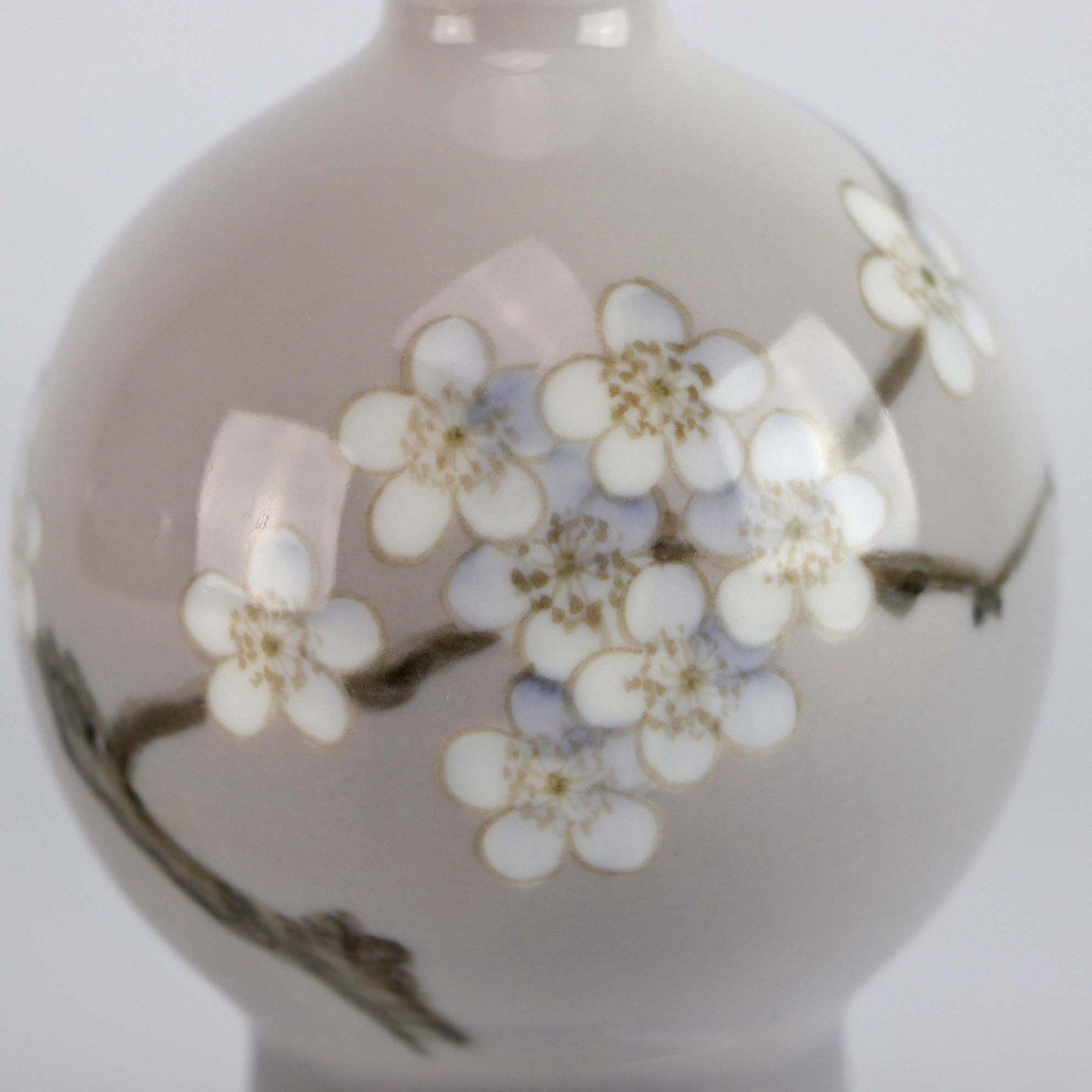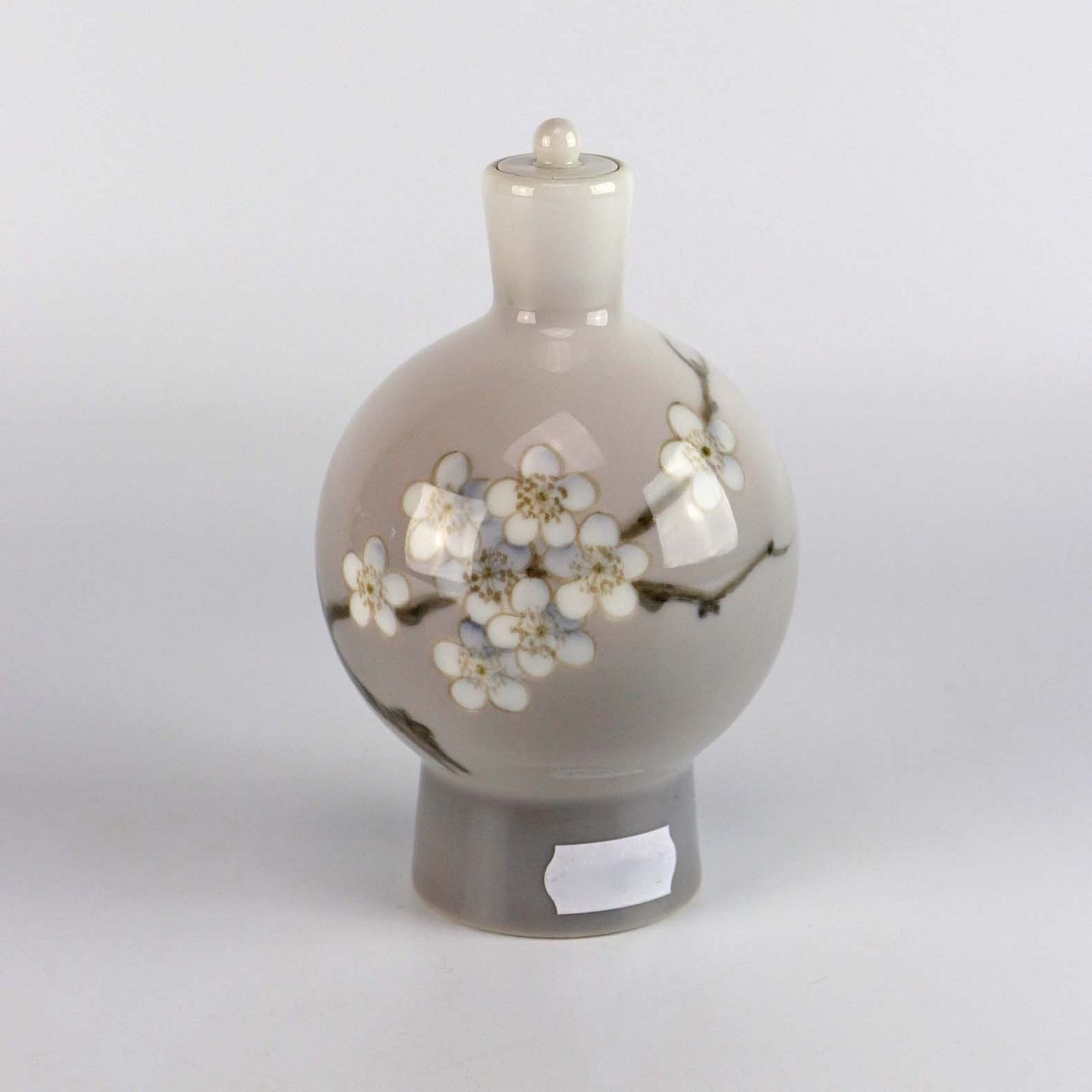 Rund vase og flakon i porcelæn med prop med motiv af blomster på grene nr 383