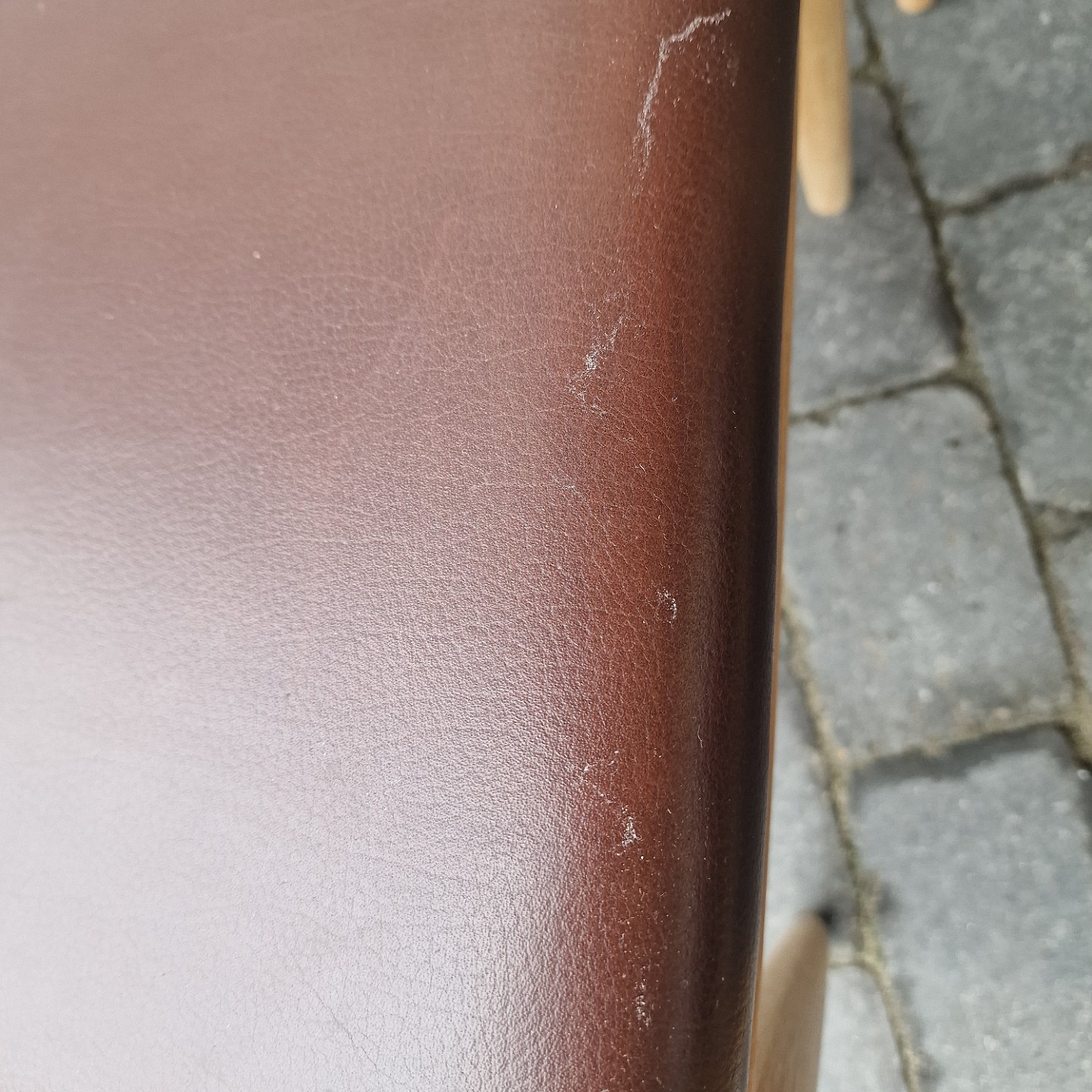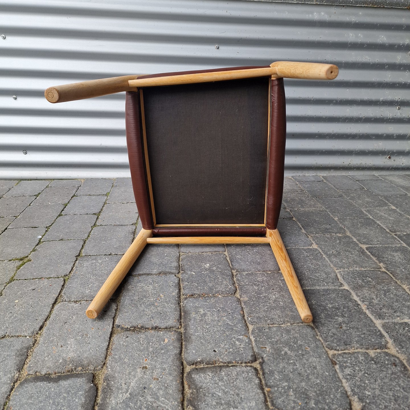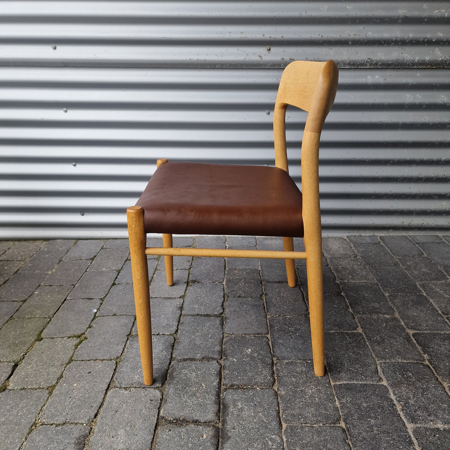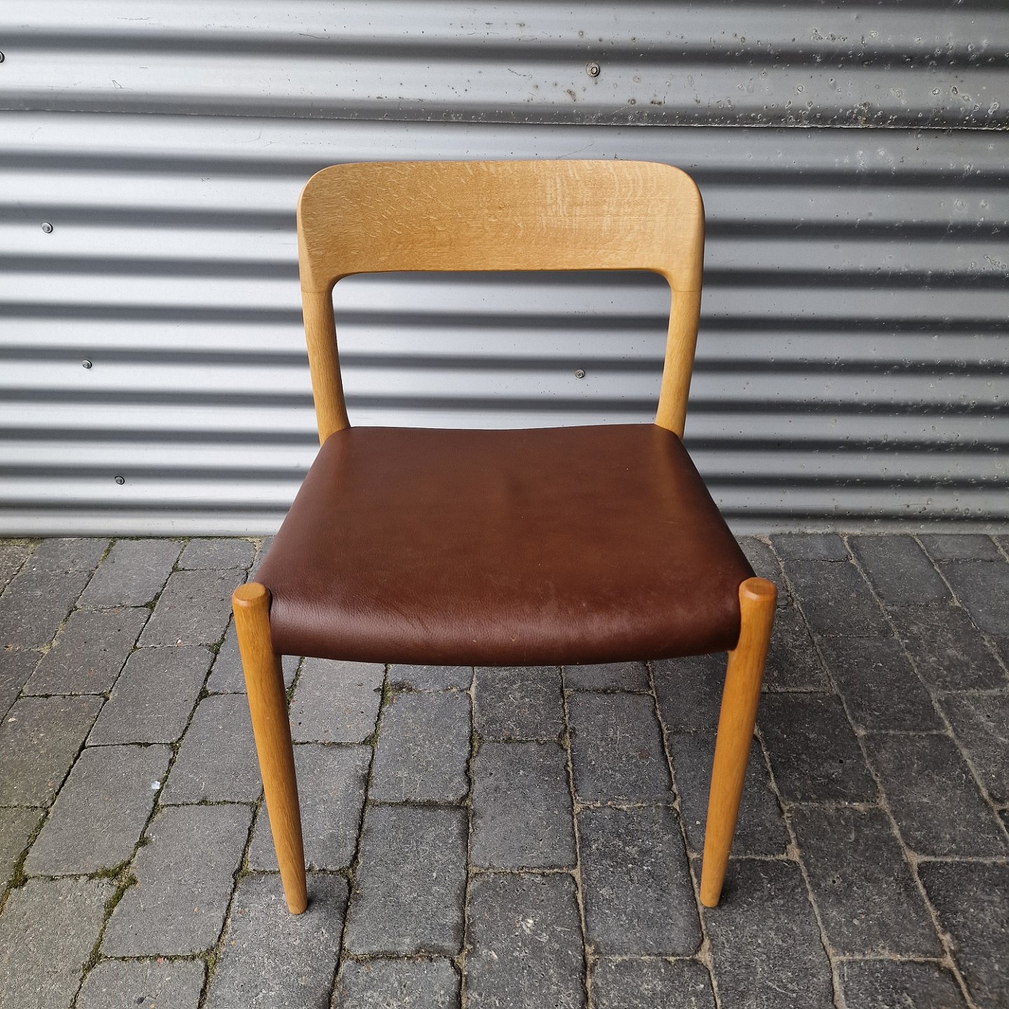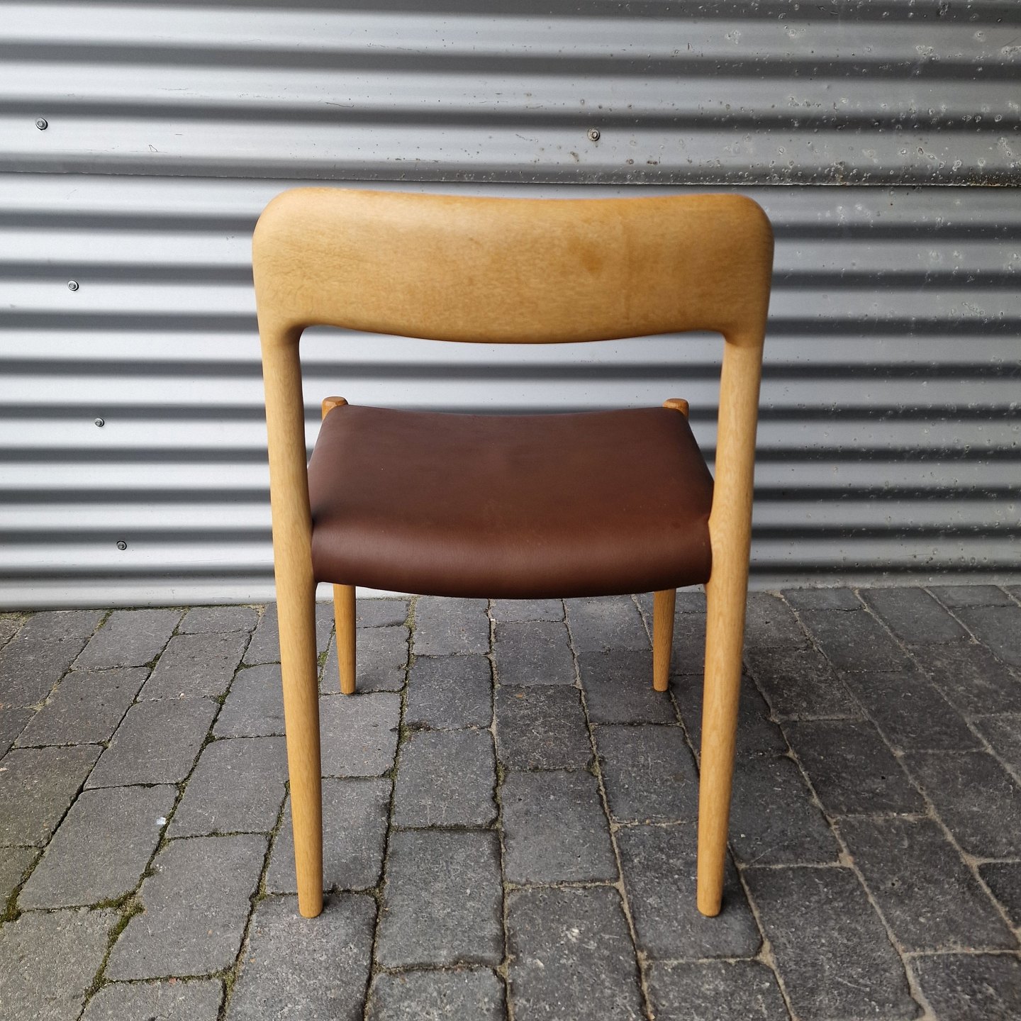NO Møller Designstole håndlavet af egetræ og sæde af brunt læder
