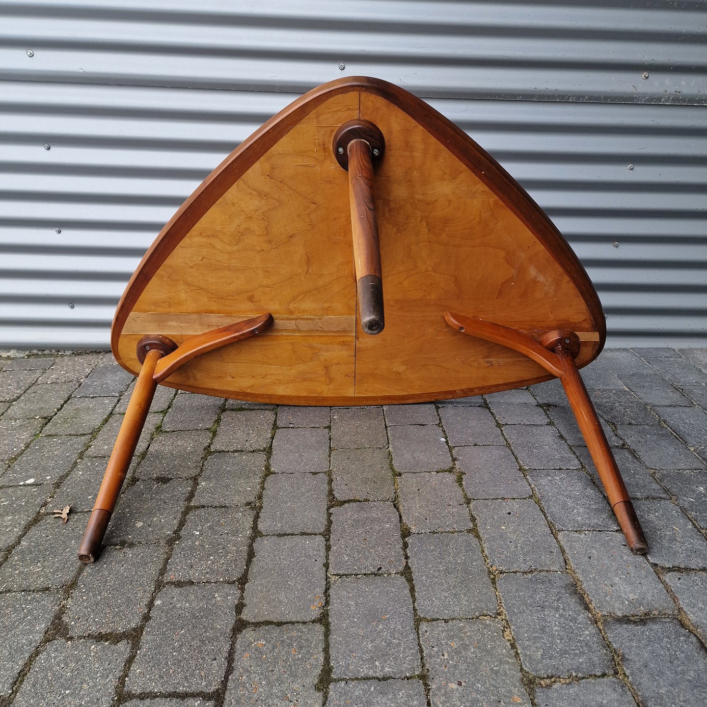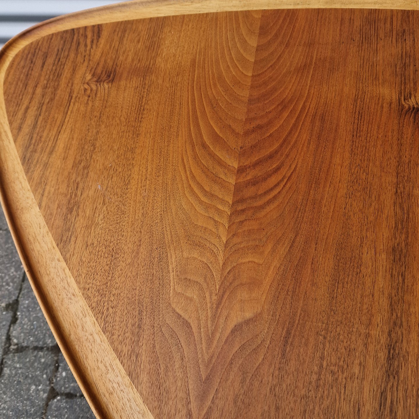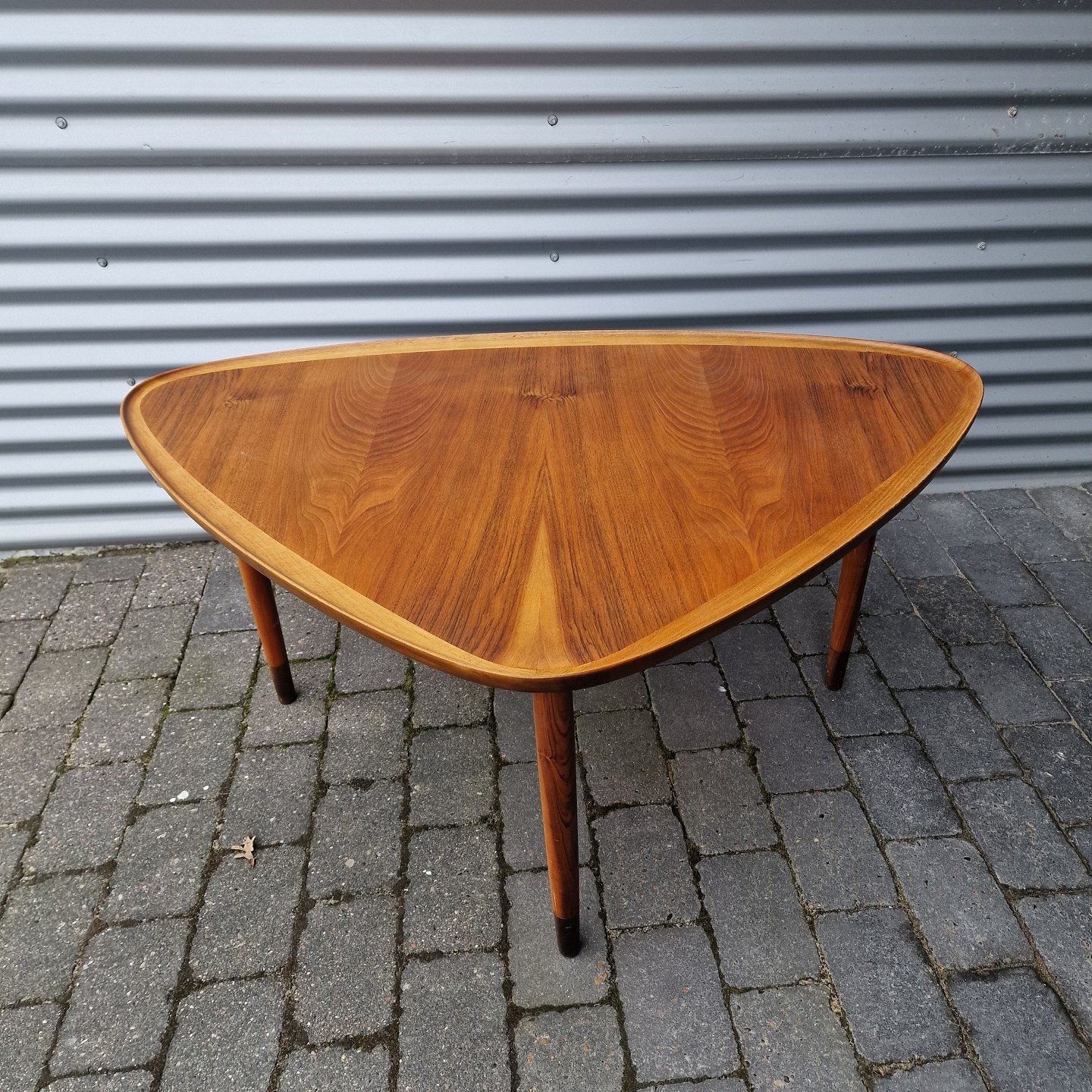 Trekantet sofabord af teaktræ og egetræ. De to træsorter giver et flot mønster på bordpladen og på benene