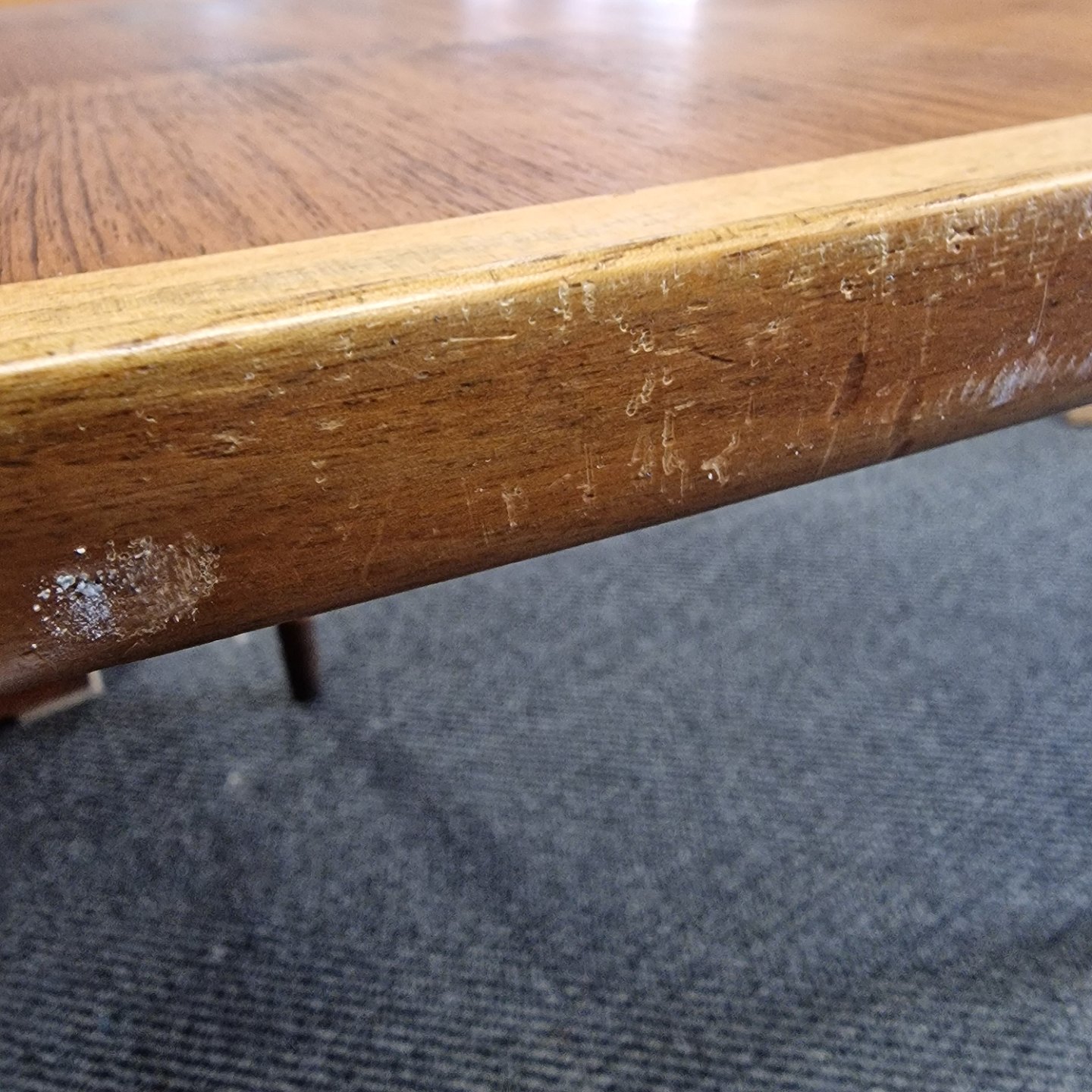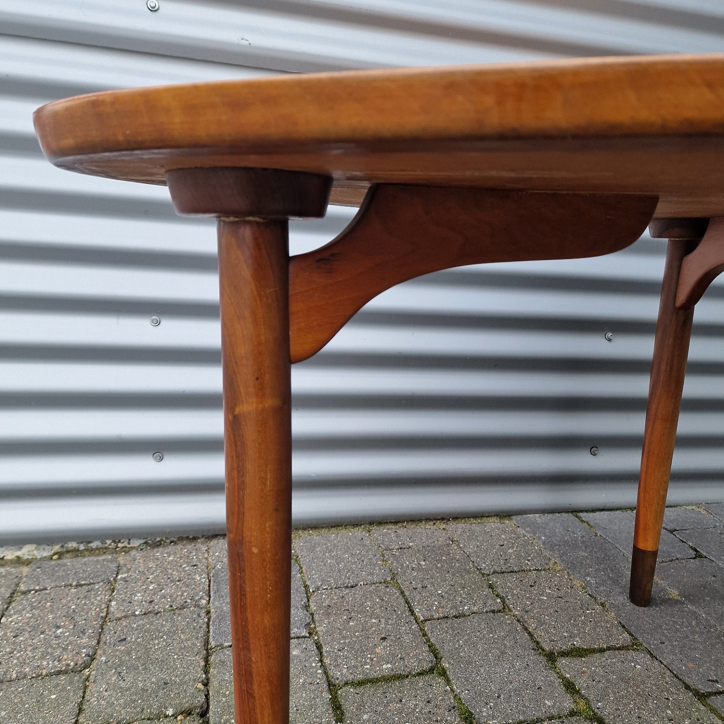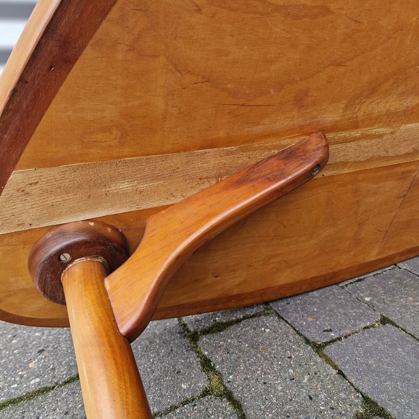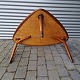 Trekantet sofabord af teaktræ og egetræ. De to træsorter giver et flot mønster på bordpladen og på benene