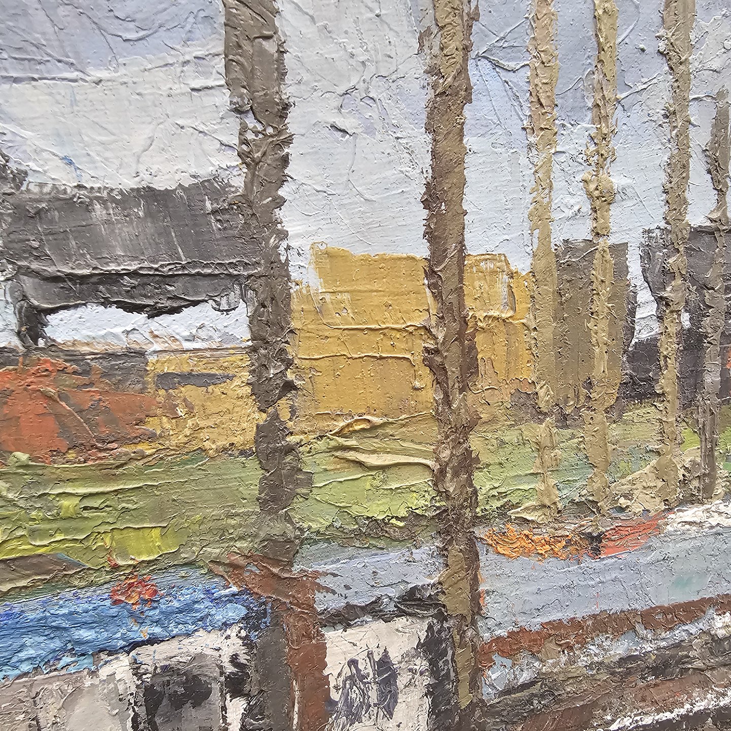 Maleri af oliemaling på lærred, med motiv af en havn med fiskekutterer og huse