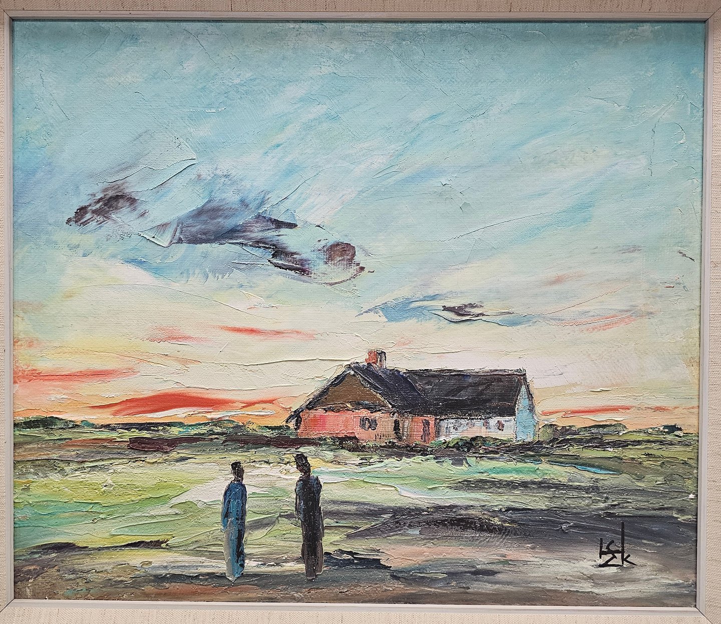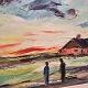 Maleri af oliemaling på lærred, med motiv 2 personer ved et hus