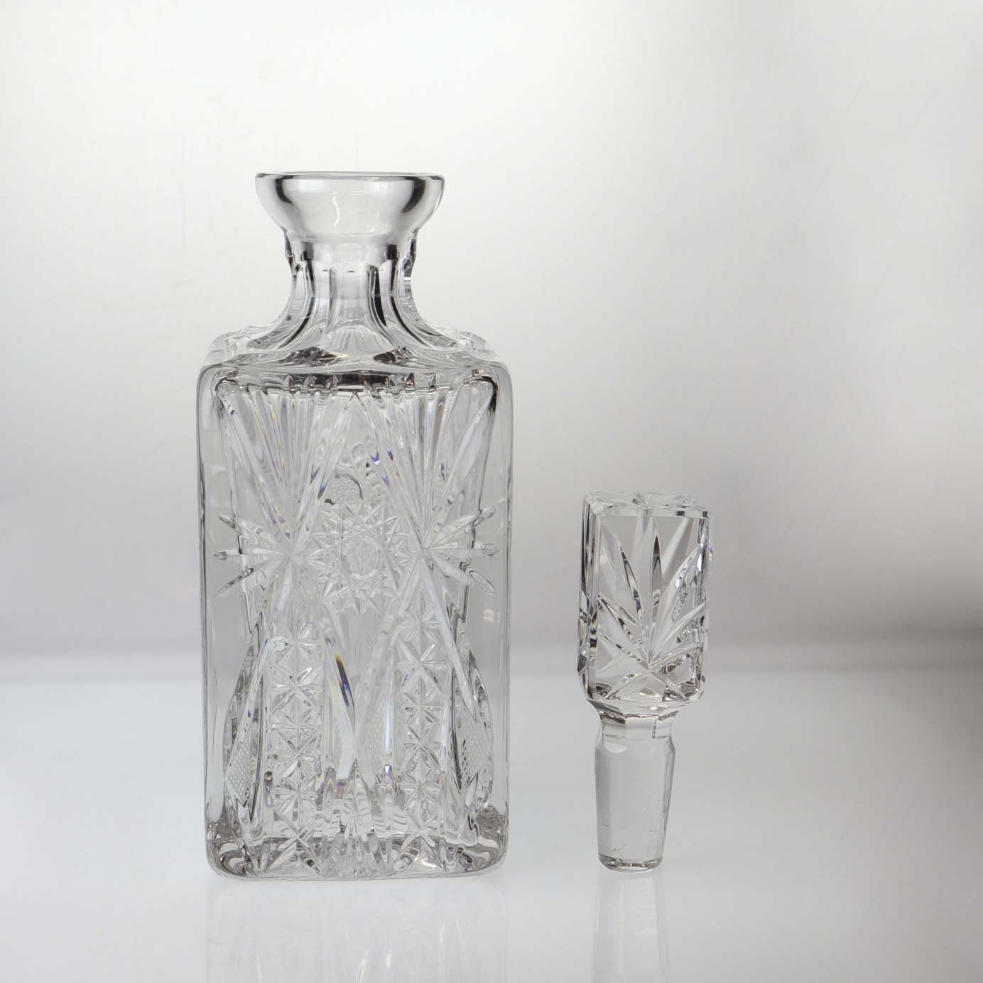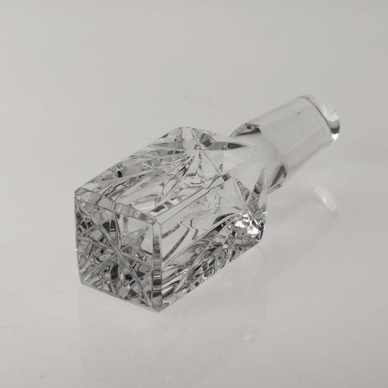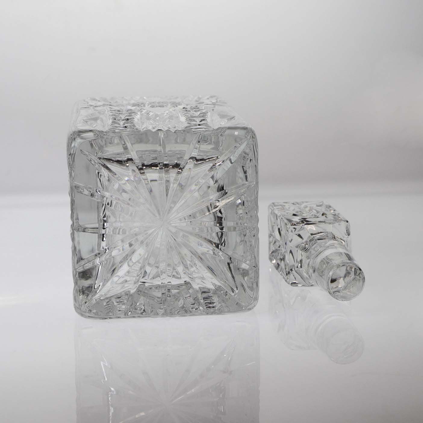 Kvadratisk karaffel i klart glas, samt prop med kvadratisk top i klart glas