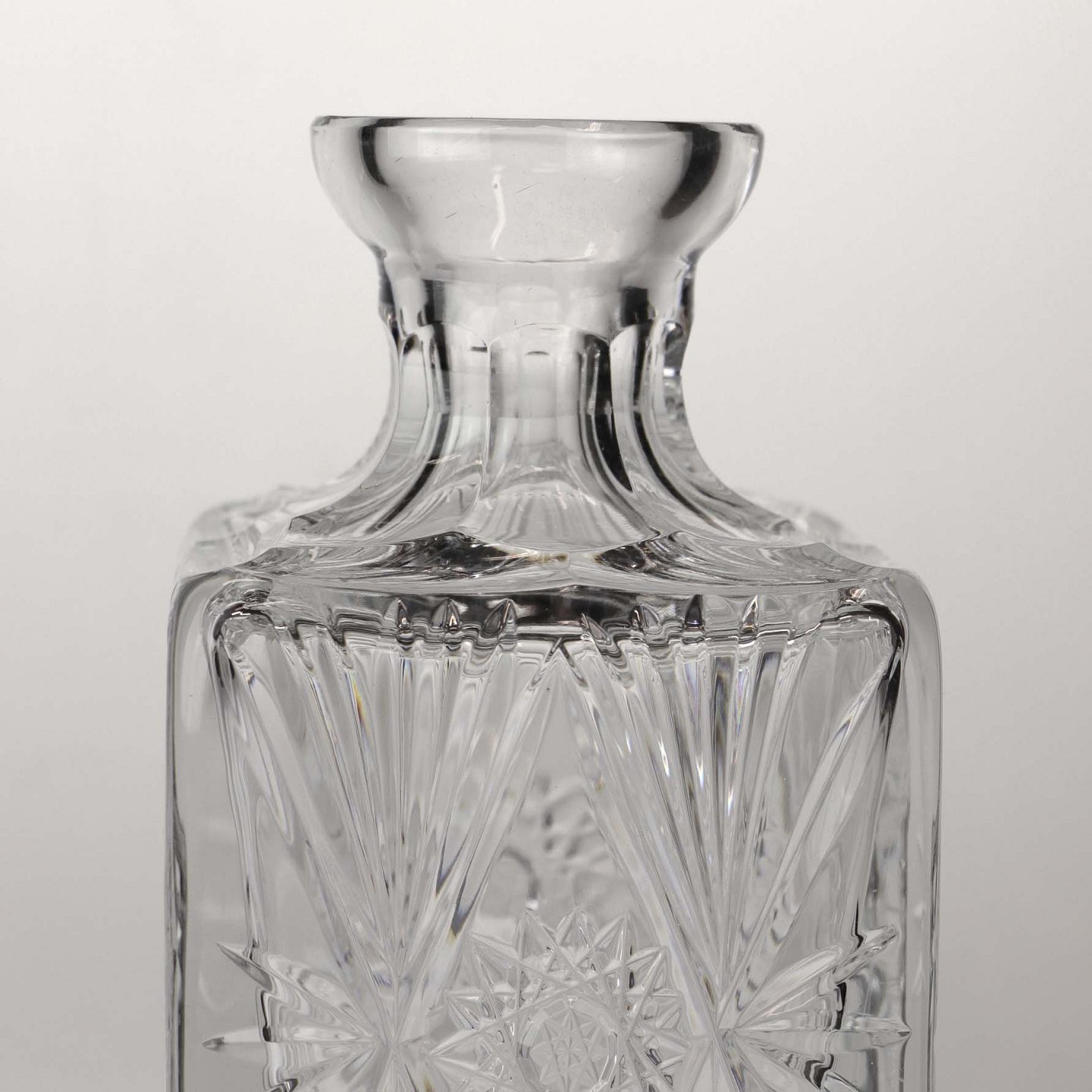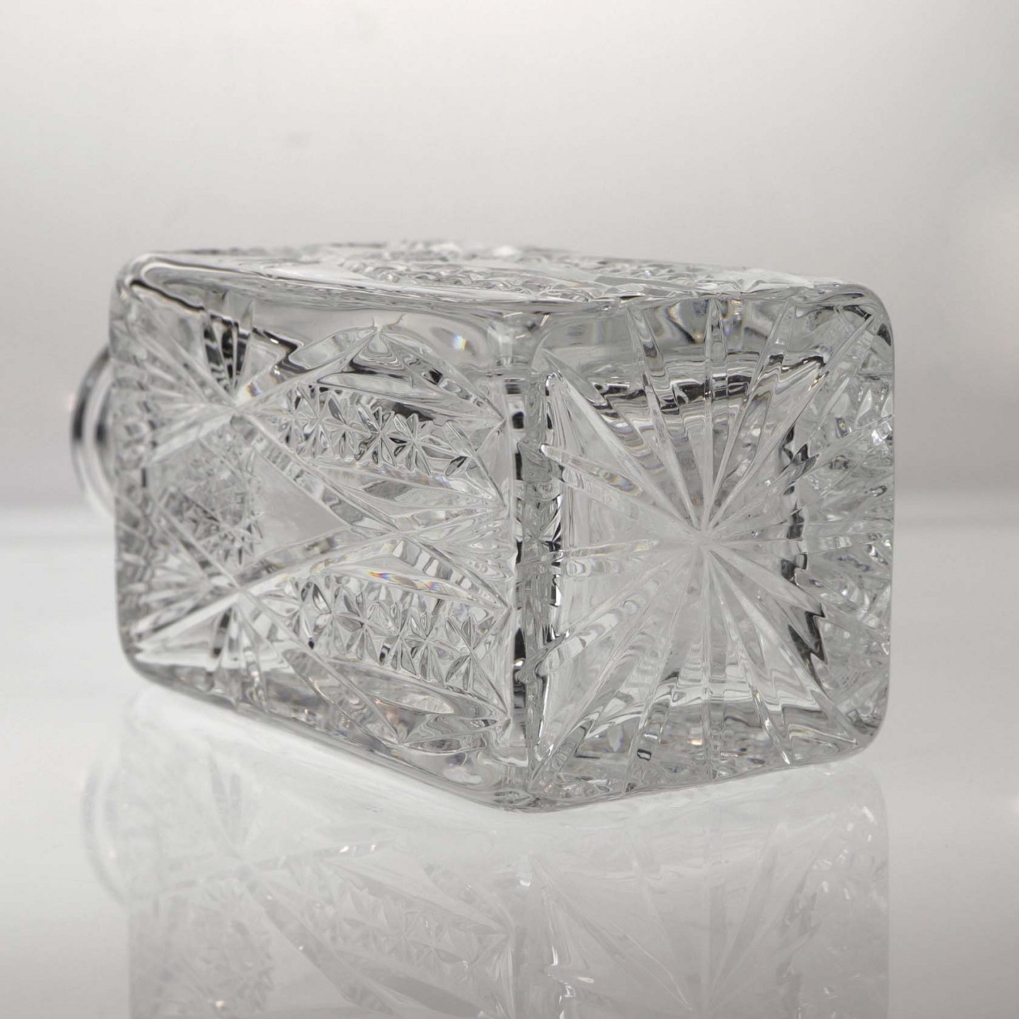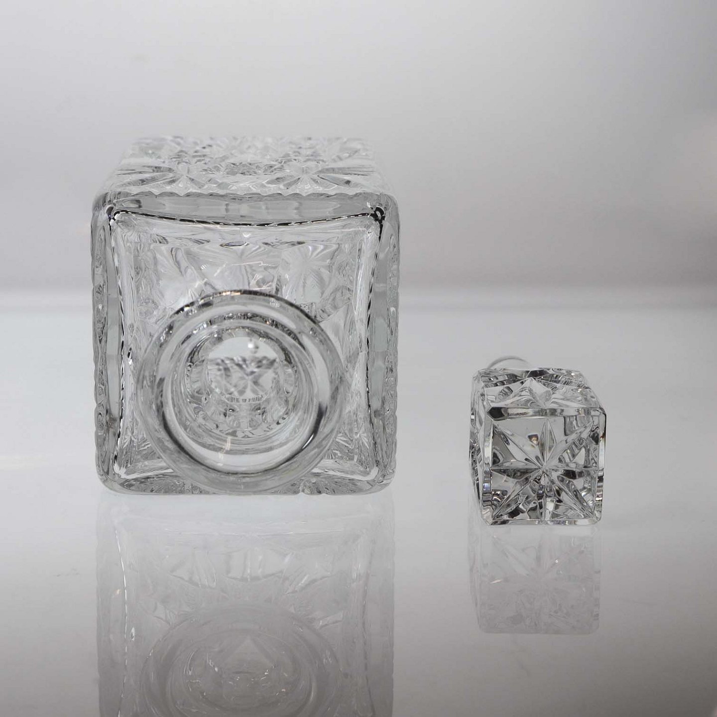Kvadratisk karaffel i klart glas, samt prop med kvadratisk top i klart glas