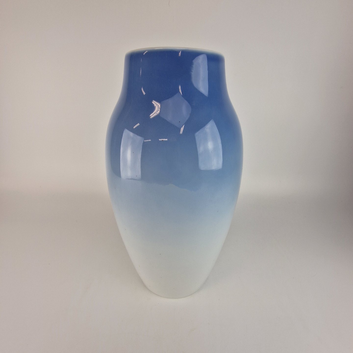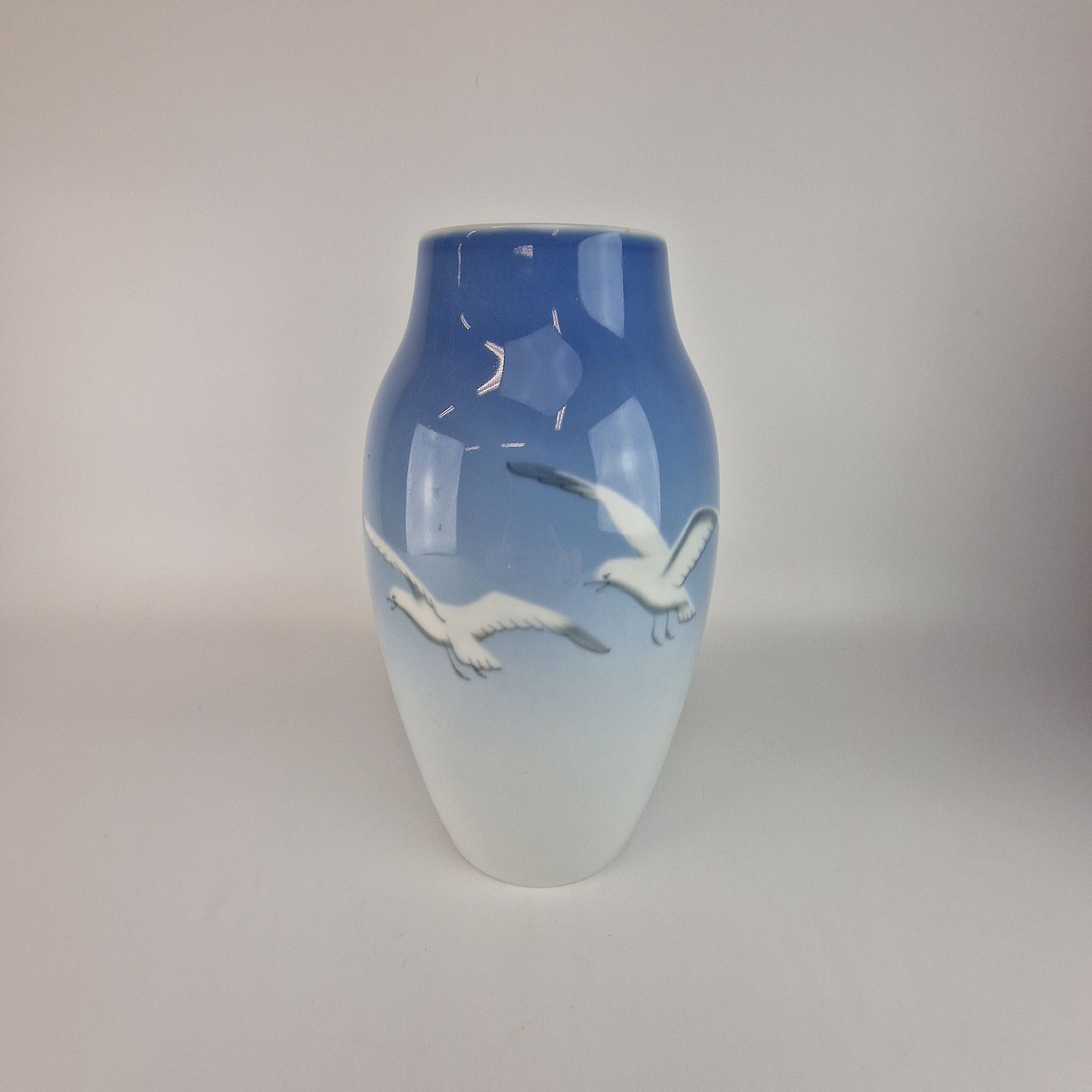 Vase af porcelæn fra Mågestellet. Vasen er dekoreret i blå og hvid nuance med motiv af måger nr 5243
