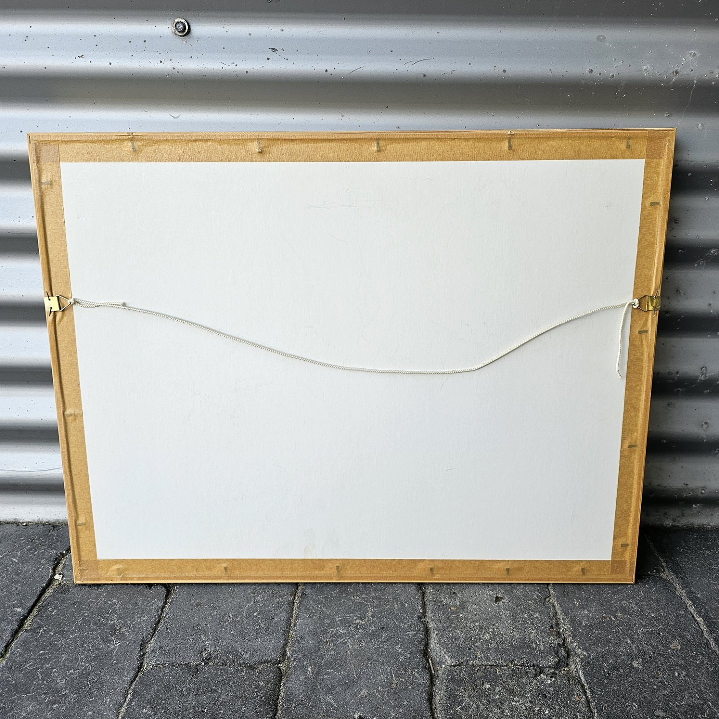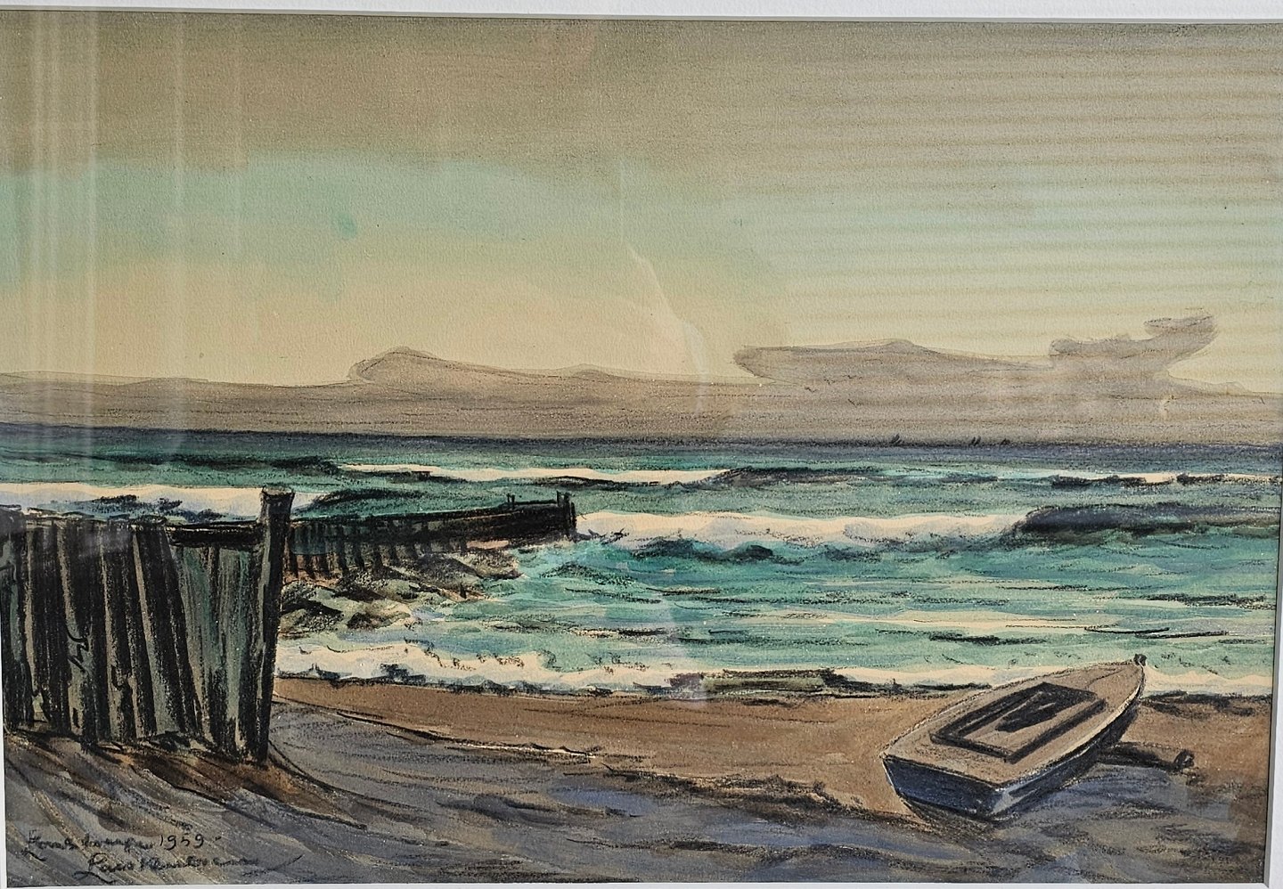 Indrammet akvareltegning med motiv af strand med badebro og en jolle med titlen Hanstholm eller Lønstrup 1959