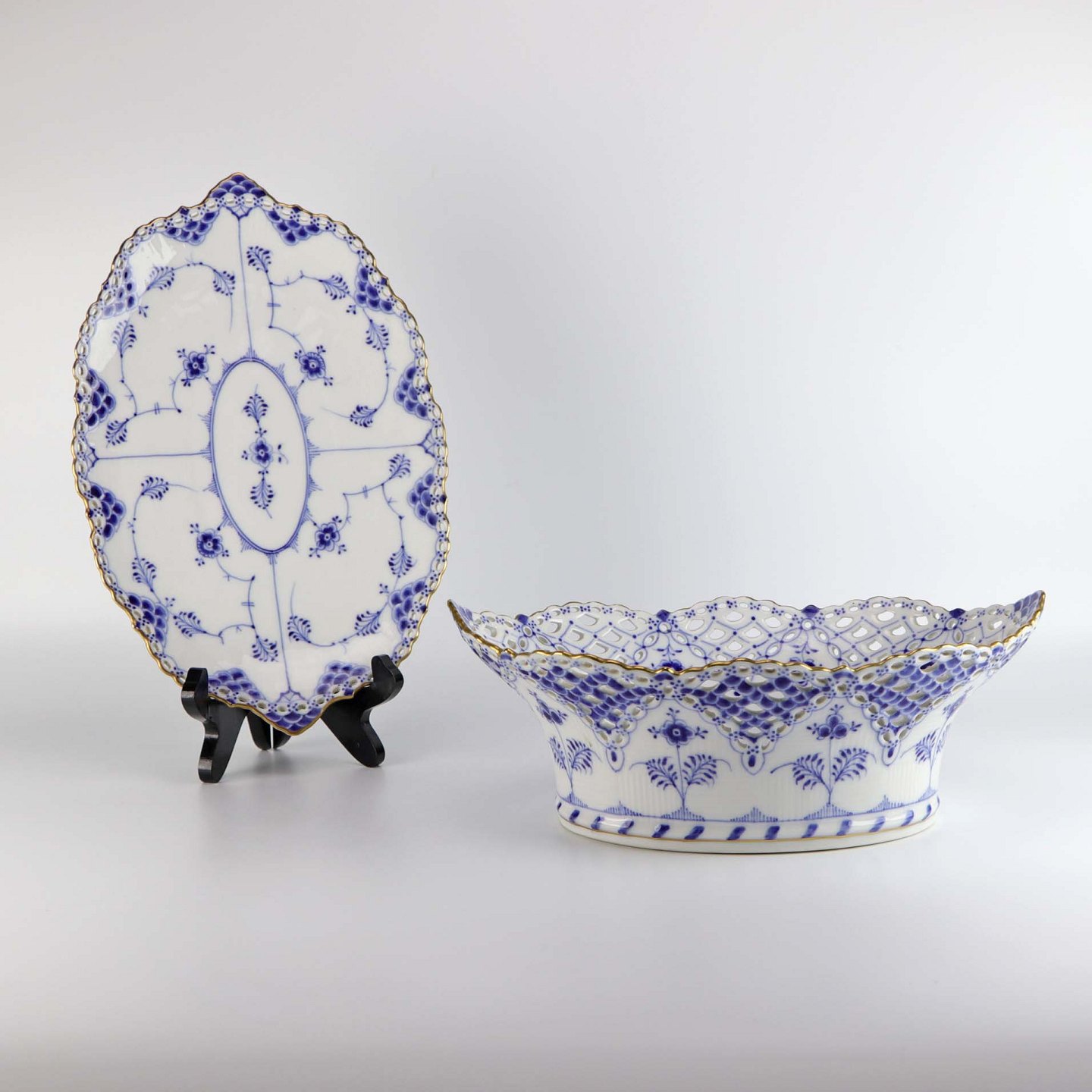 Stellet Musselmalet Helblonde er hvidt porcelæn dekoreret med blå blomster og mønstre. Øverst er porcelænet dekoreret med hulmønster.