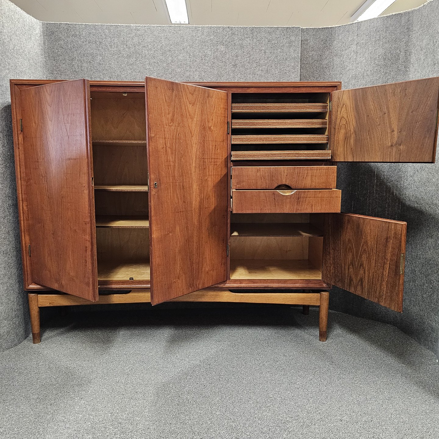 Skænk/kommode/skab af palisander med mange skuffer og hylder. Lågerne kan låses af med de tilhørende nøgler