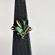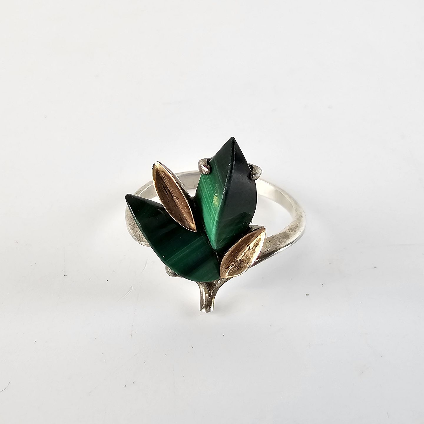 Ring af sølv, med 2 stykker malakit og 2 små blade af forgyldt guld