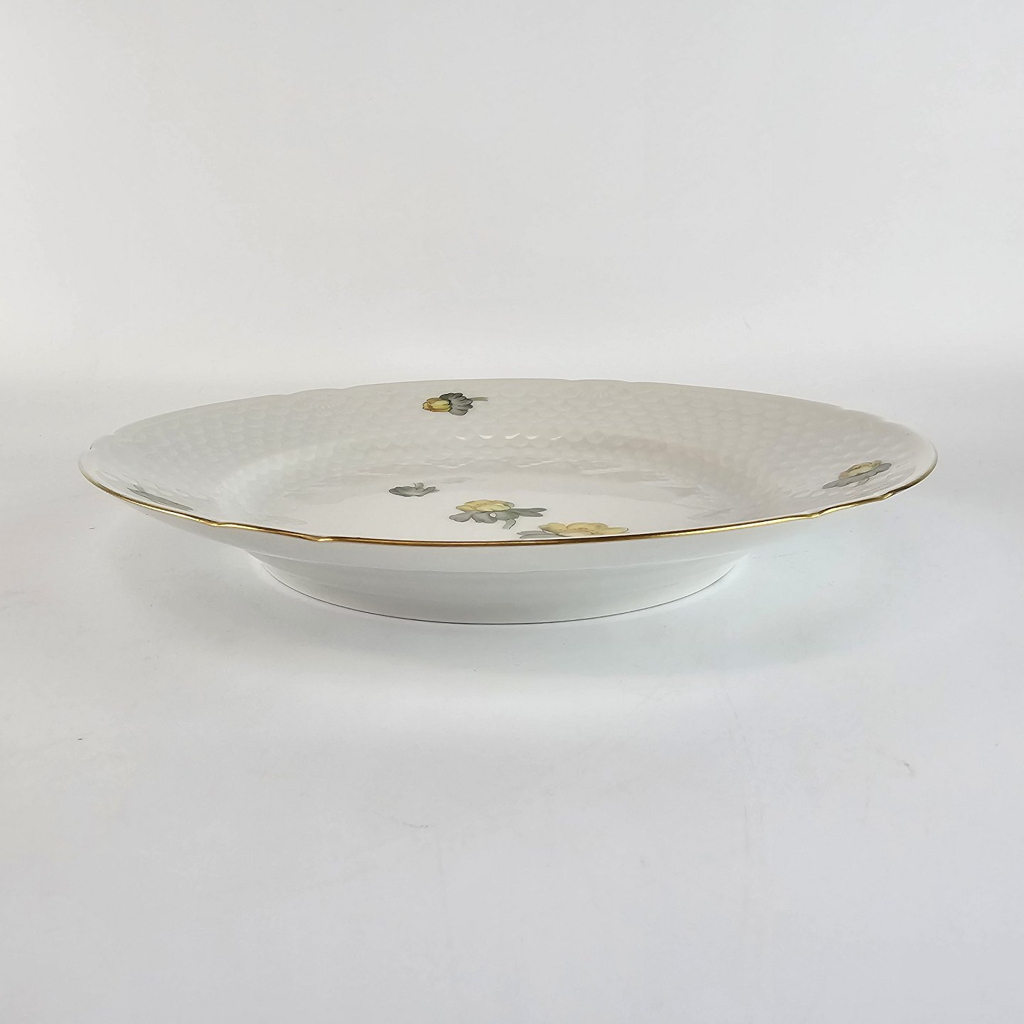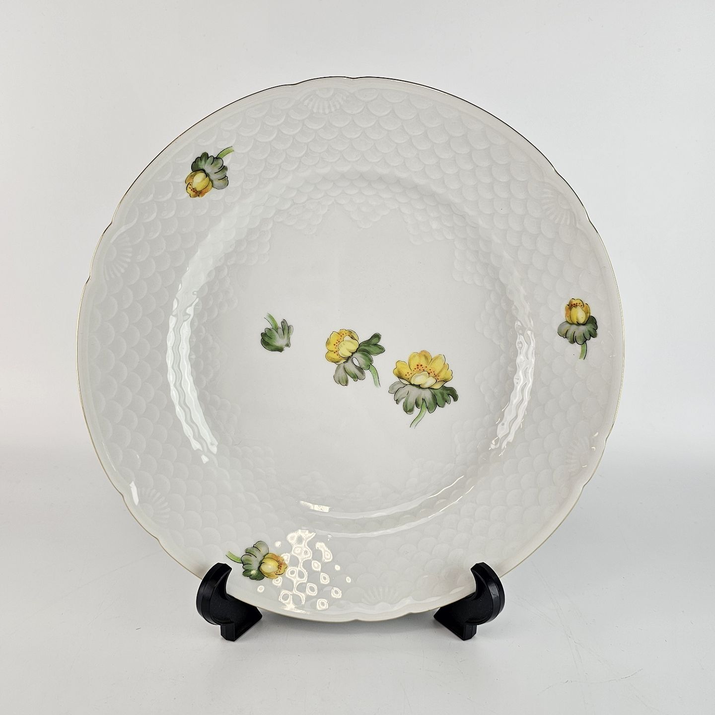 Hvidt porcelæn i skælform med dekoration af gule blomster og guldkant