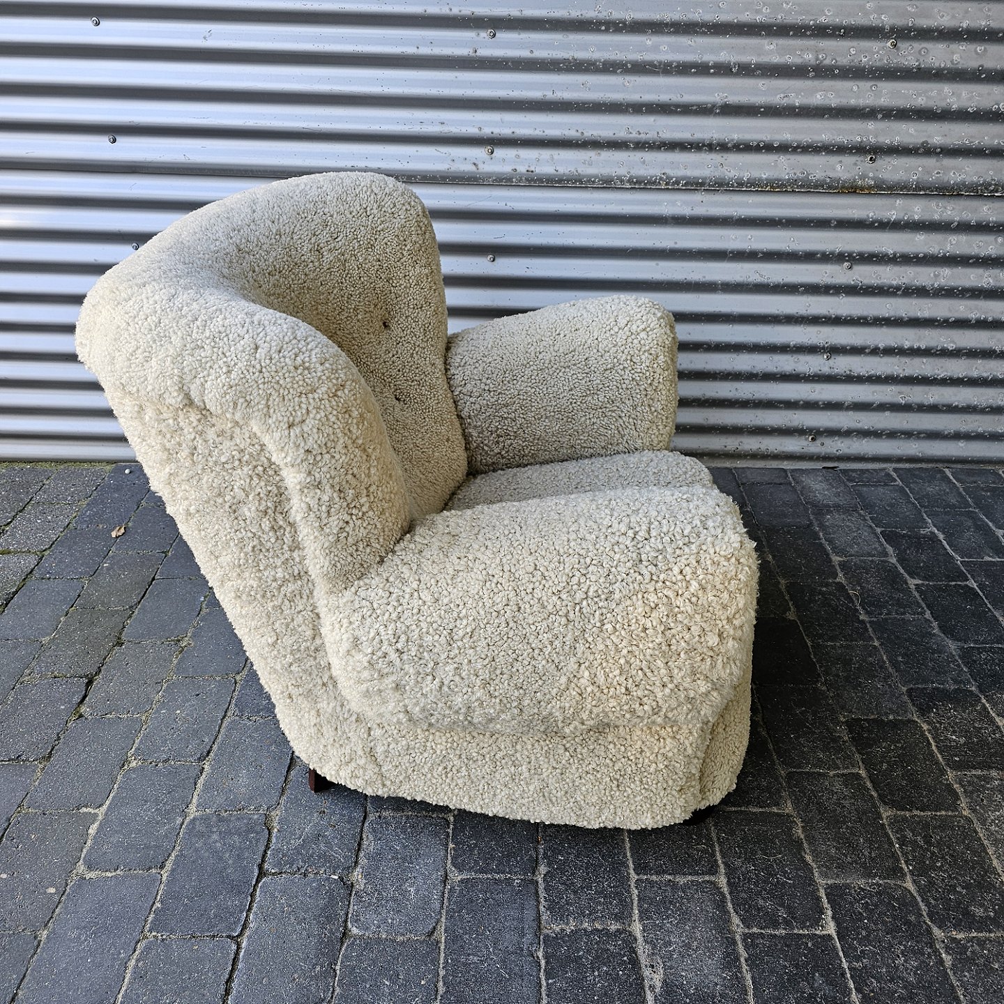Lænestol med høj ryg og armlæn. Sædet er med spiralfjedre og hele stolen er ny-ompolstret. Derudover er bamsestolen ny-ombetrukket med lammeskind. Produceret i 20'erne.