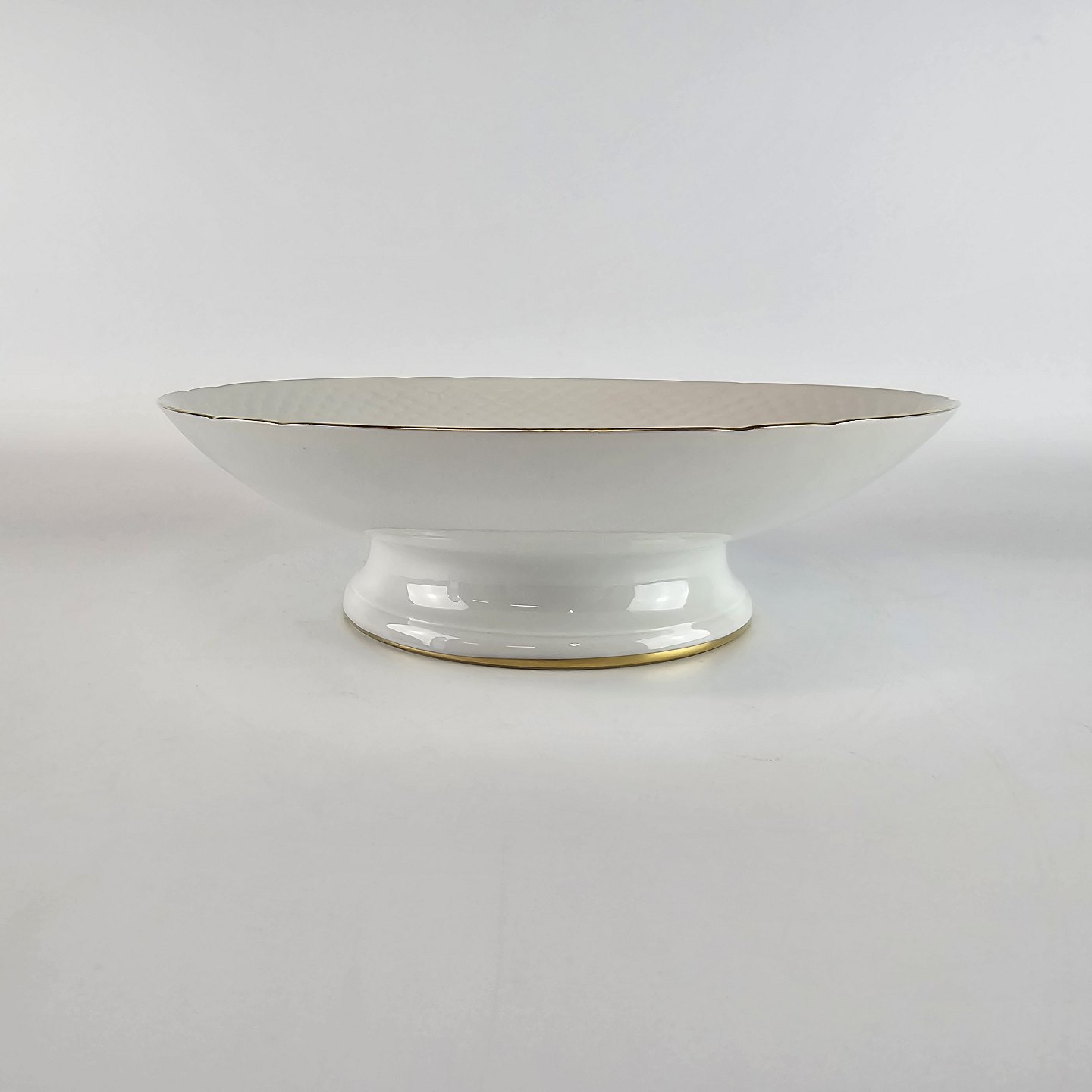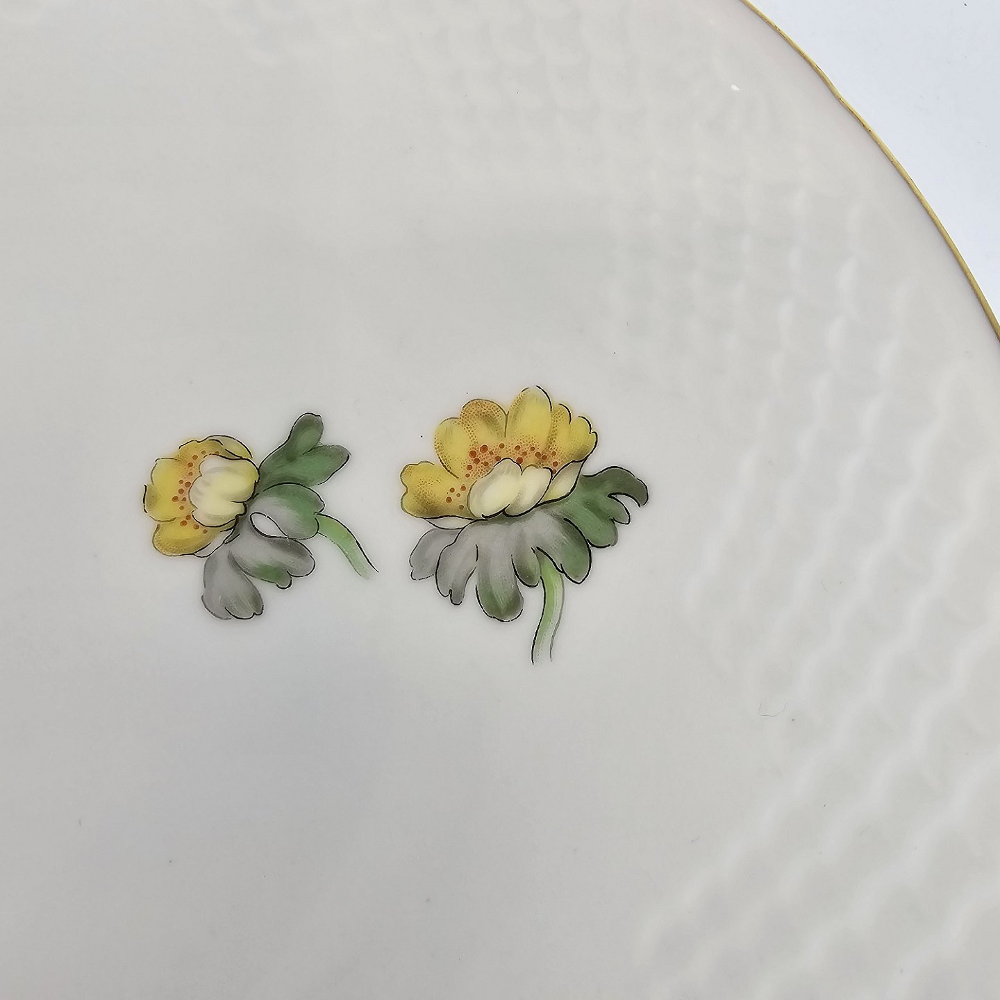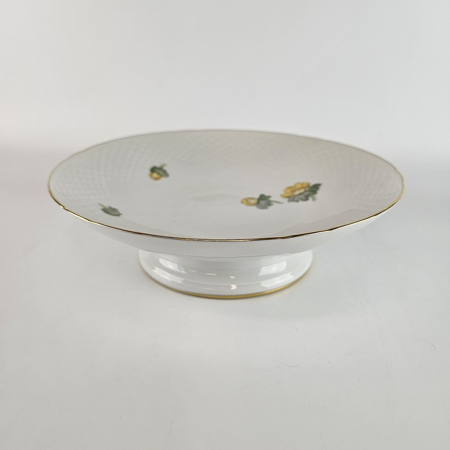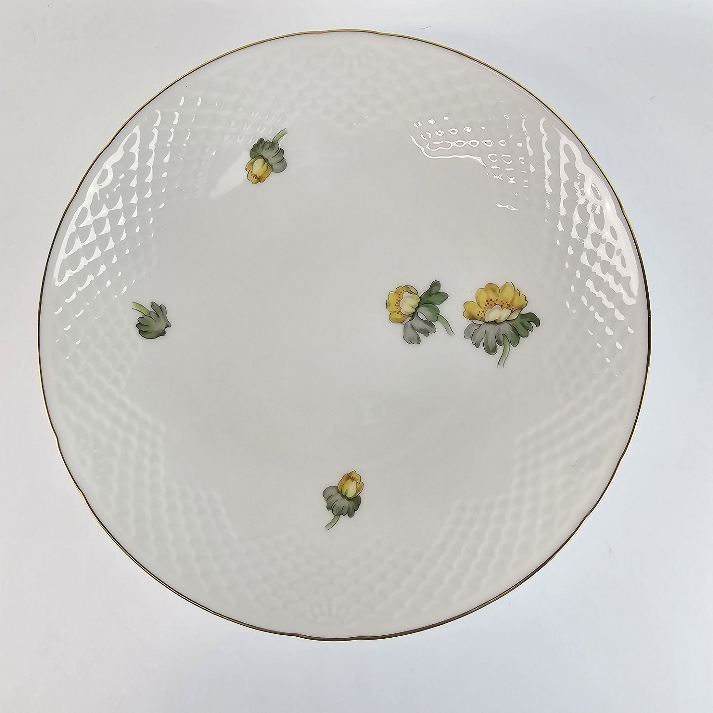 Hvidt porcelæn i skælform med dekoration af gule blomster og guldkant