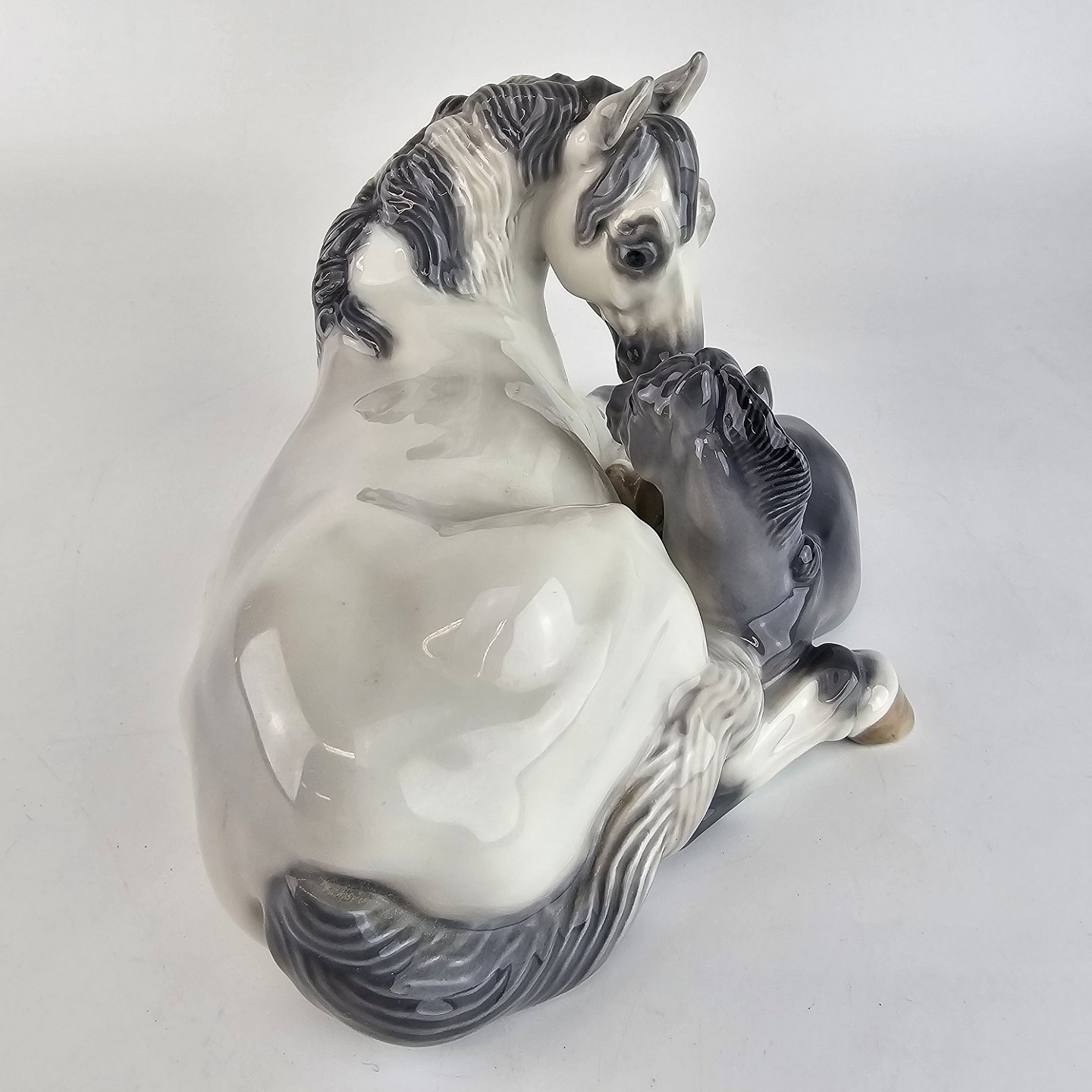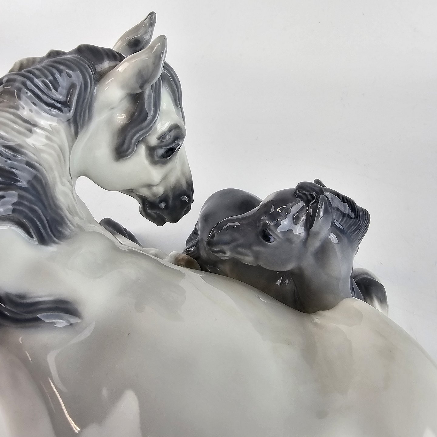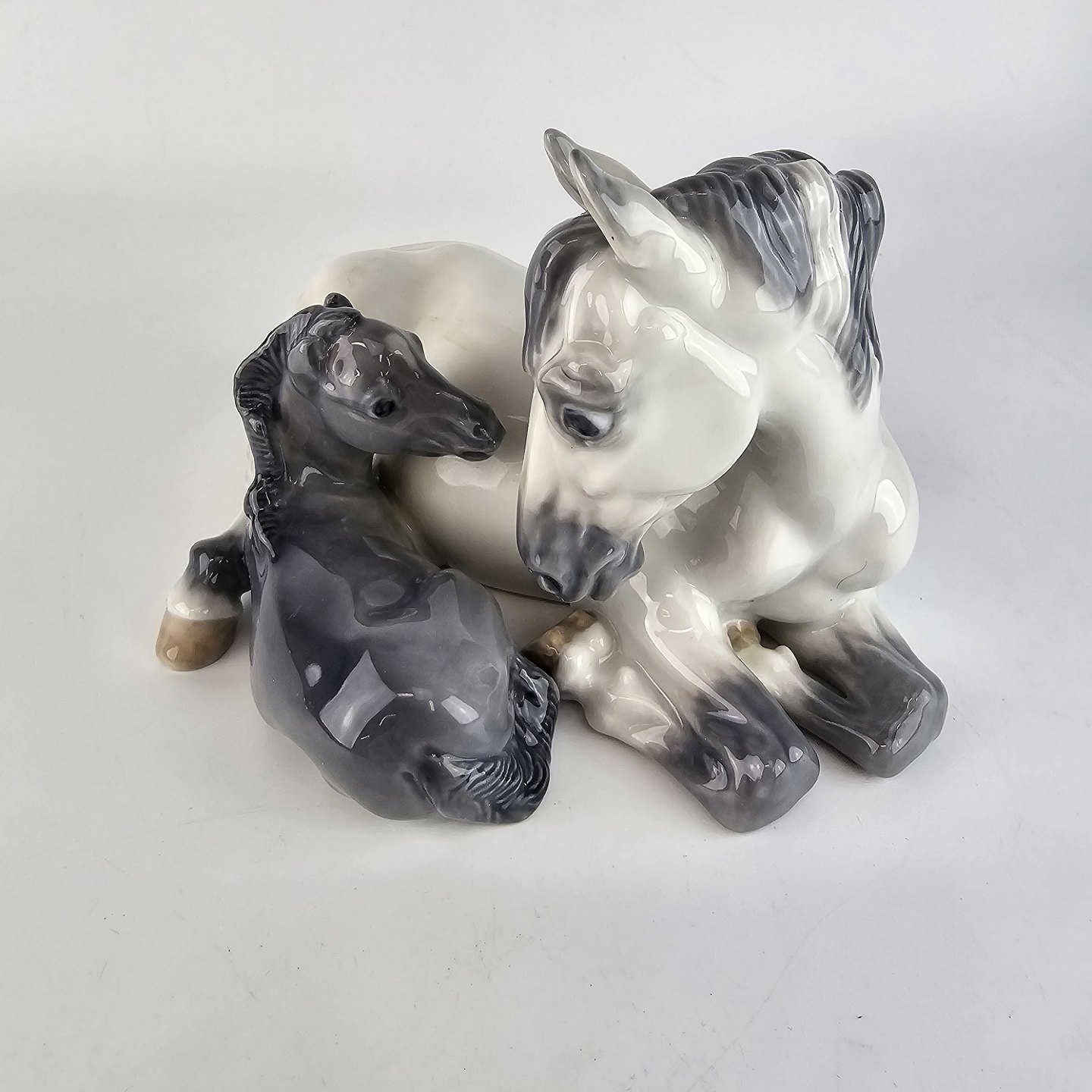 Hvid hest med mørk føl.