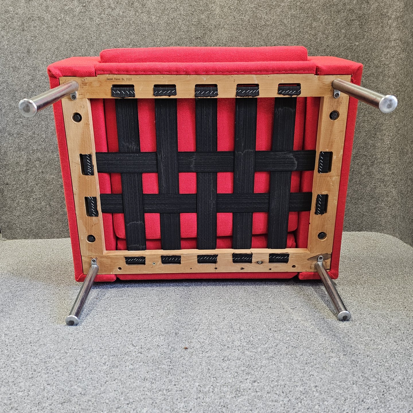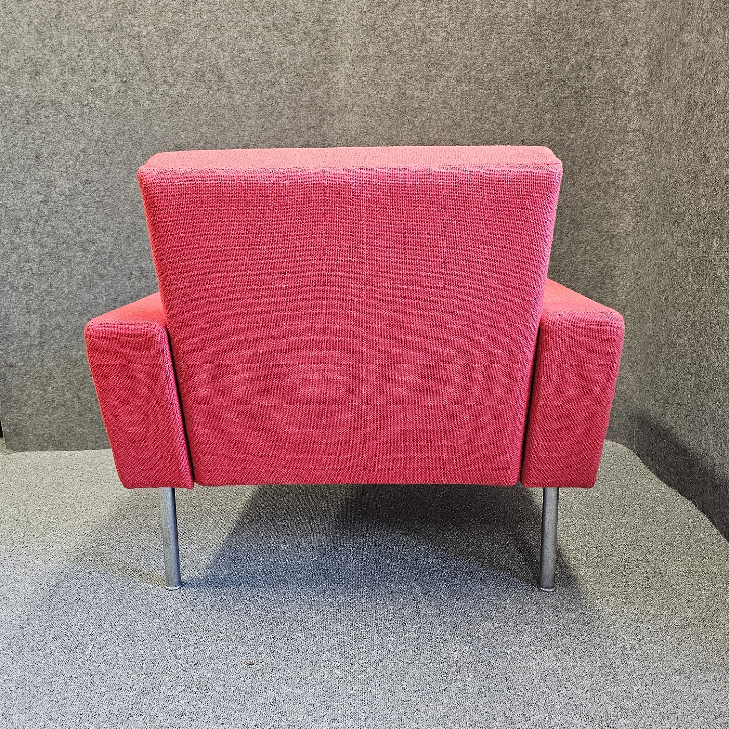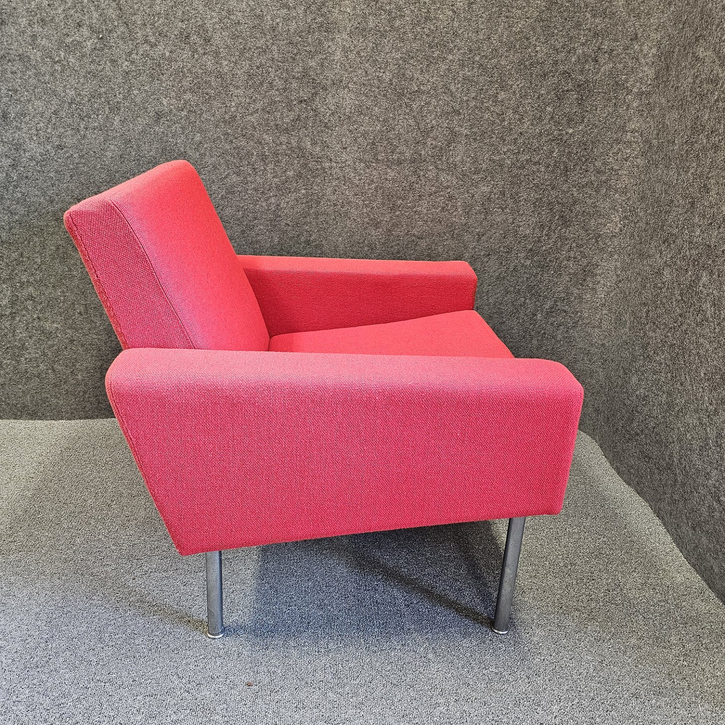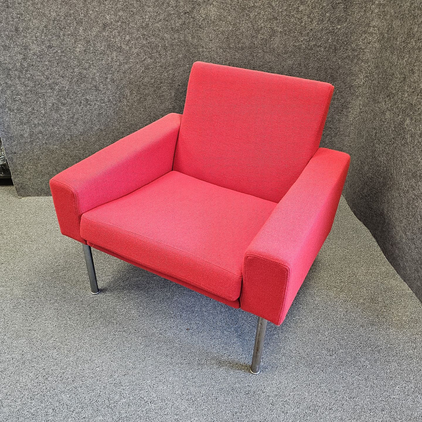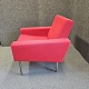 Lænestol model AP 34/1 også kendt som luftshavnsstolen. Stolen er betrukket med rødt uldstof samt har ben af metal.