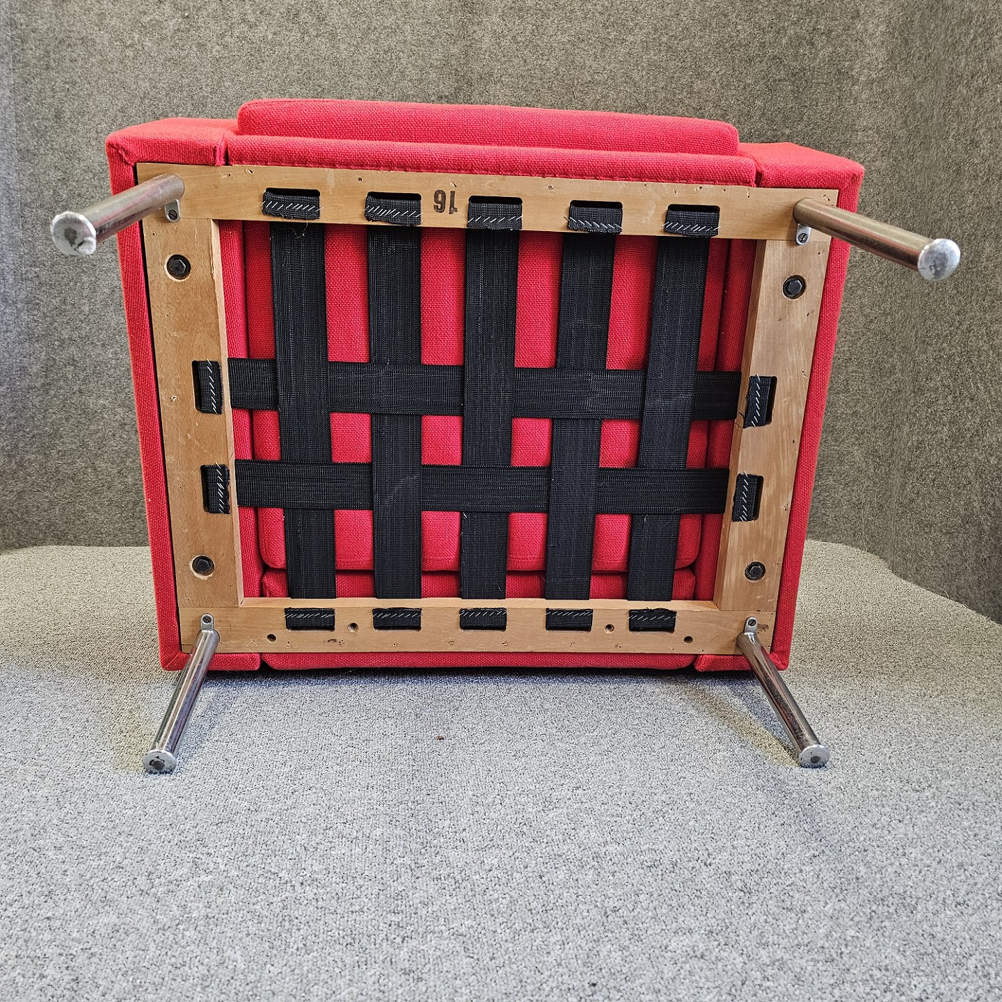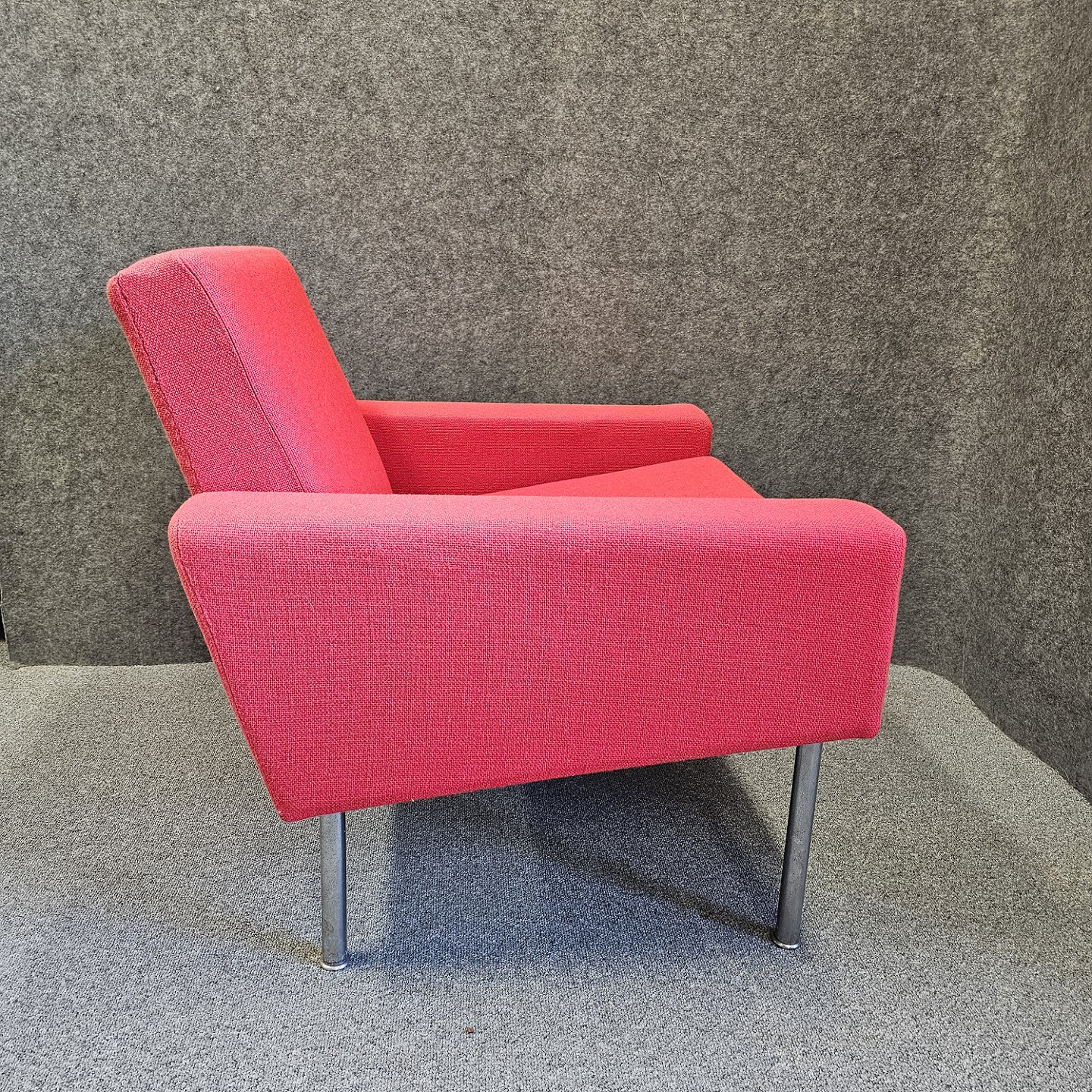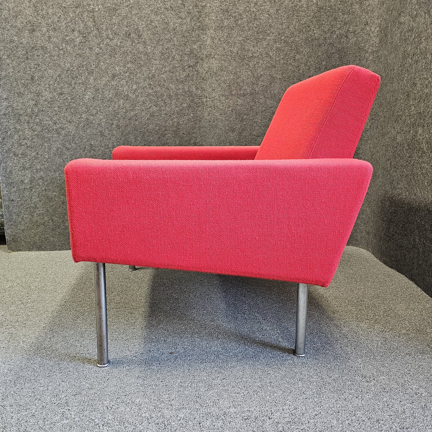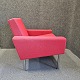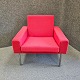Lænestol model AP 34/1 også kendt som luftshavnsstolen. Stolen er betrukket med rødt uldstof samt har ben af metal.