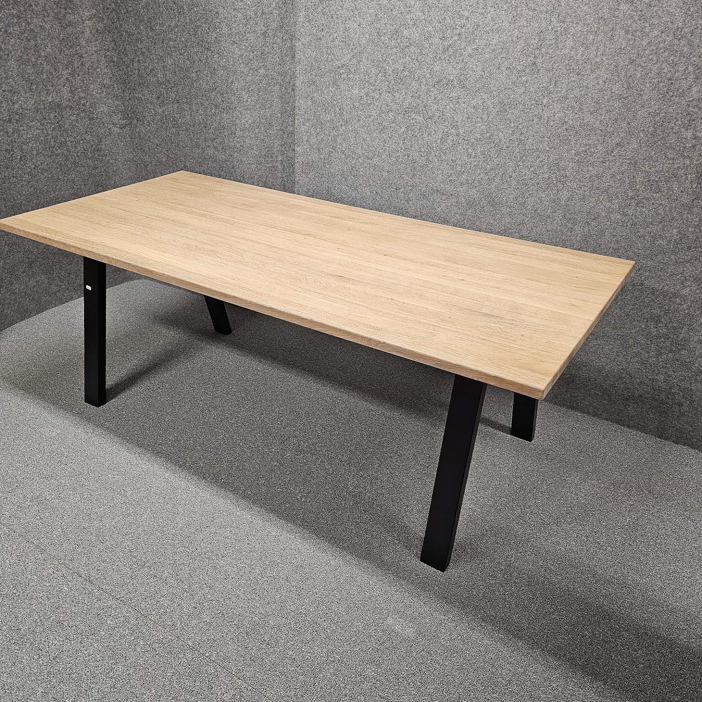 Hvidolieret egetræsbord med sort stålstel. Kan forlænges med 2 medfølgende plader. Snedkerfremstillet