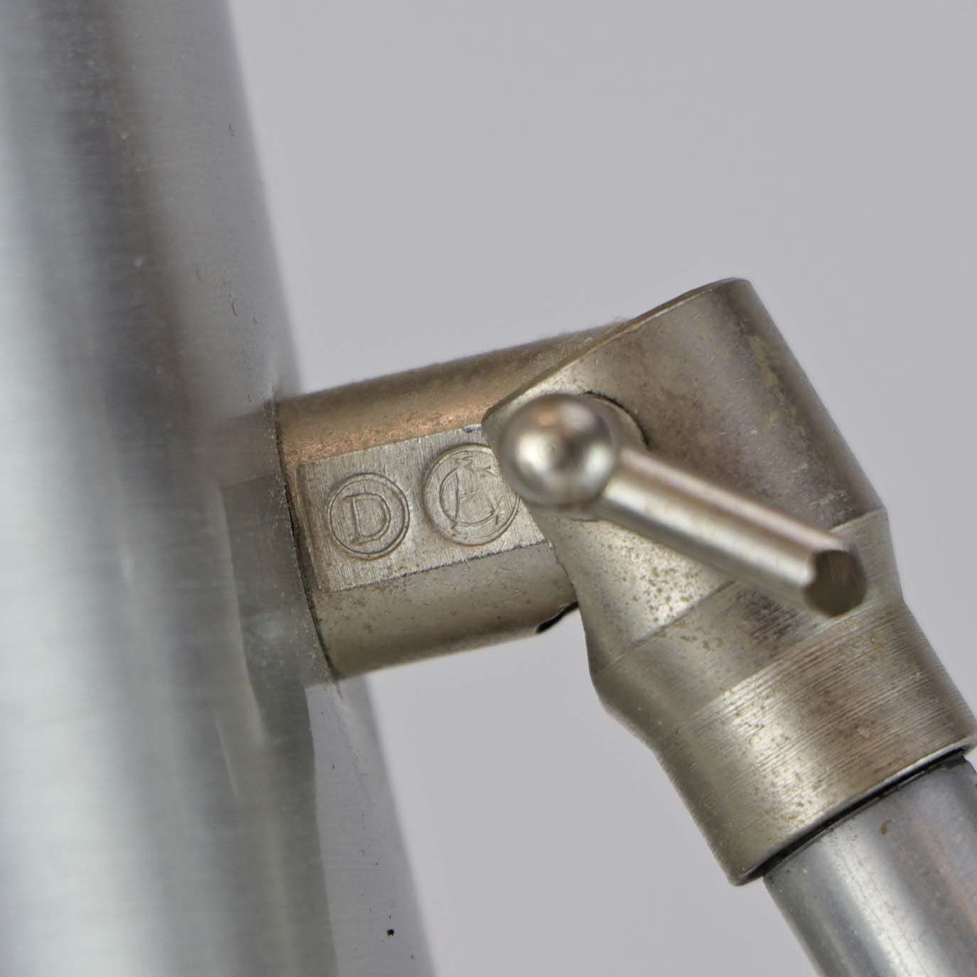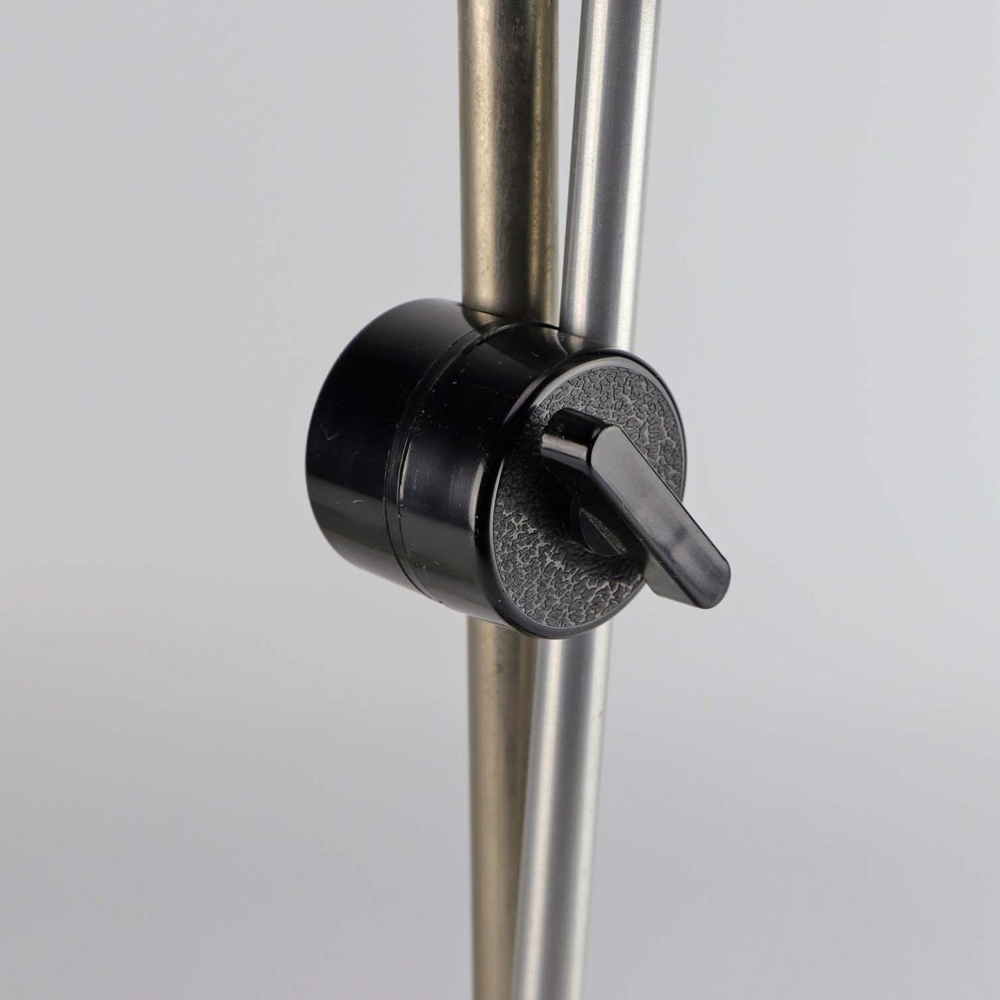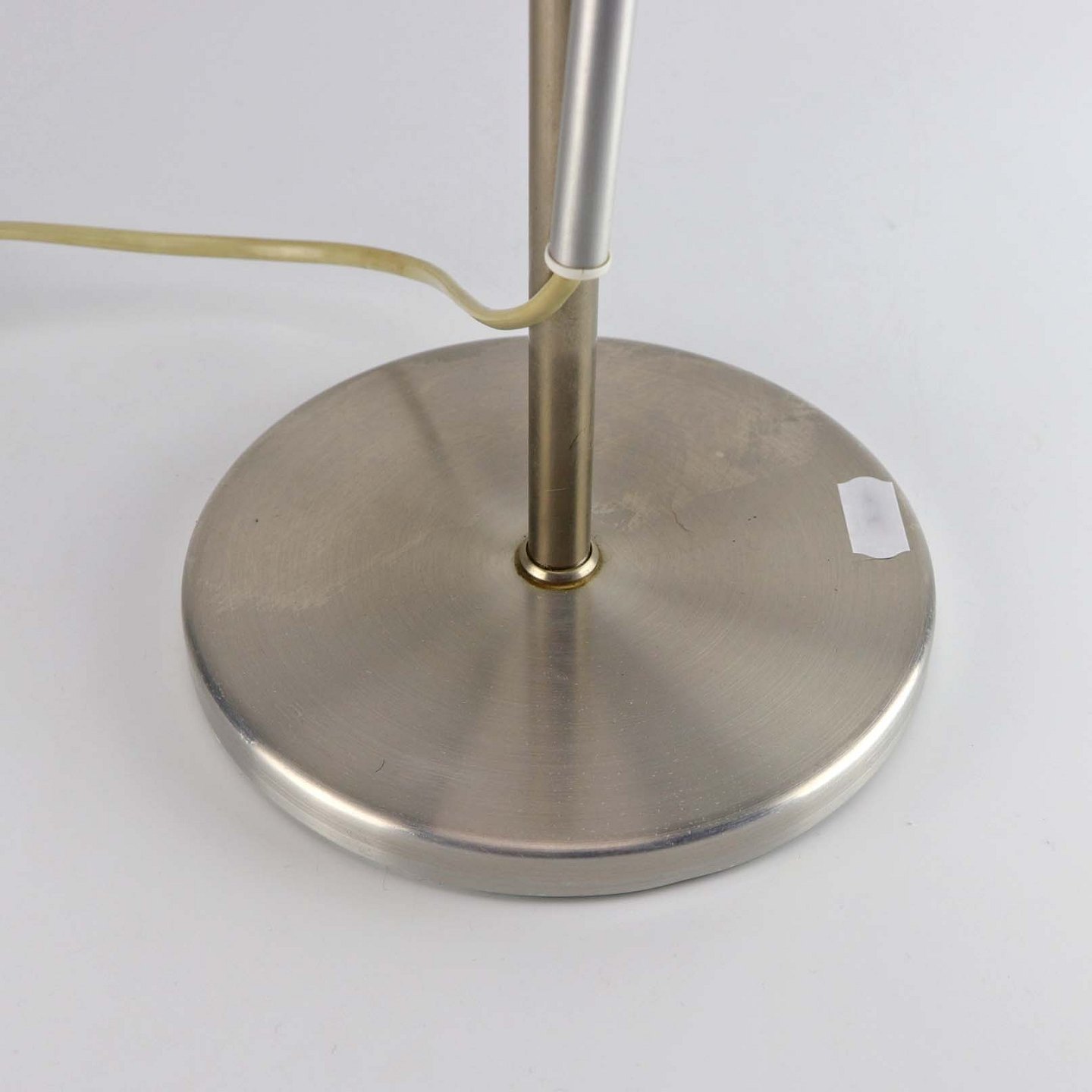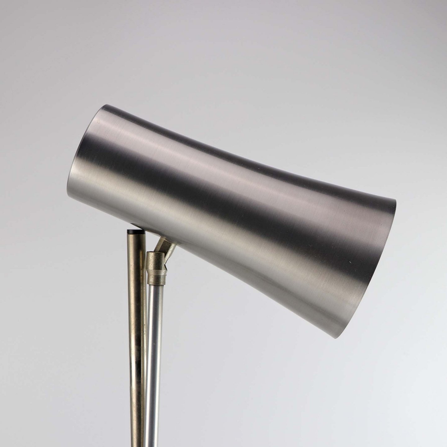 Skrivebordslampe med fod i stål og skærm i aluminium. Lampen og skærmen kan reguleres i højde og lysvinkel