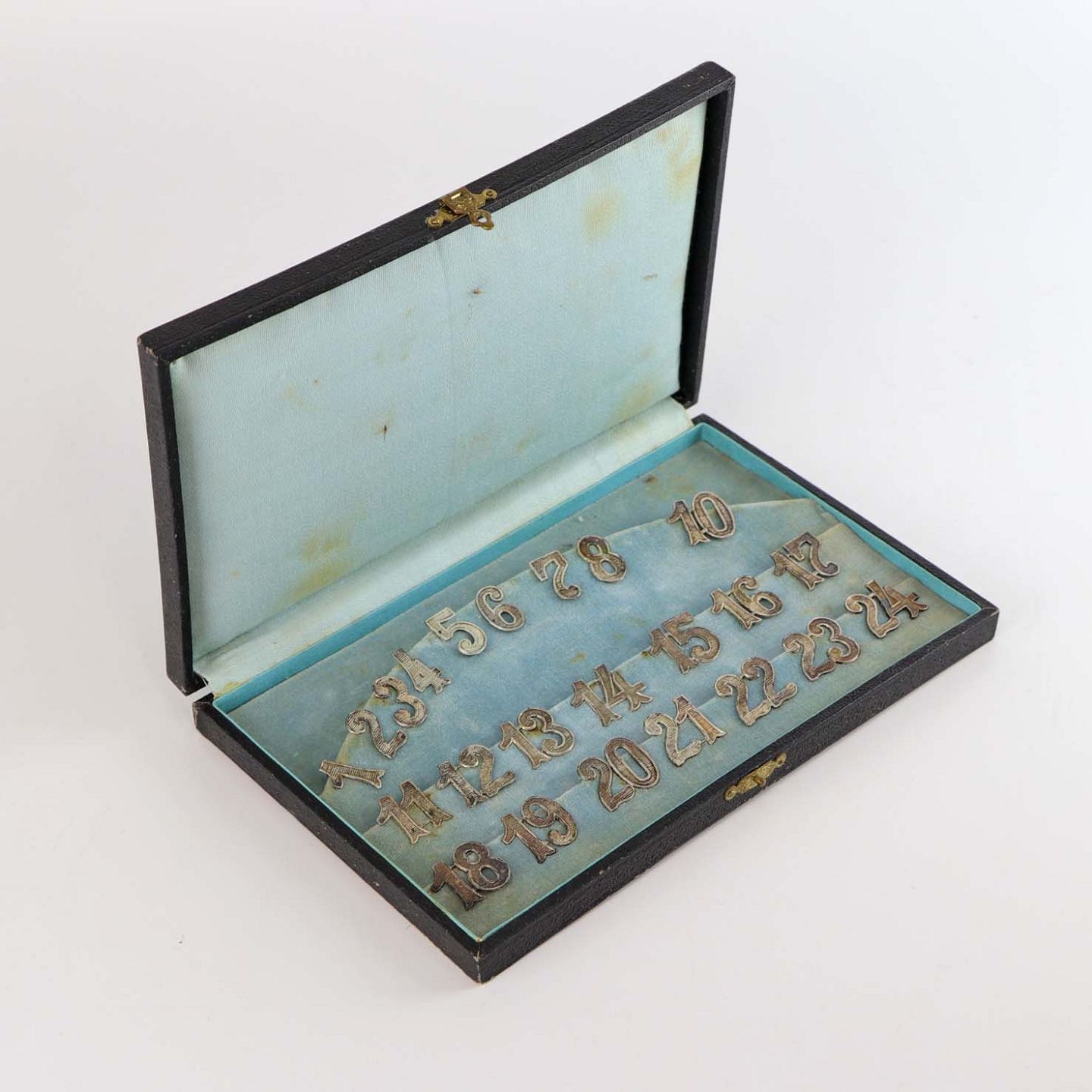 Æske med tal fra 1 til 24 i sølv. Tallet 9 mangler. Disse kan eksempelvis anvendes i forbindelse med julens pakkekalender.