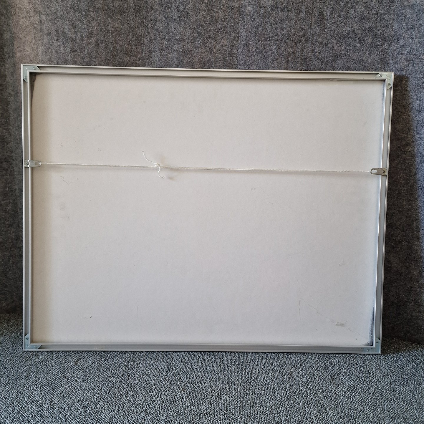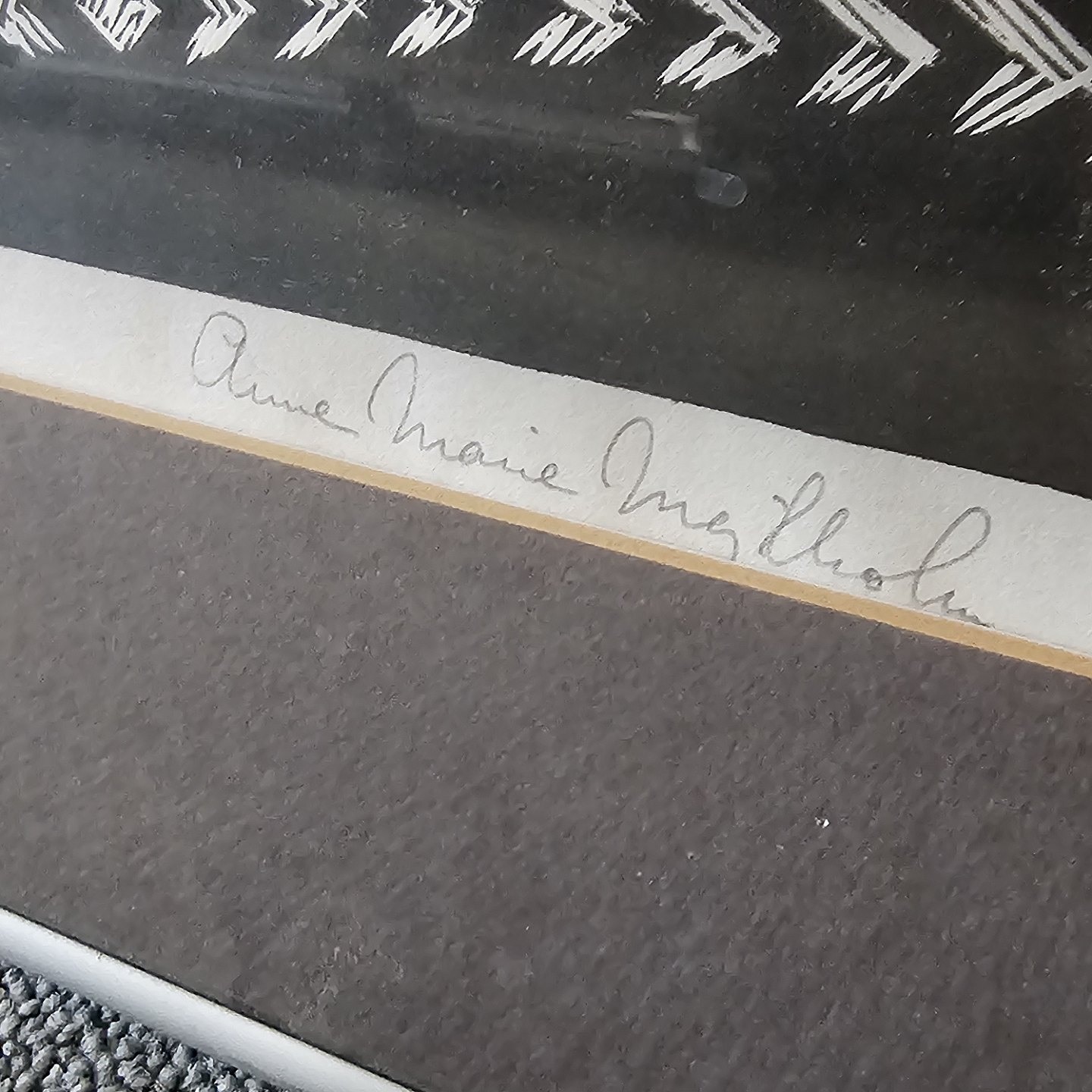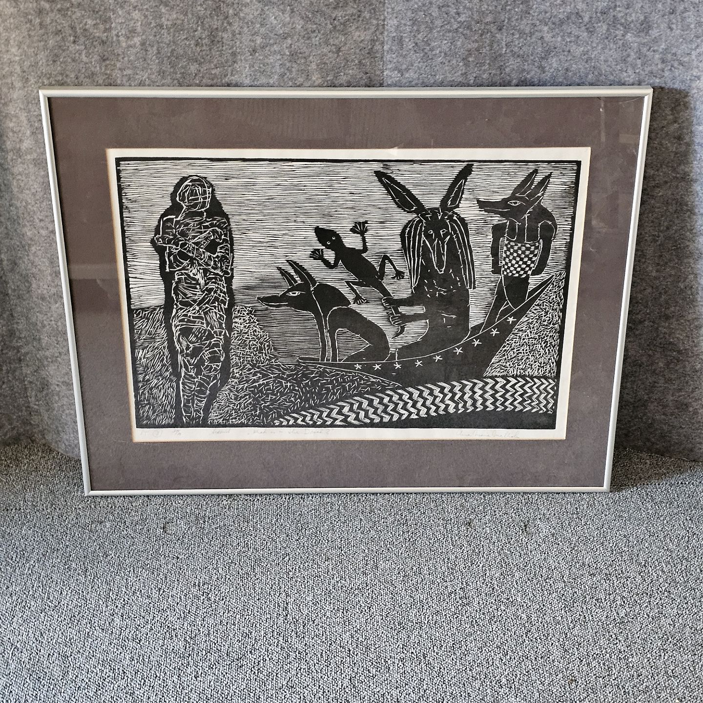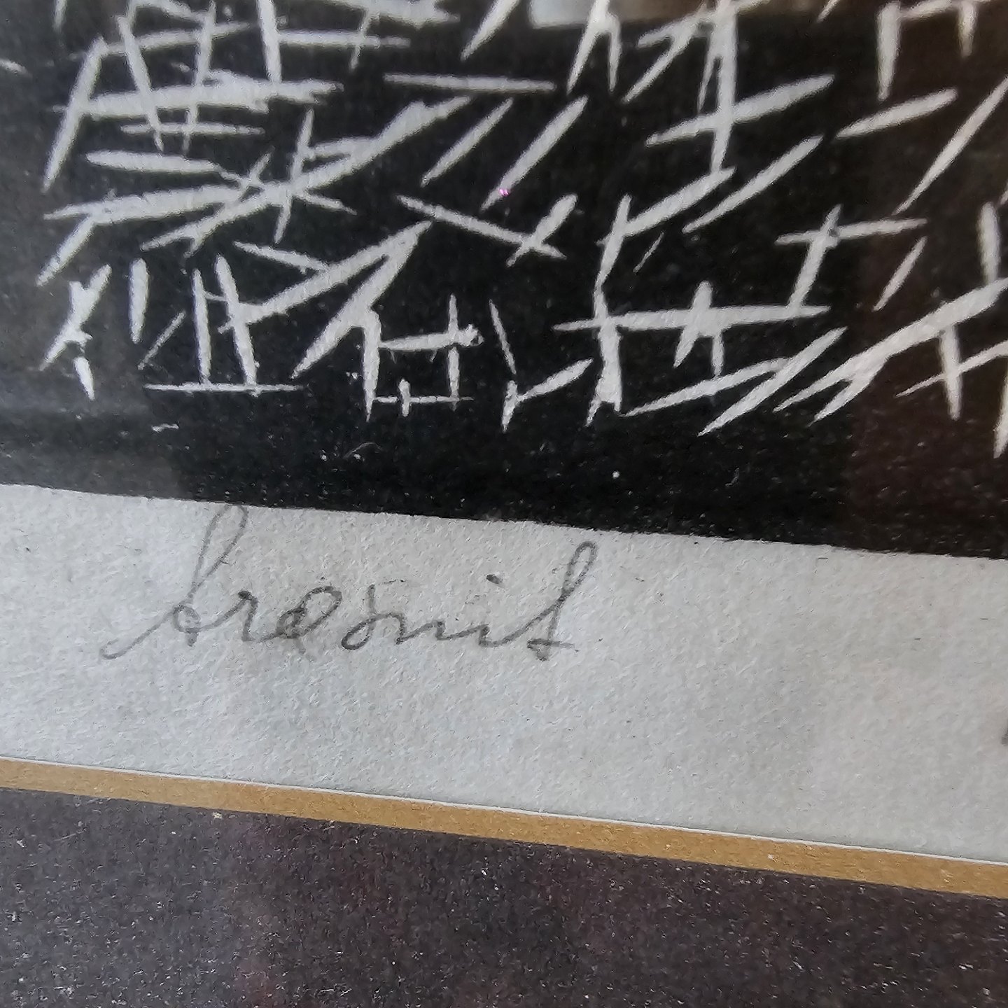 Indrammet træsnit med sort passepartout i aluminiumsramme med titlen What is in the dark 2 nr. 37/73