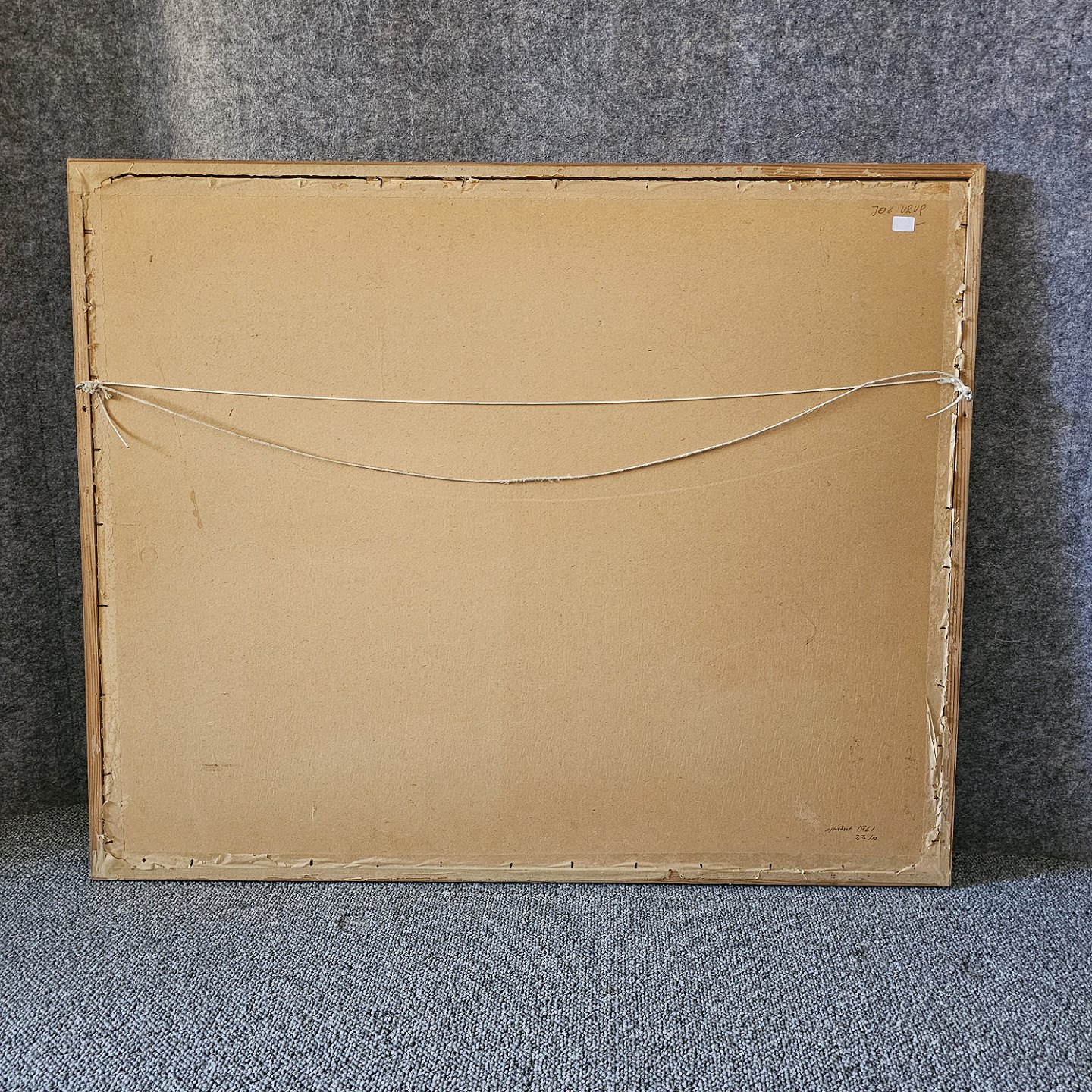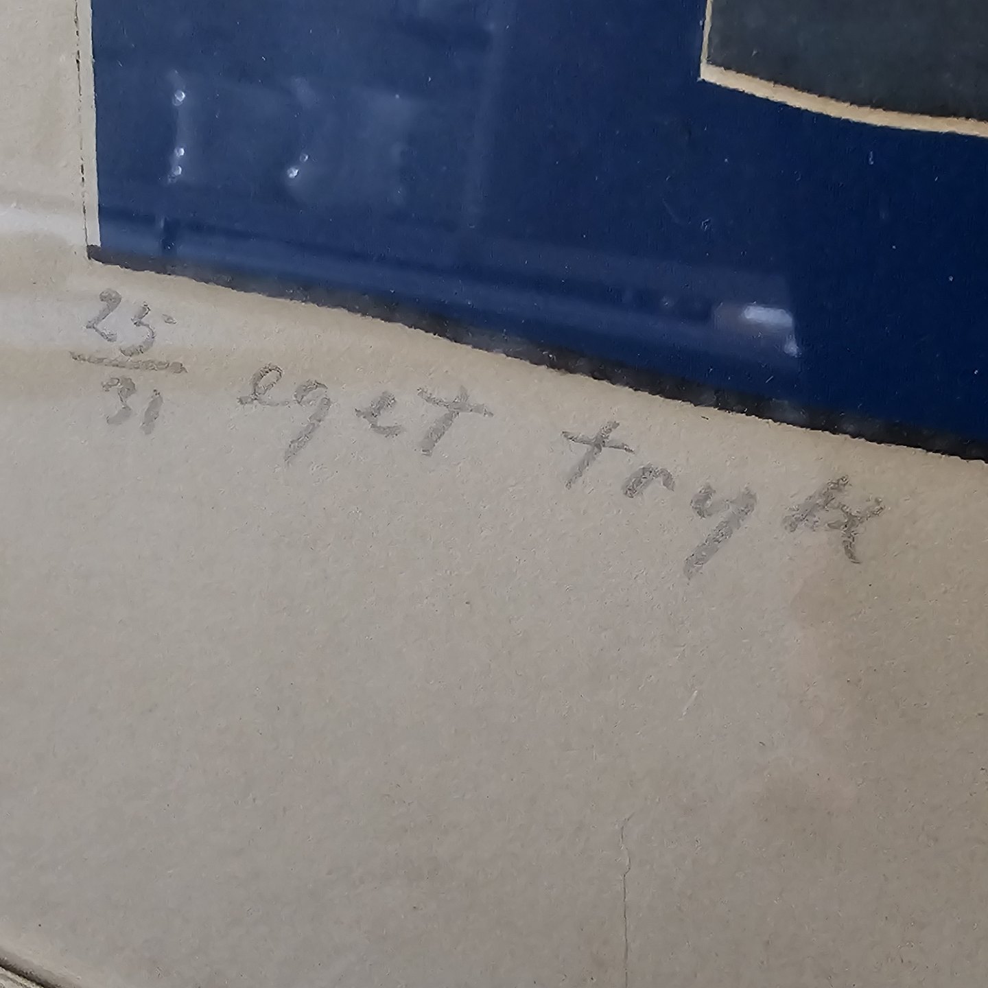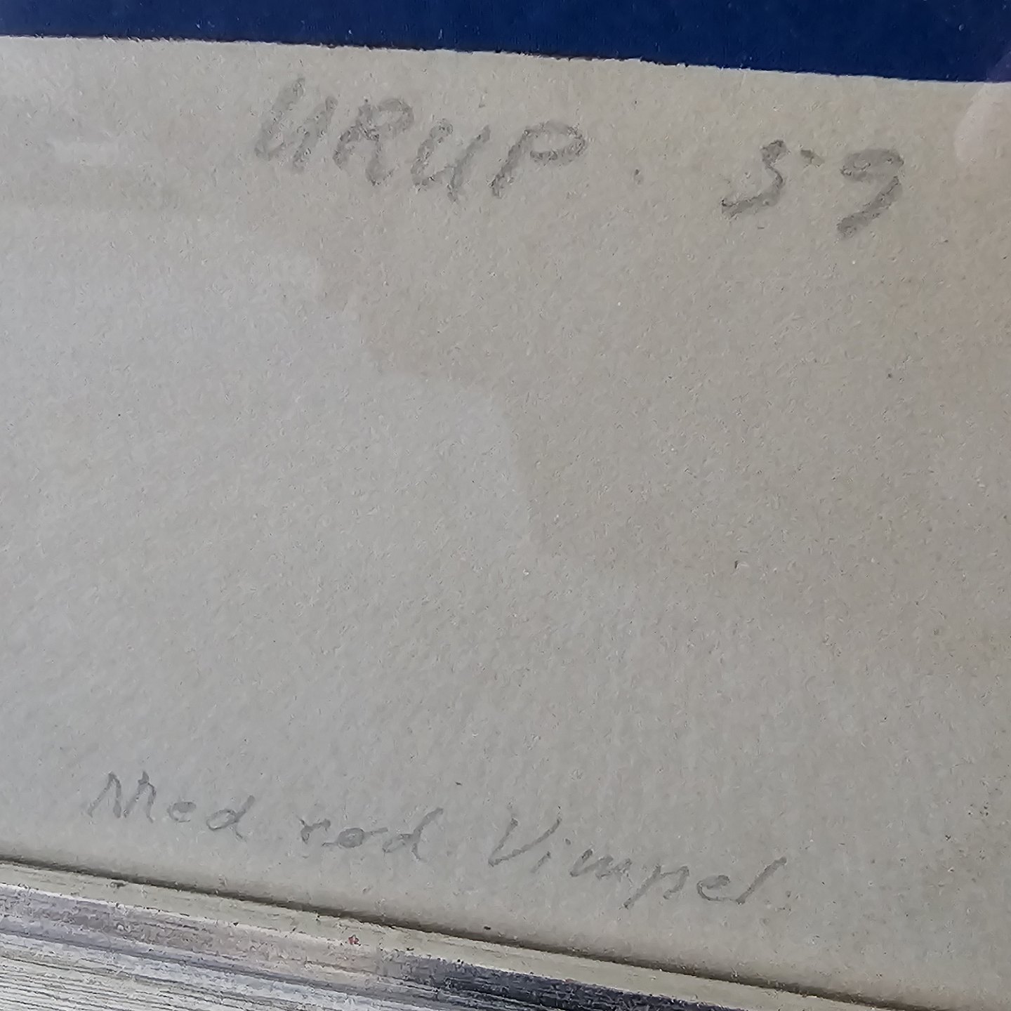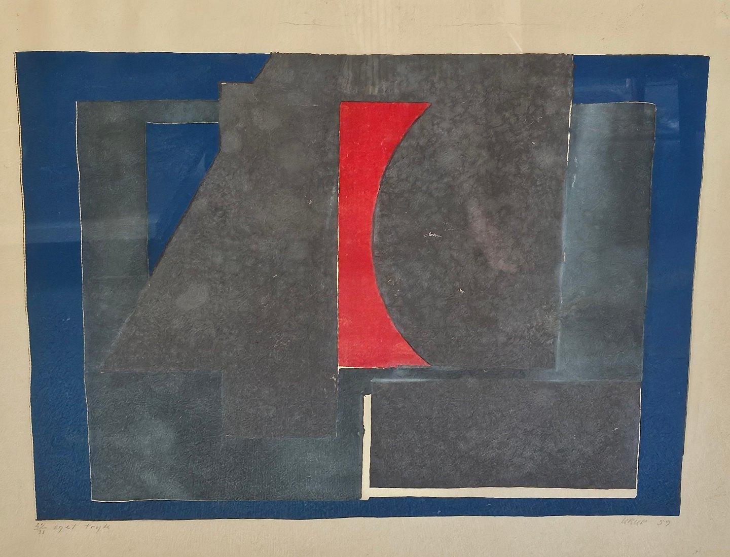 Indrammet Abstrakt litorgrafi i aluminiumramme med titlen Med rød vimpel. Trykket er i med grå, blå og rød farve nr. 25/31, eget tryk.