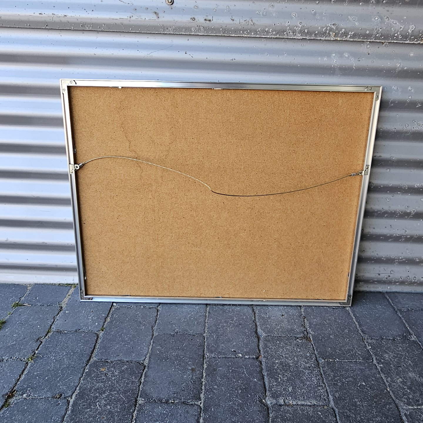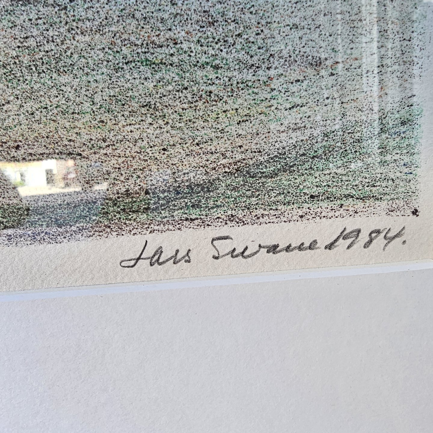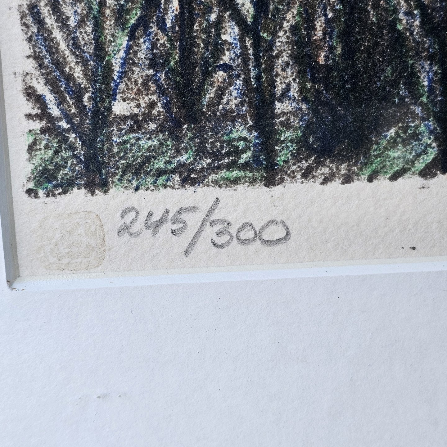 Indrammet litografi med passepartout i aluminiumsramme med landskabsmotiv af naturlig læhegn med udsigt over marker og gård nr. 245/300
