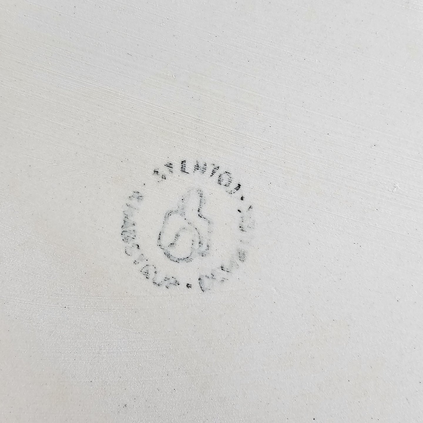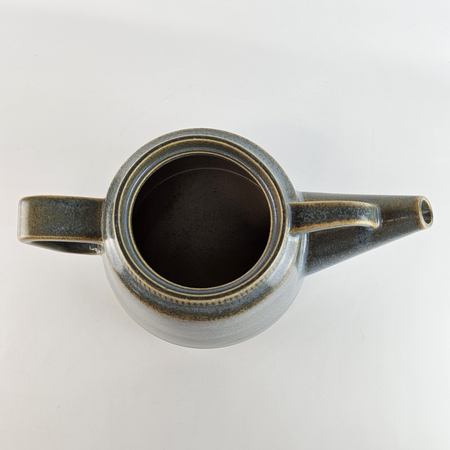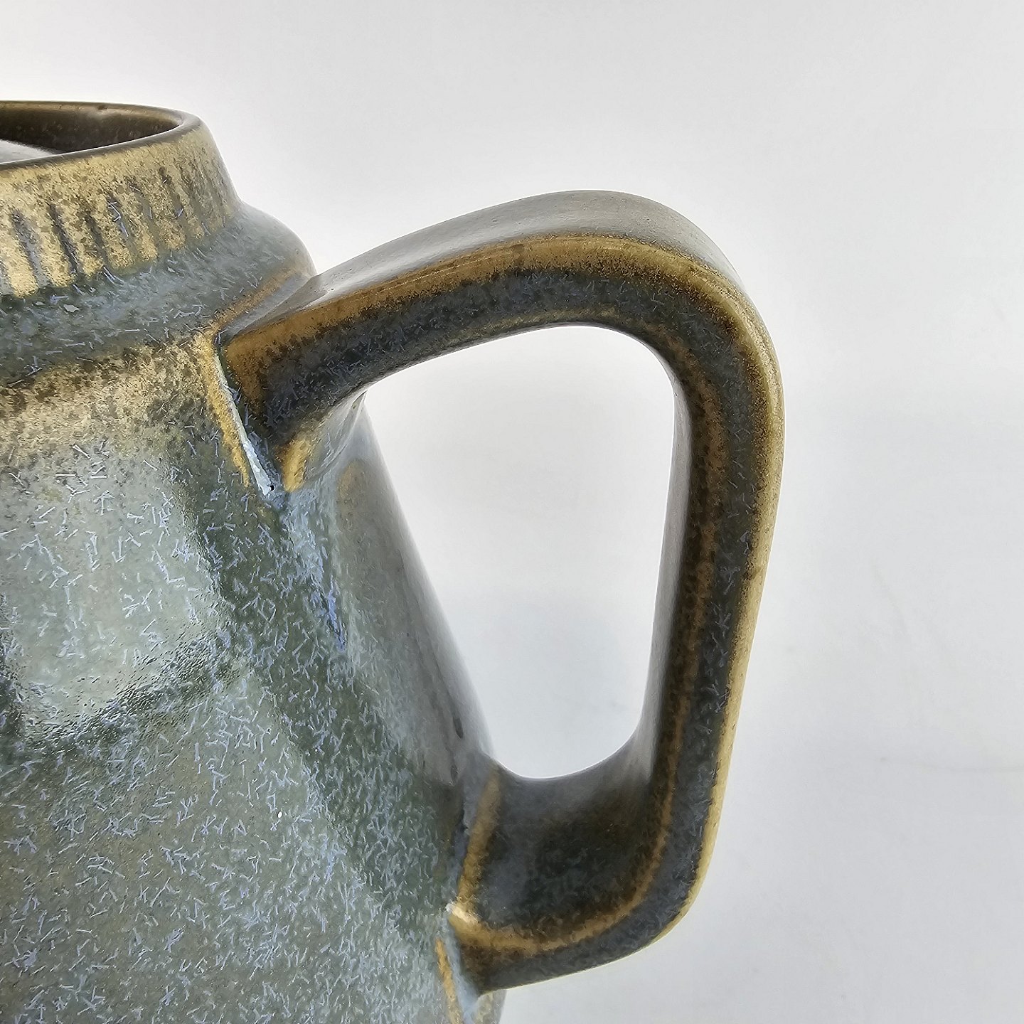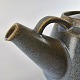 Tekande af stentøj og dekoreret med en grønlig nuancefarvet glasering.