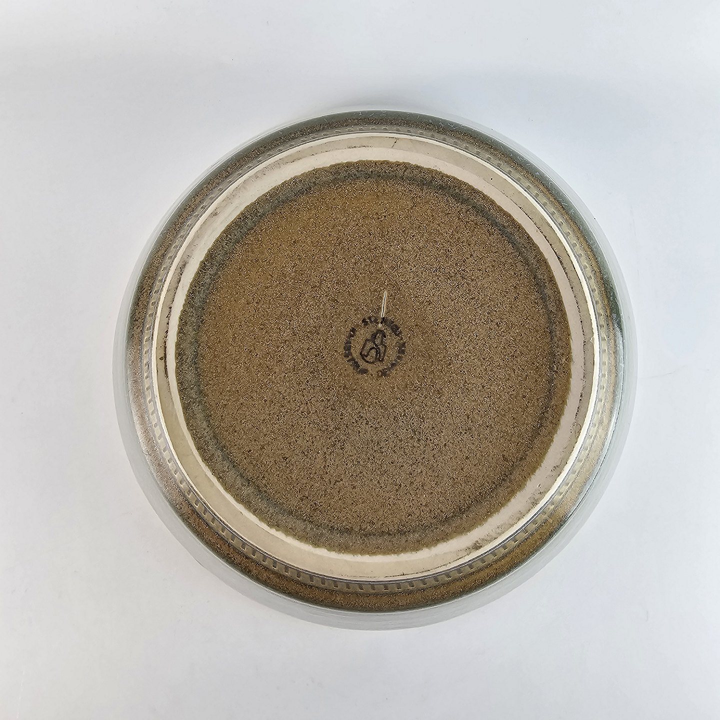 Skål af stentøj og dekoreret med en grønlig nuancefarvet glasering.
