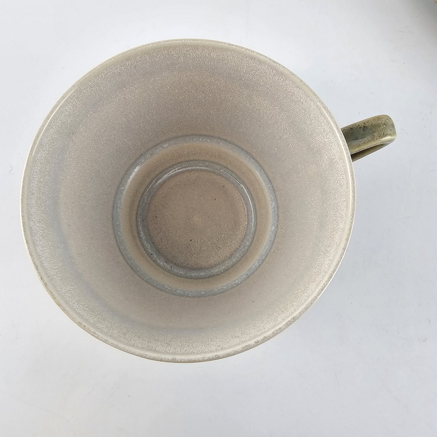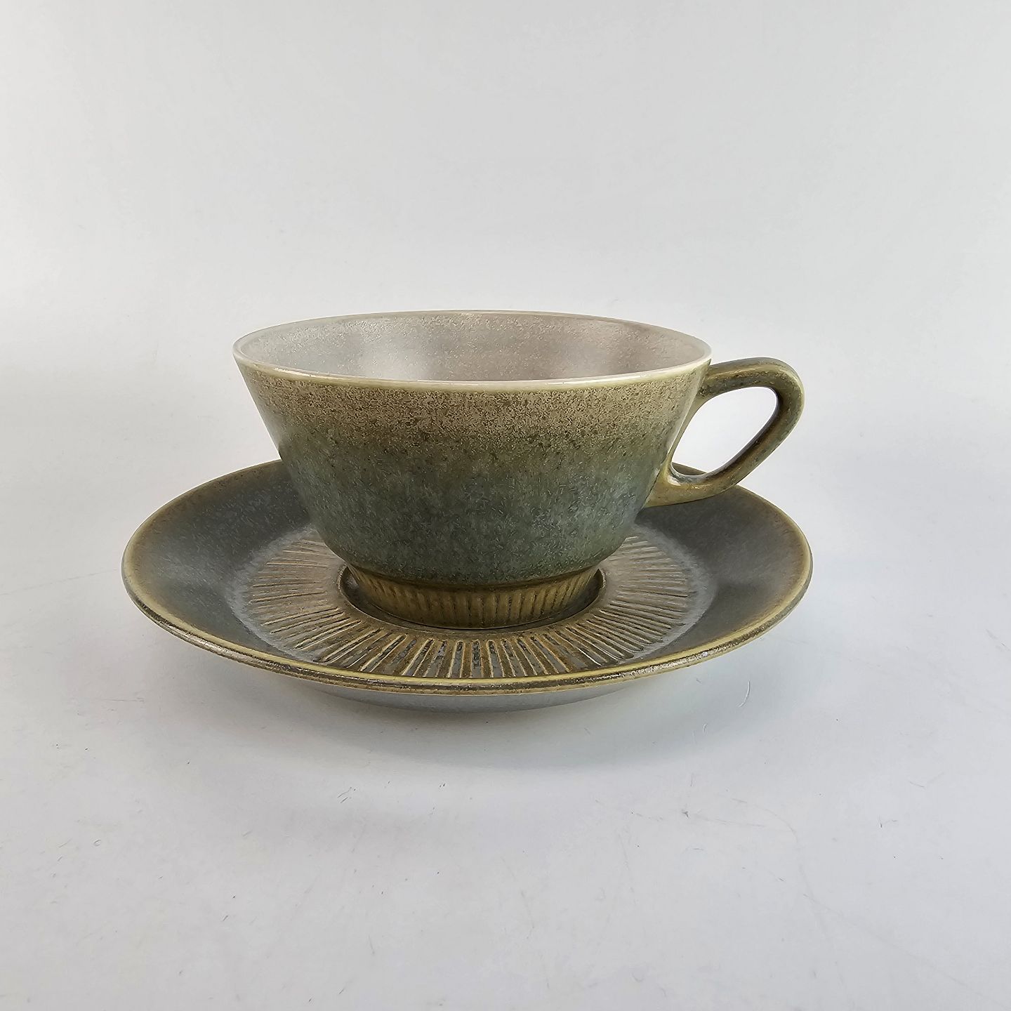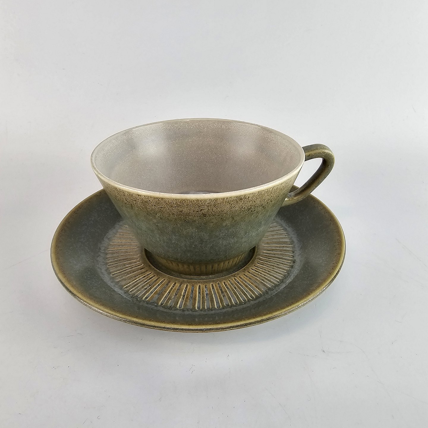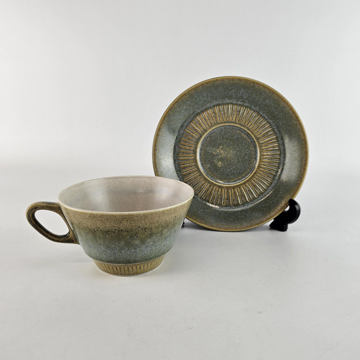 Tekop og underkop af stentøj og dekoreret med en grøn nuance farvet glasering. Fra serien Knabstrup - ofte kaldet Grøn Nøddebo