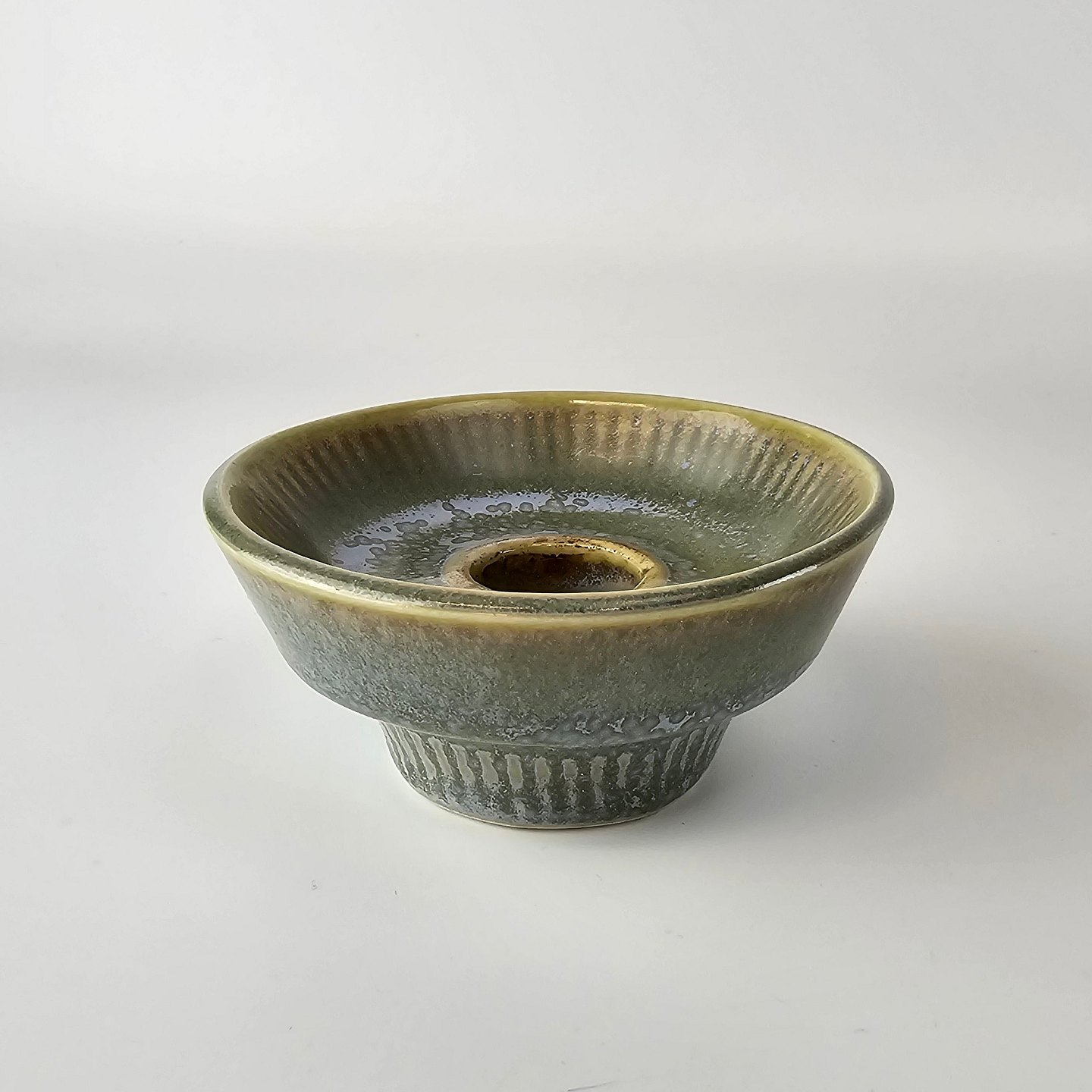 Lysstage af stentøj og dekoreret med en grønlig nuancefarvet glasering.